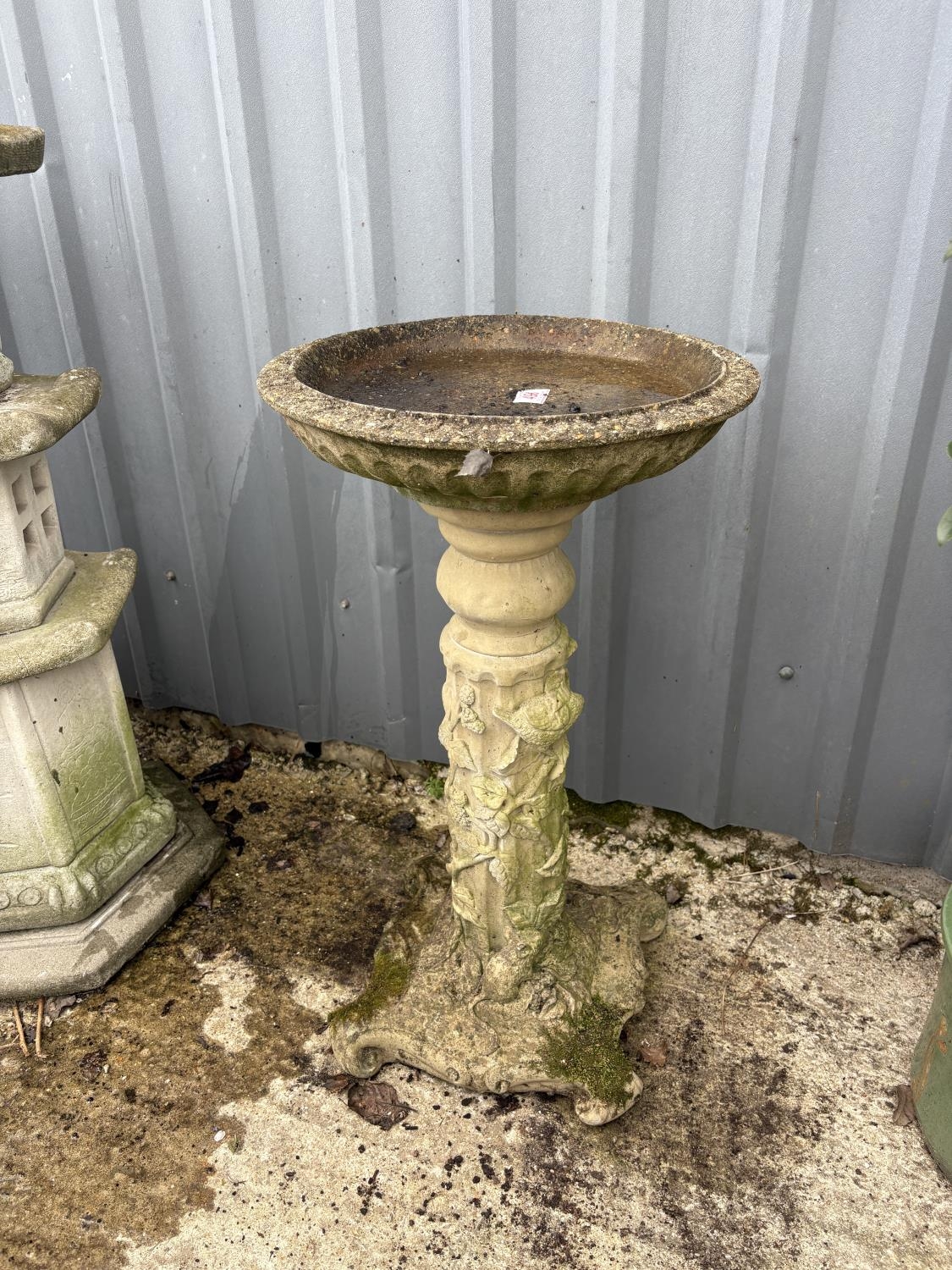 An ornate concrete pedestal bird bath, height 75 cms, diameter 40 cms