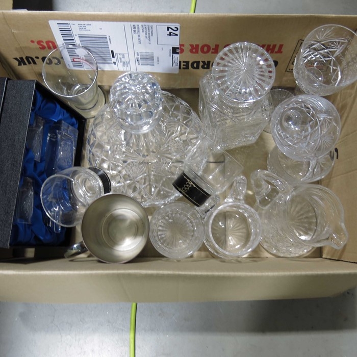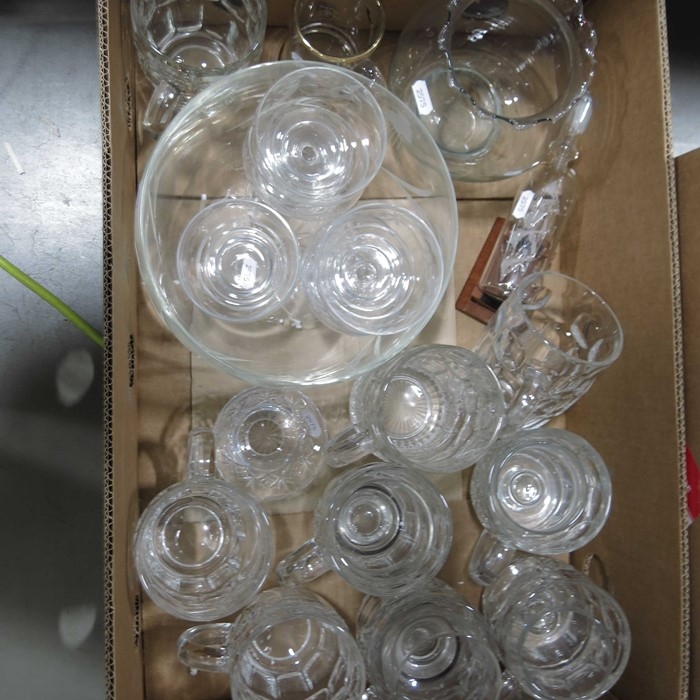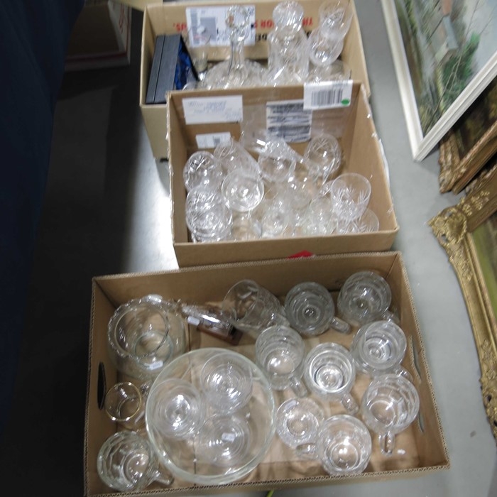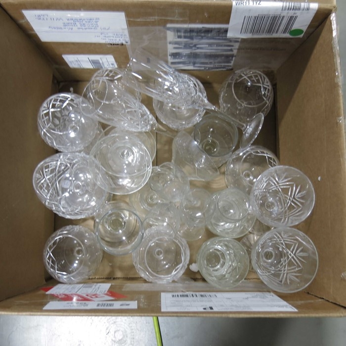 Sundry glassware to include drinking glasses, ship's decanter, and dessert sets. (3 boxes)