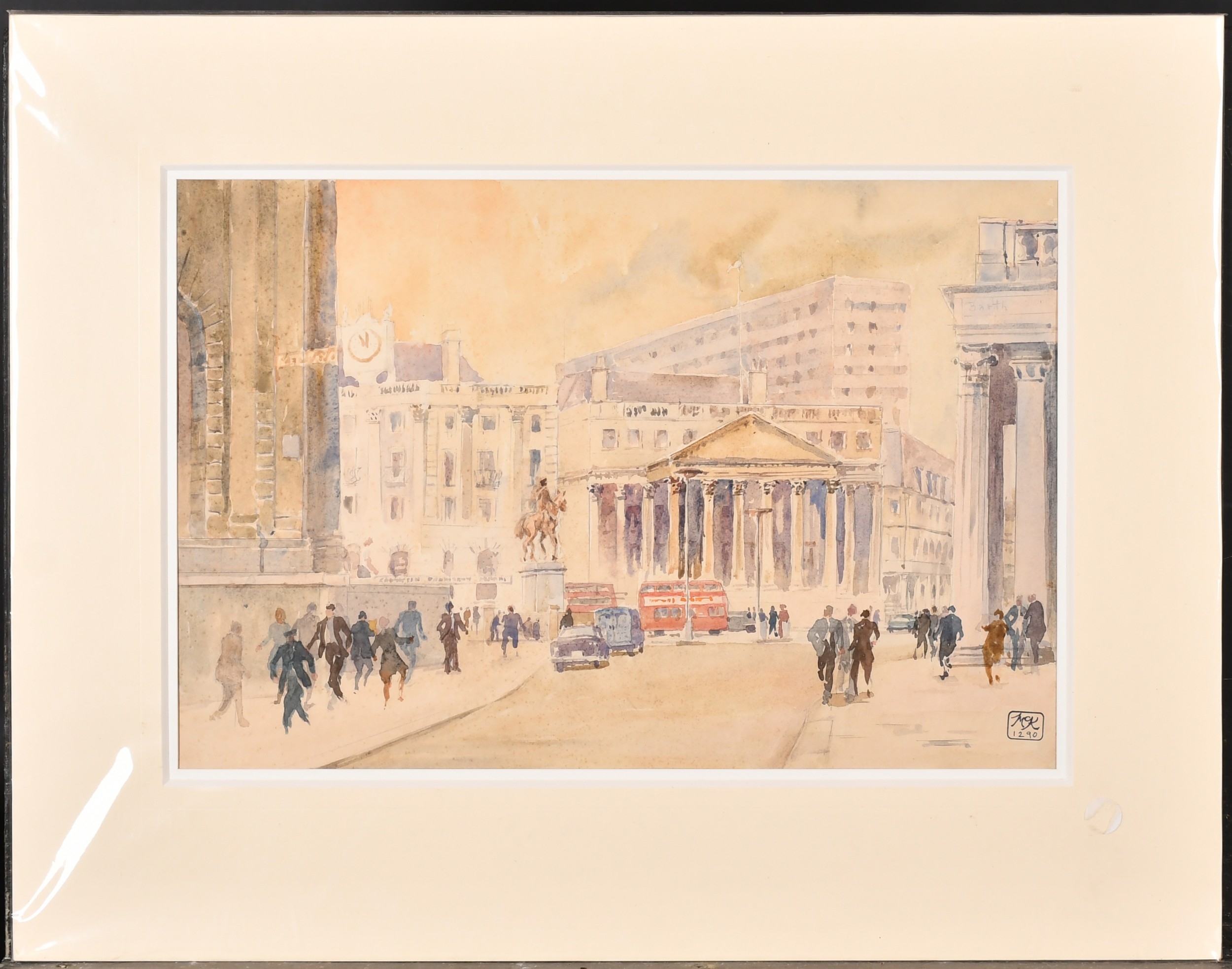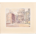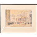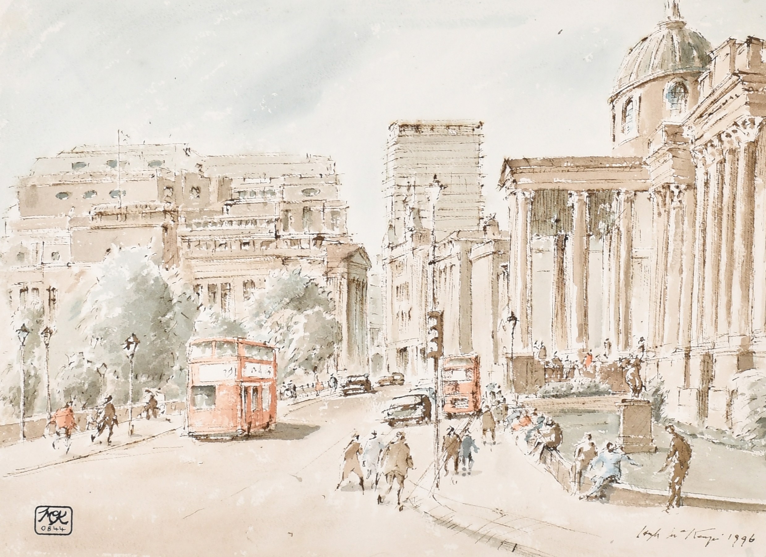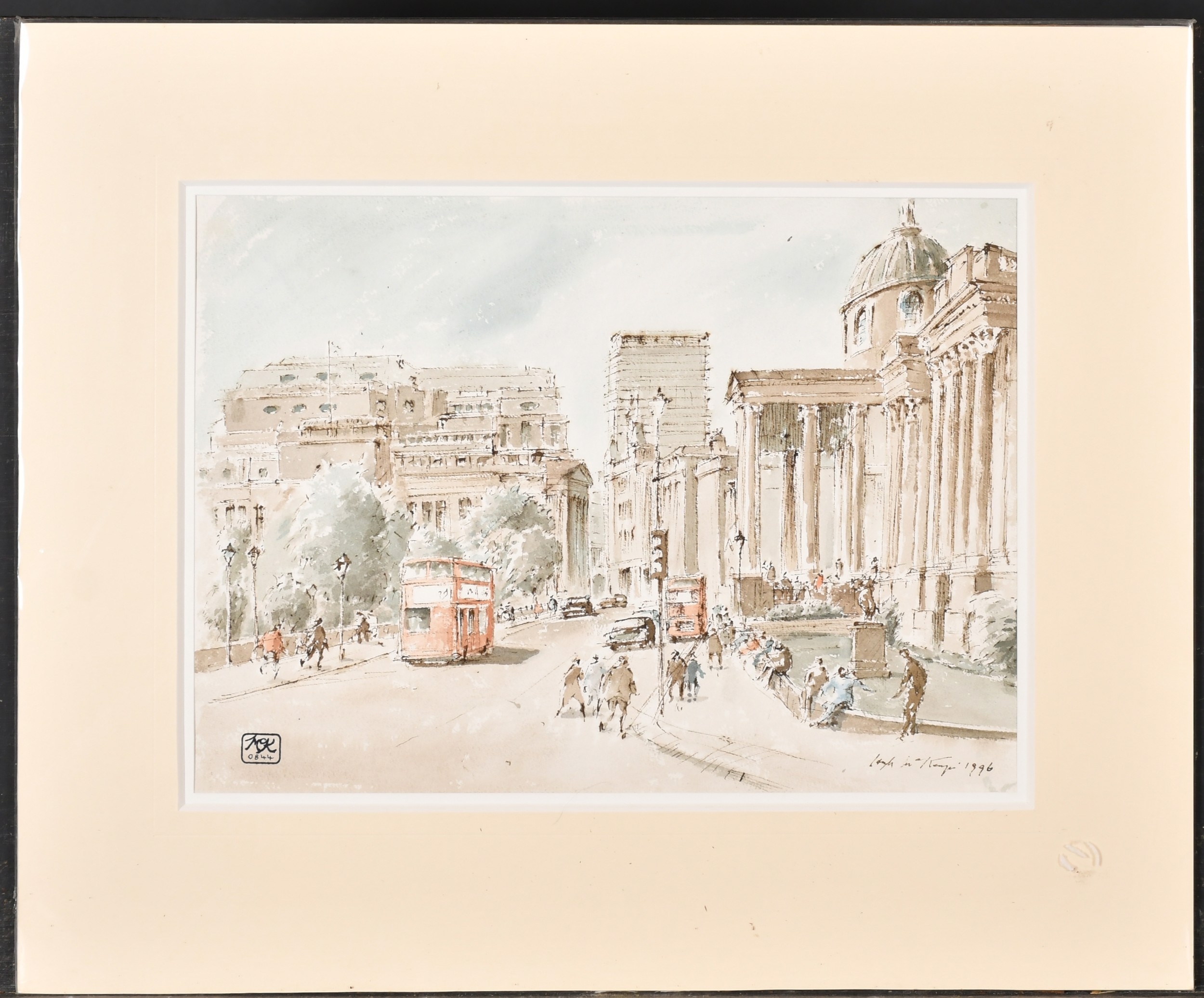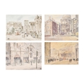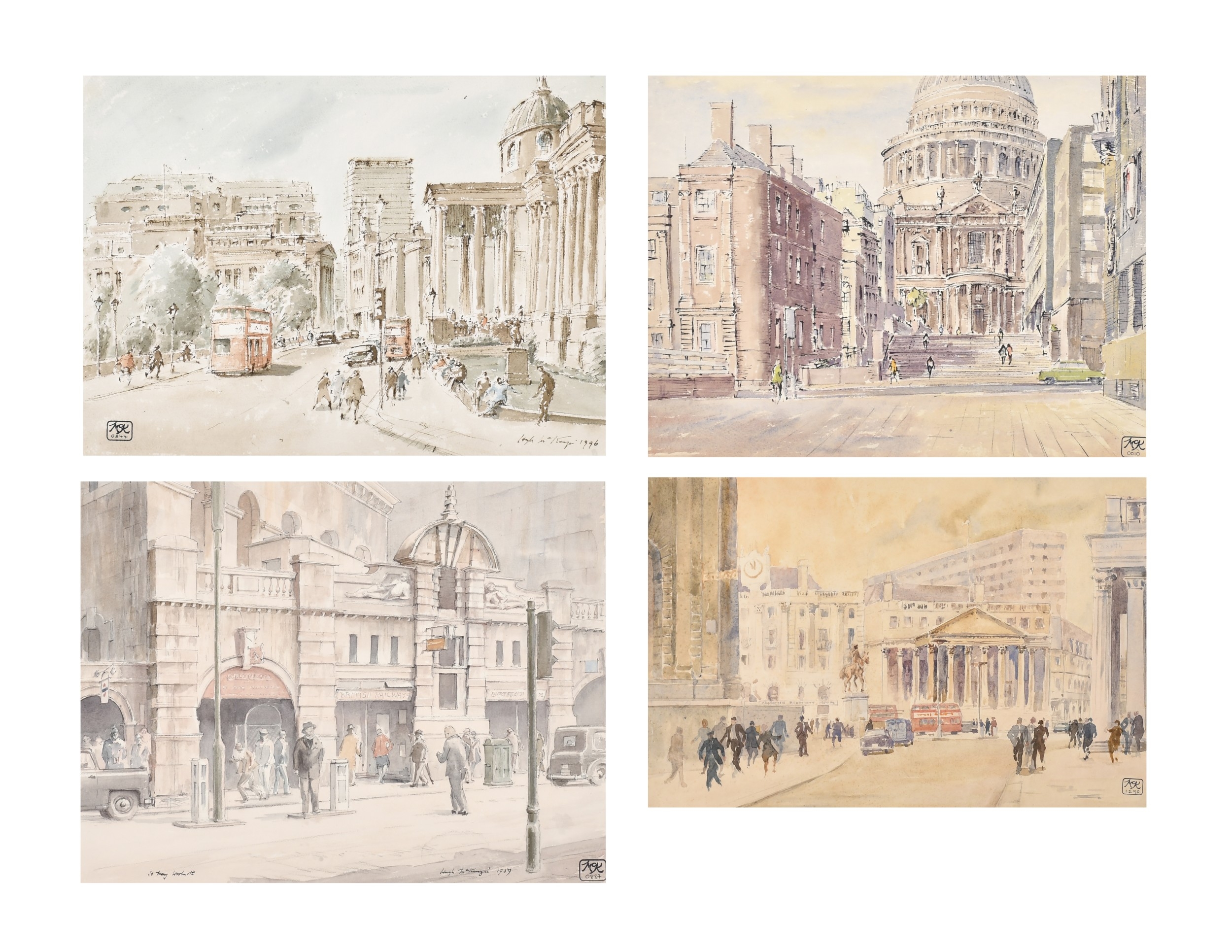 Hugh McKenzie (1909-2005) British. "A View of Trafalgar Square looking towards the National Gallery", Watercolour and ink, Signed and dated 1996, with studio stamp numbered 0844, mounted, unframed 11.5" x 15.75" (29.2 x 40cm), and three others "Mansion House from Threadneedle Street", "St Mary Woolnoth" and "View of the South Transept Entrance of St Paul's Cathedral" (4)