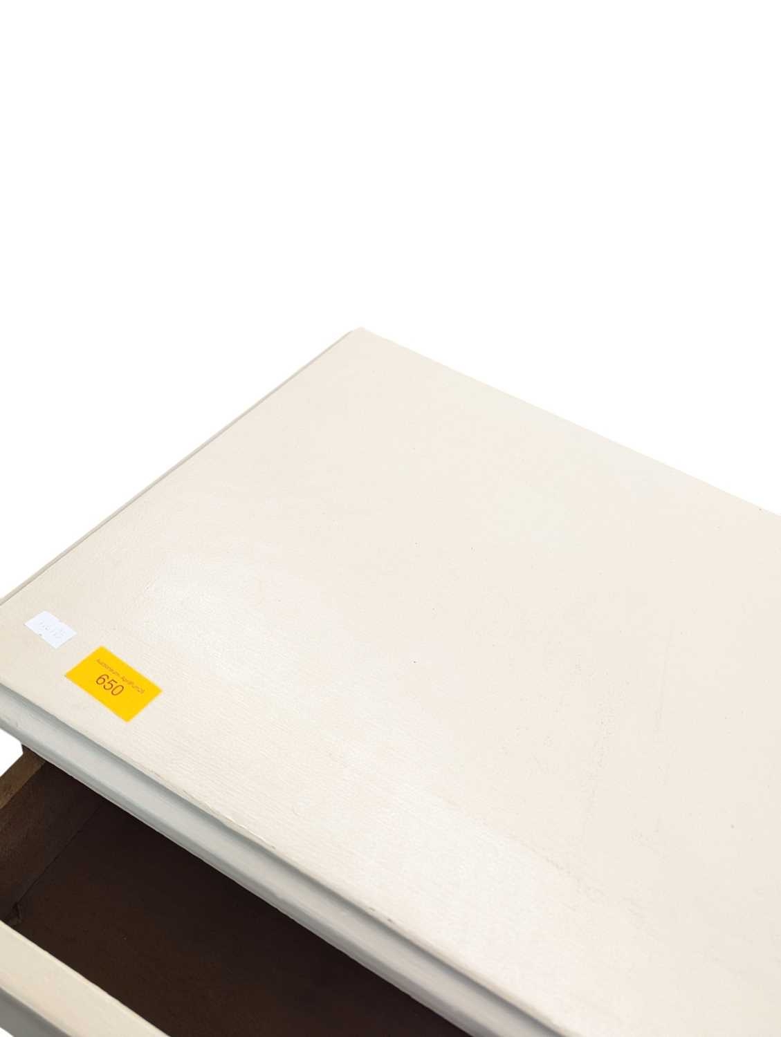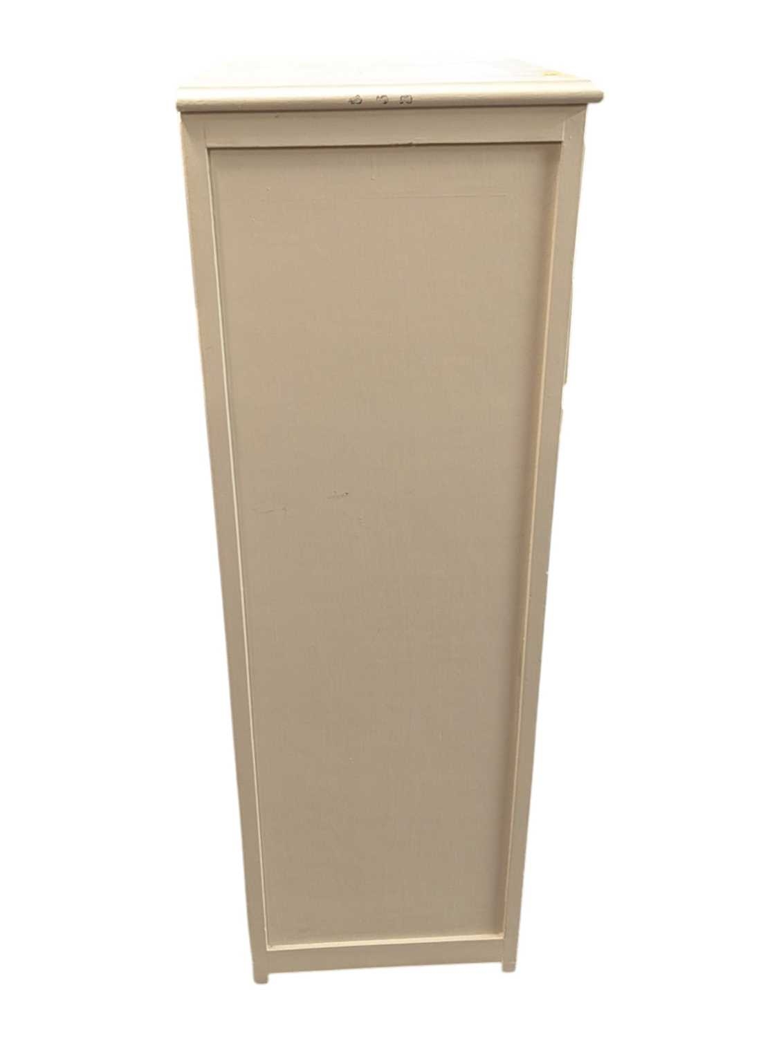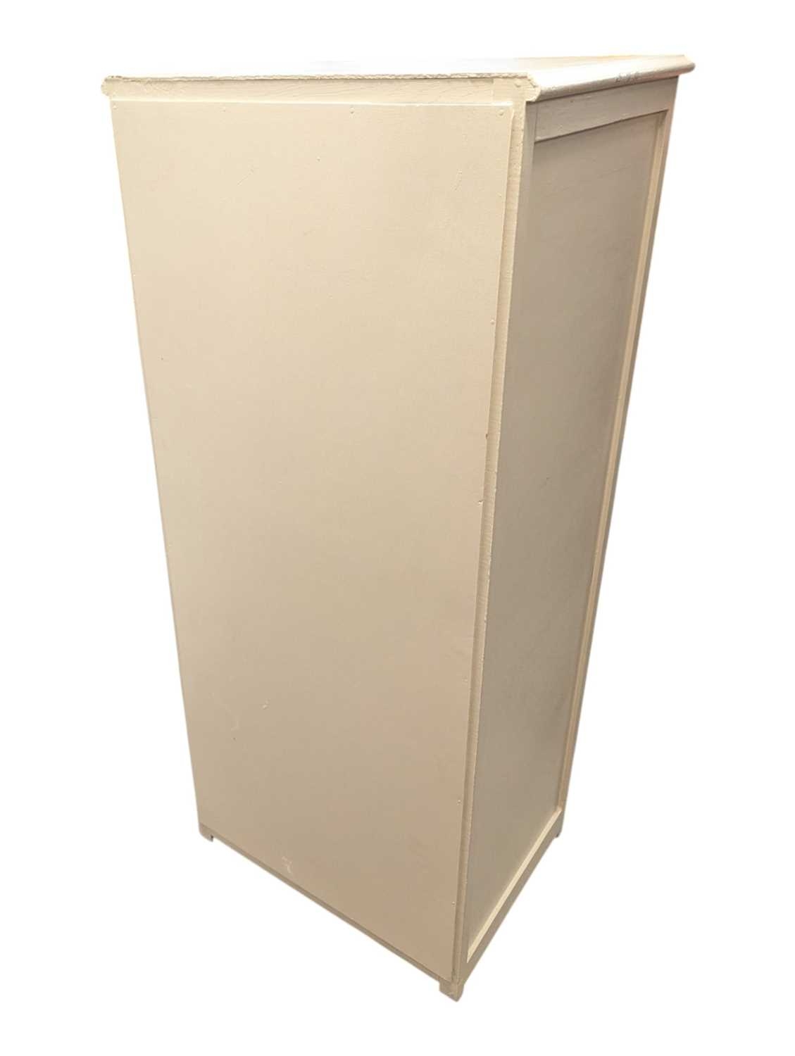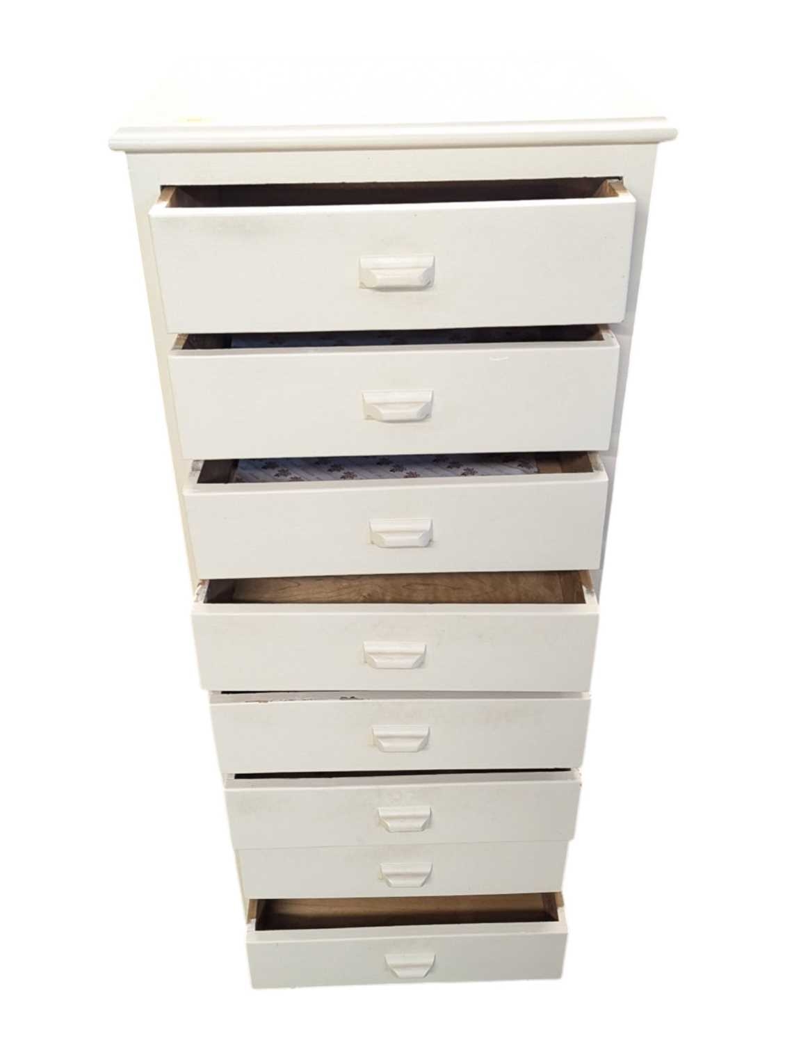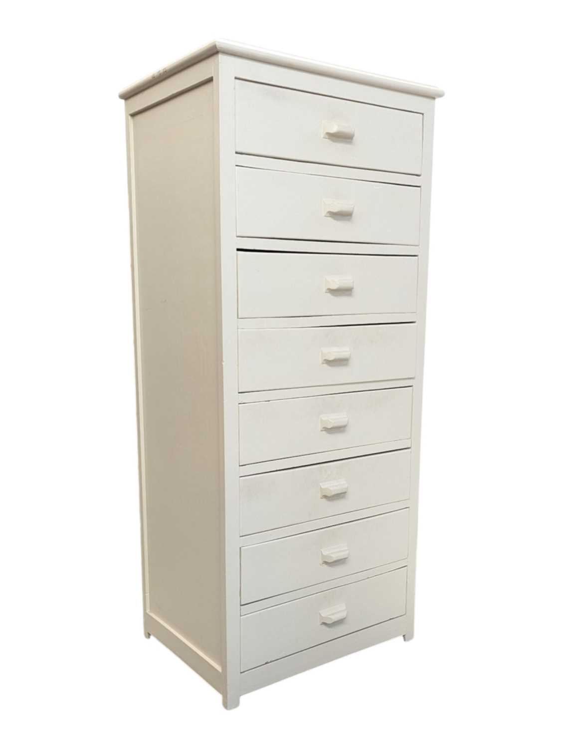A 20th century white painted semainier pedestal chest of drawers. The chest having a bank of eight drawers, raised over a plinth base. Measures approx: 123x55x41cm