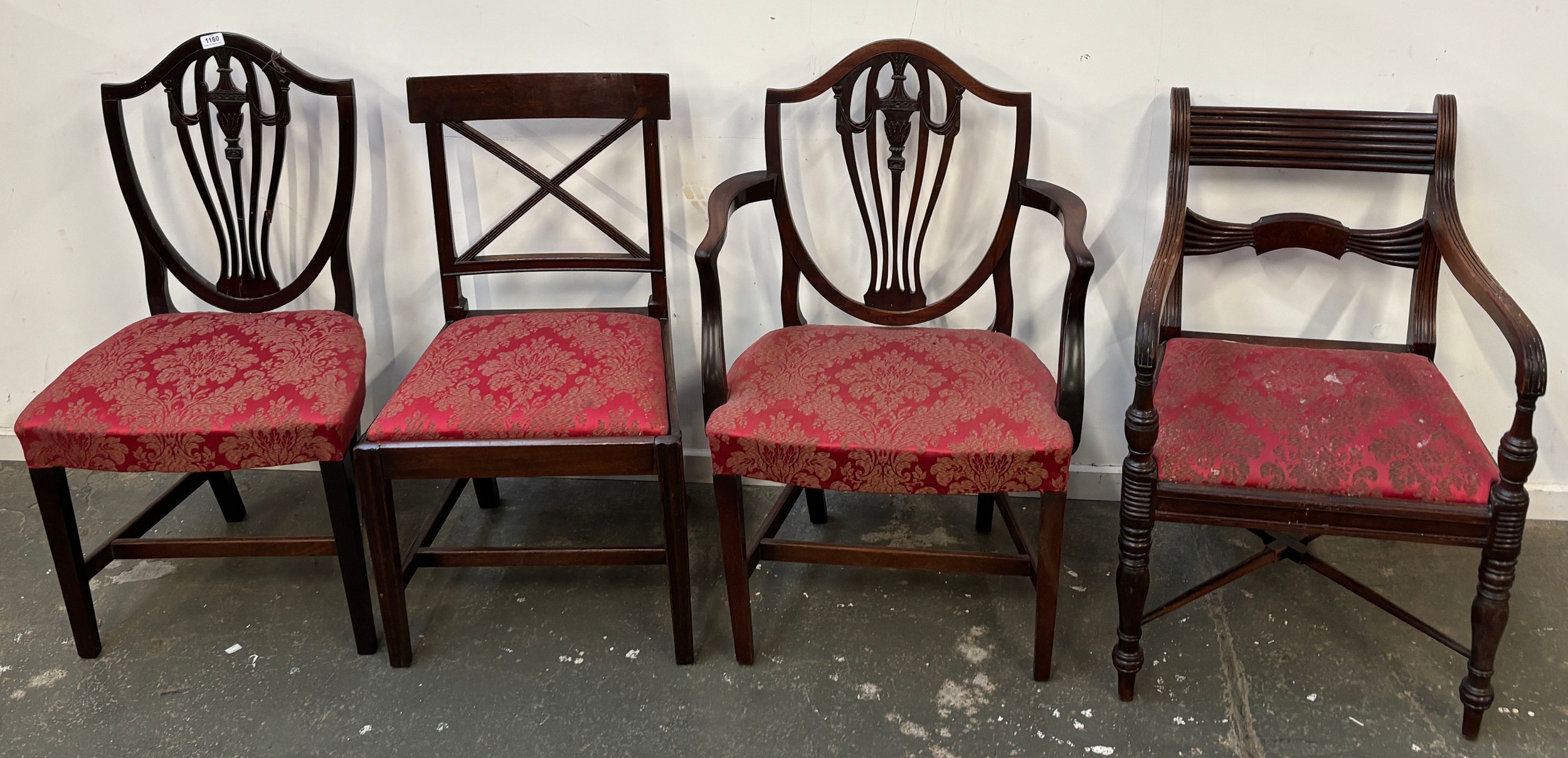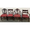 A set of six shieldback dining chairs, comprising two carvers, with two red upholstered stuff over seats; together with two others (8)