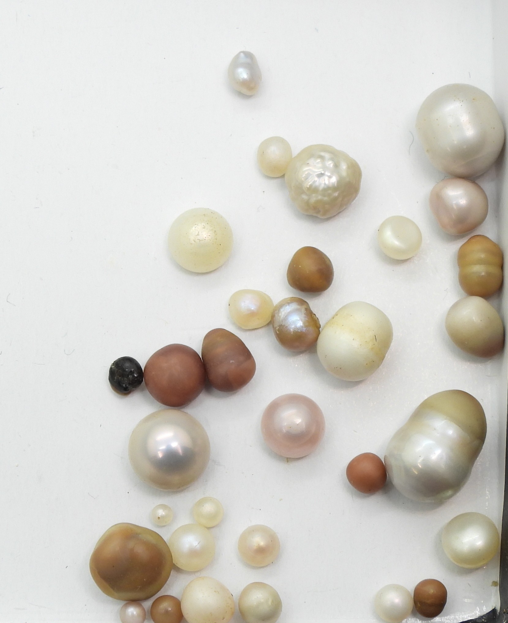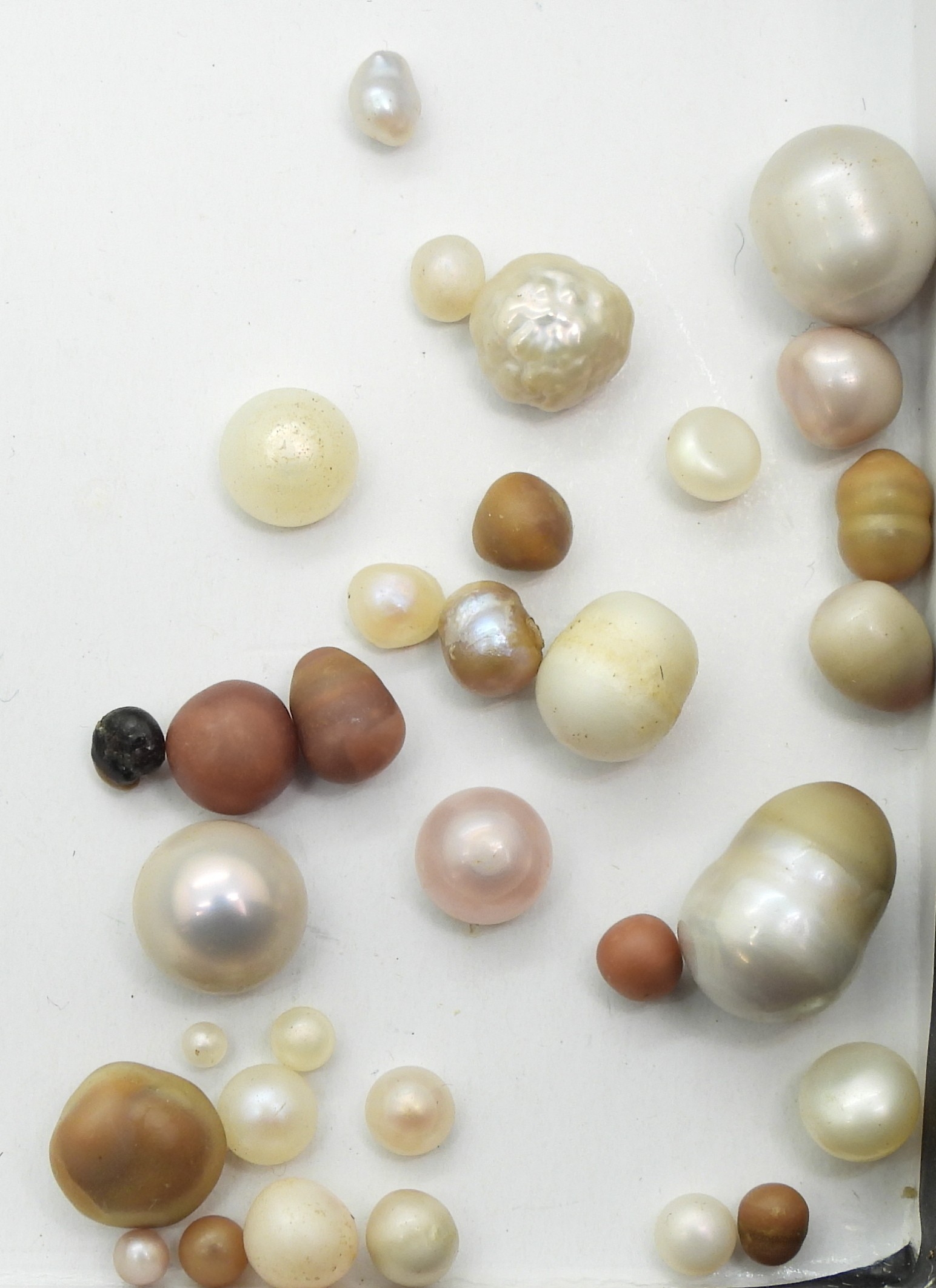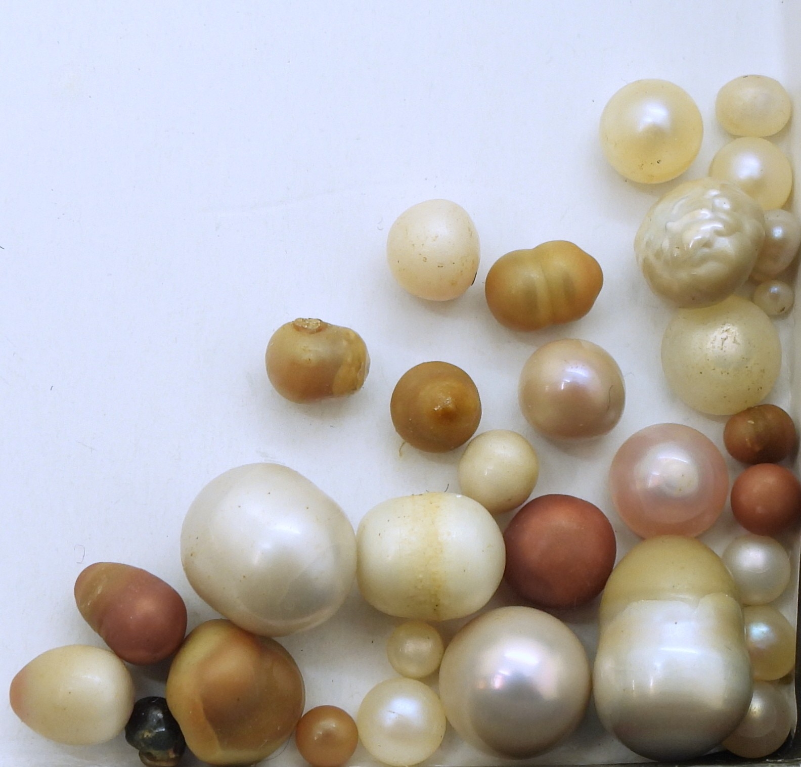 Approximately thirty Scottish river pearls, largest 9mm to smallest 1mm, A mixed collection of examples of river pearls, from black to white, cream & pink.