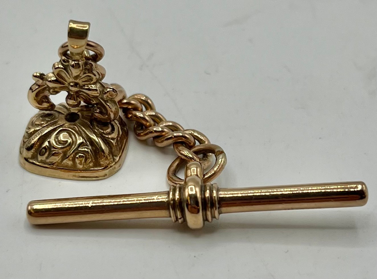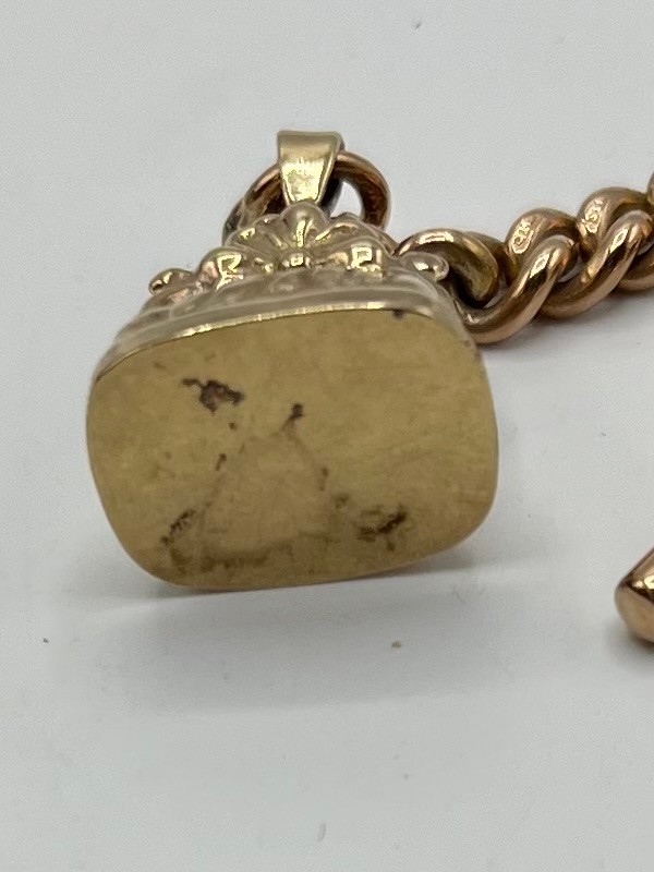A 9ct gold T-bar and curb link chain together with a 9ct gold watch fob. Total weight 9.8g.