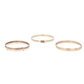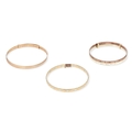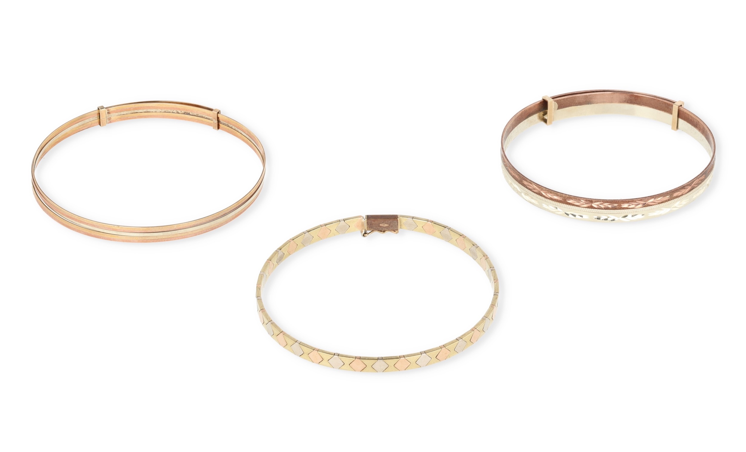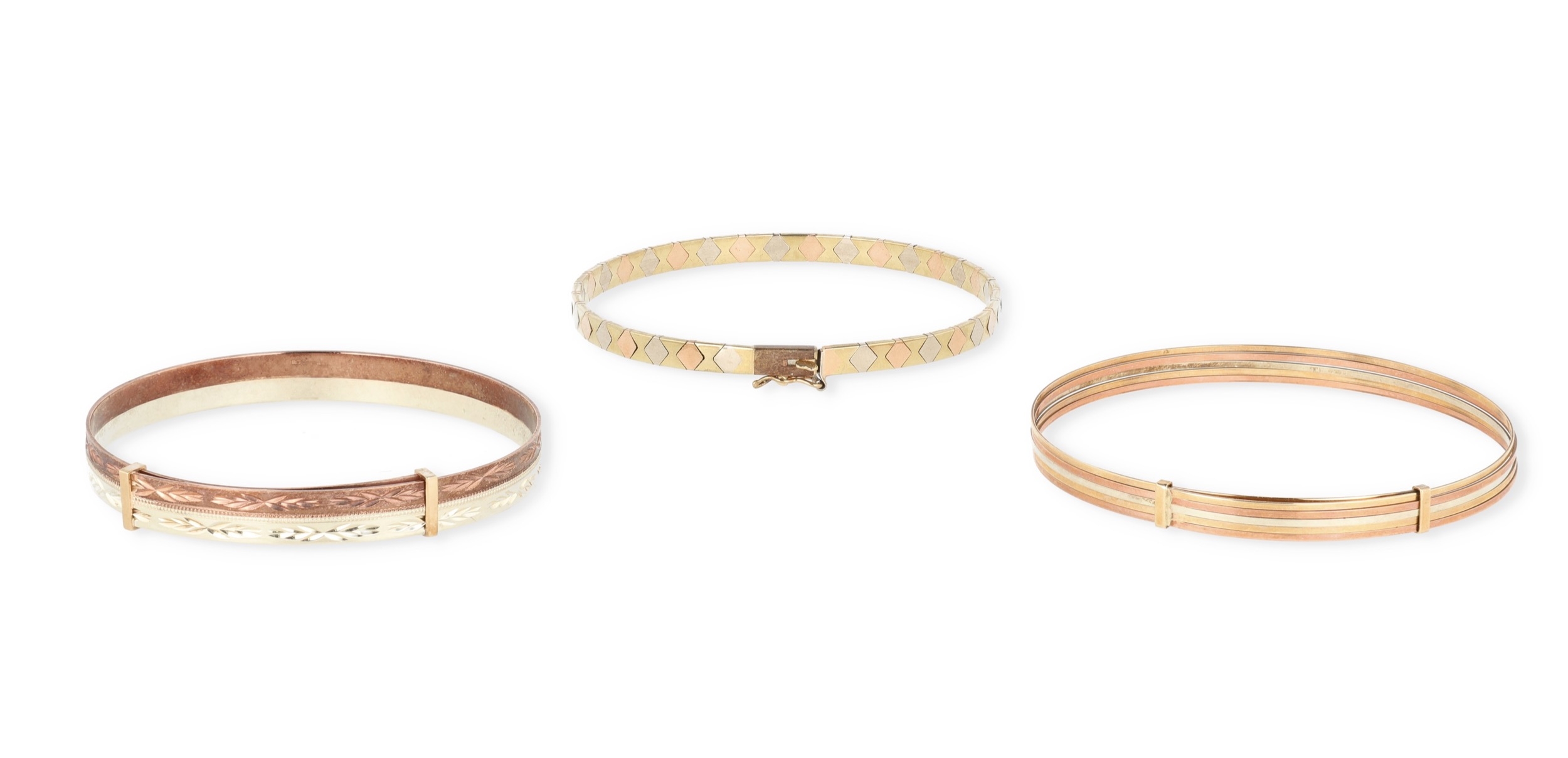 THREE MODERN 9CT GOLD THREE COLOUR BRACELETS OF VARYING DESIGN