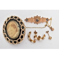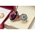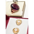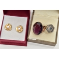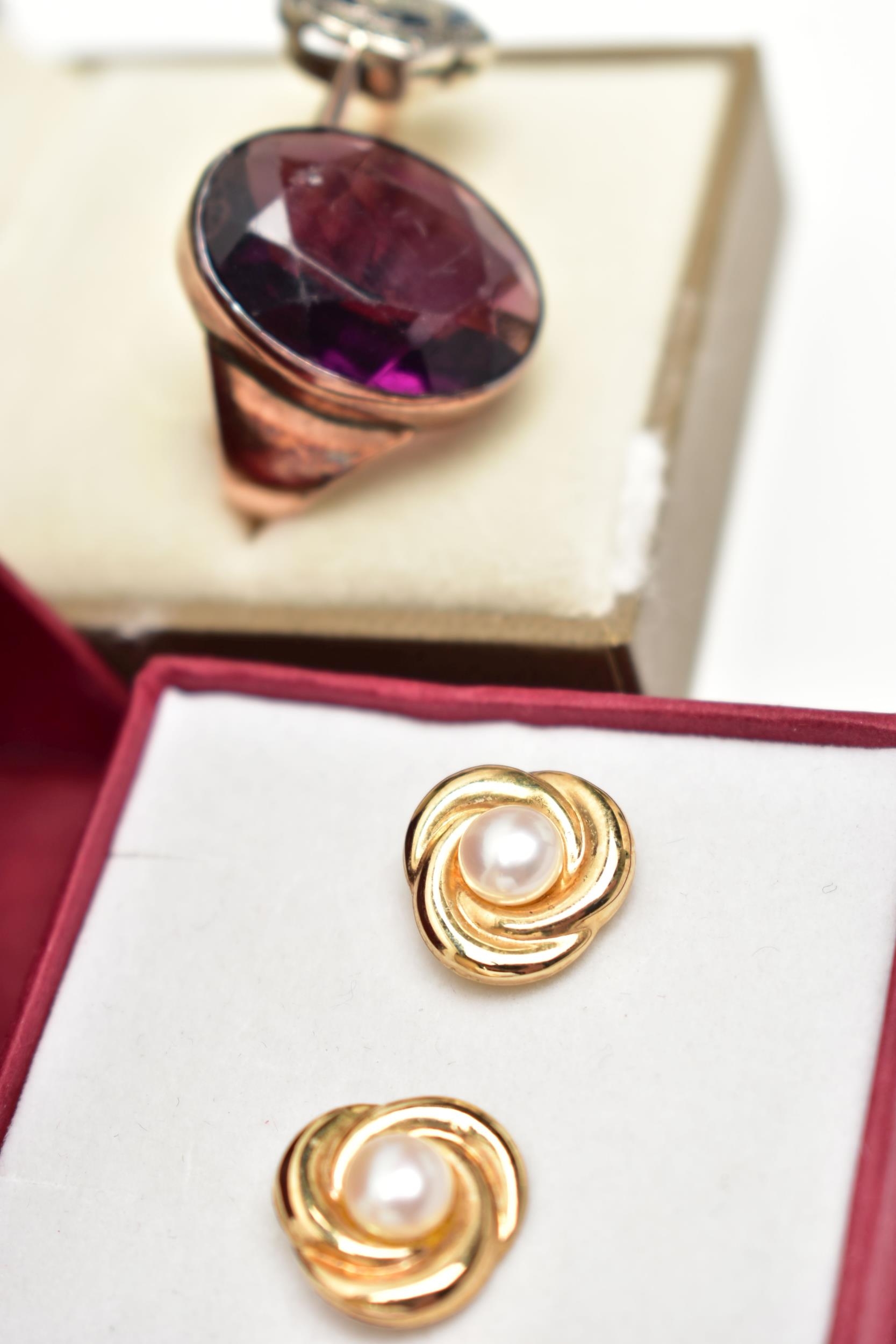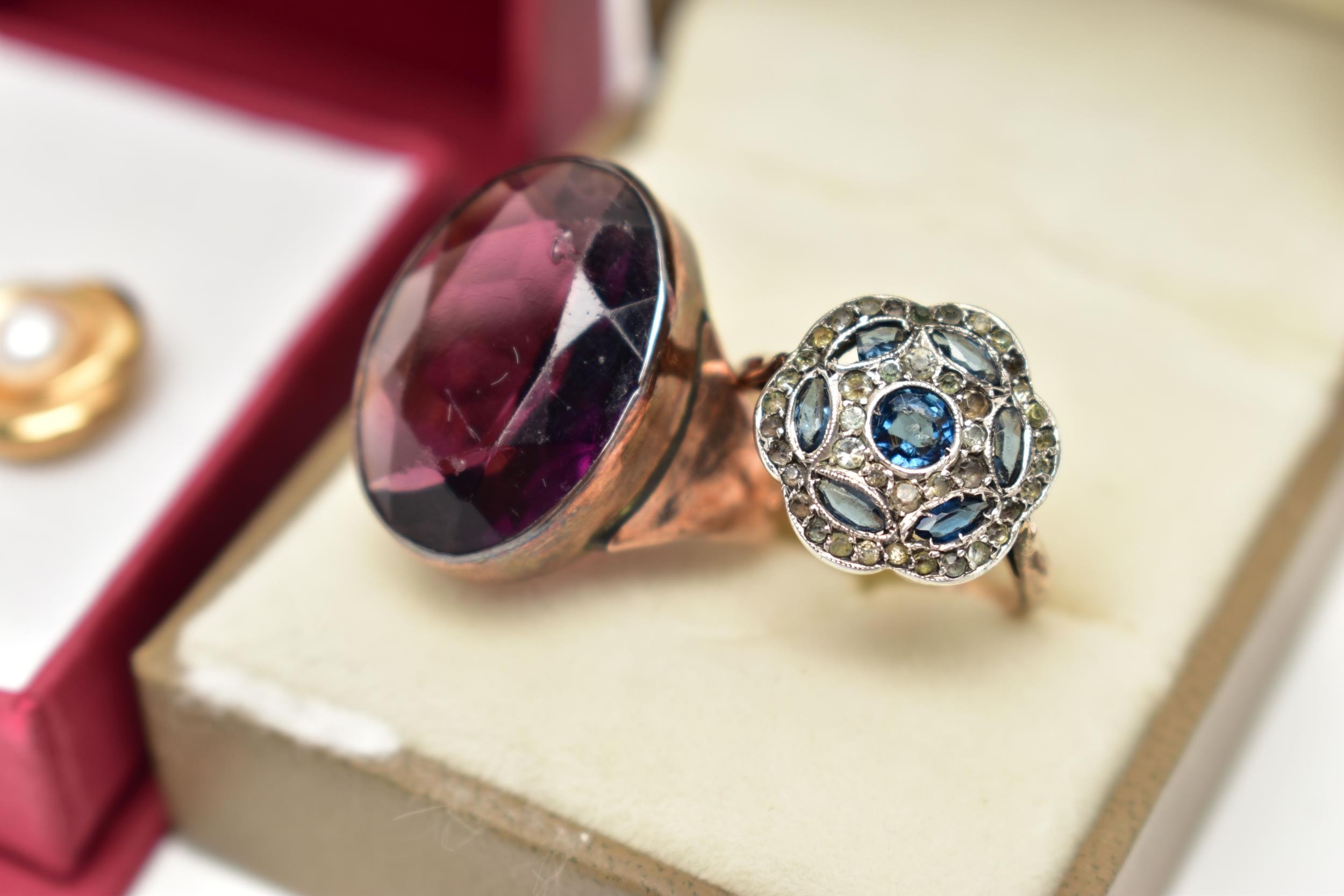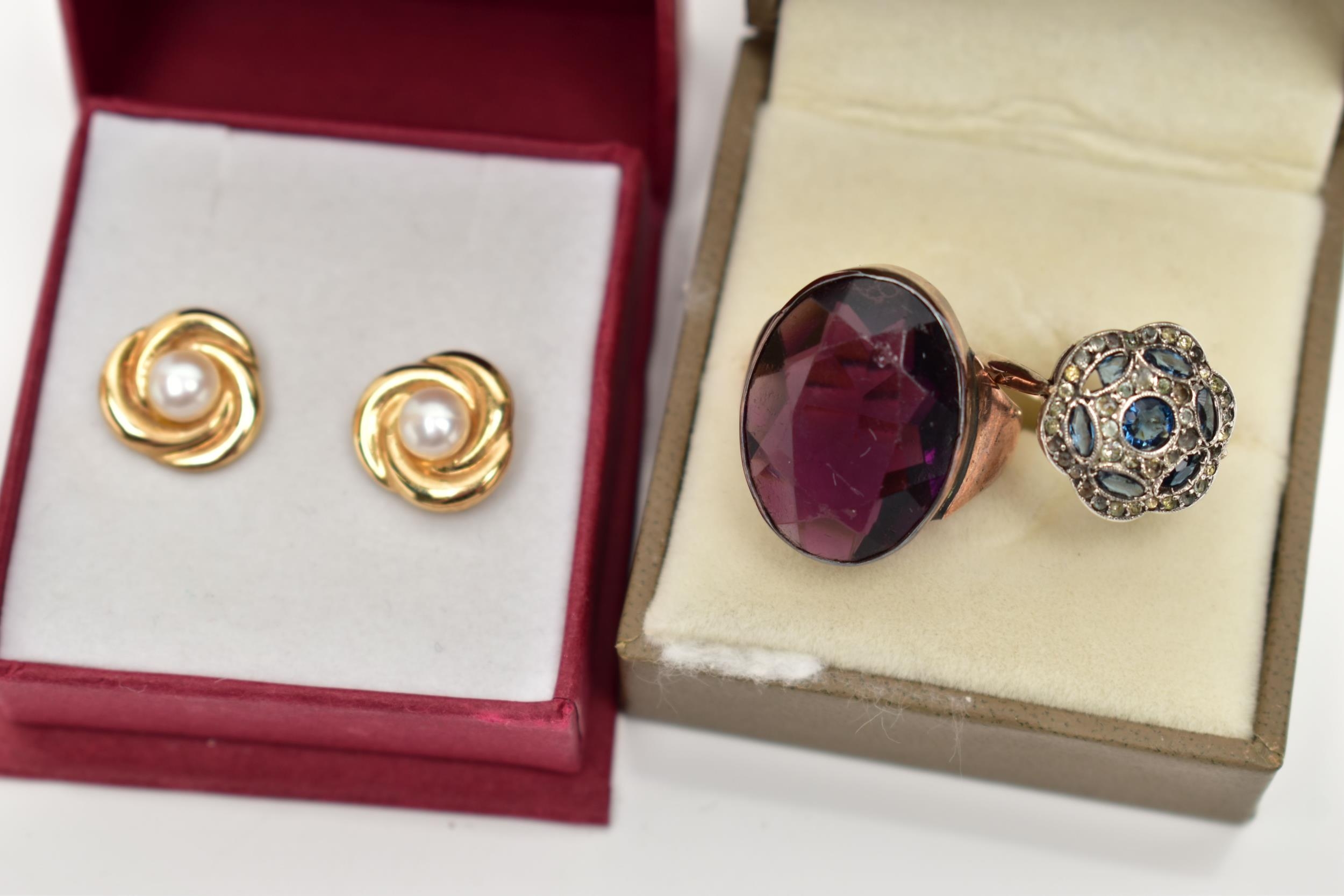 A LARGE DRESS RING, PASTE SET CLUSTER RING AND A PAIR OF EARRINGS, the first ring set with an oval cut purple paste, collet set within a rose metal mount, polished tapering shank, unmarked, ring size I, approximate gross weight 7.3 grams, the second ring of a flower shape, set with blue and colourless pastes, in a white metal mount, pinched shoulders leading onto a polished yellow metal band, stamped 9ct, ring size K 1/2, approximate gross weight 3.1 grams, together with a pair of yellow metal and imitation pearl stud earrings, post and scroll backs stamped 375, approximate gross weight 1.2 grams (condition report: the first large ring appears to have been resized at some point, slight discoloration in places, the paste set cluster has a damaged blue paste)