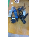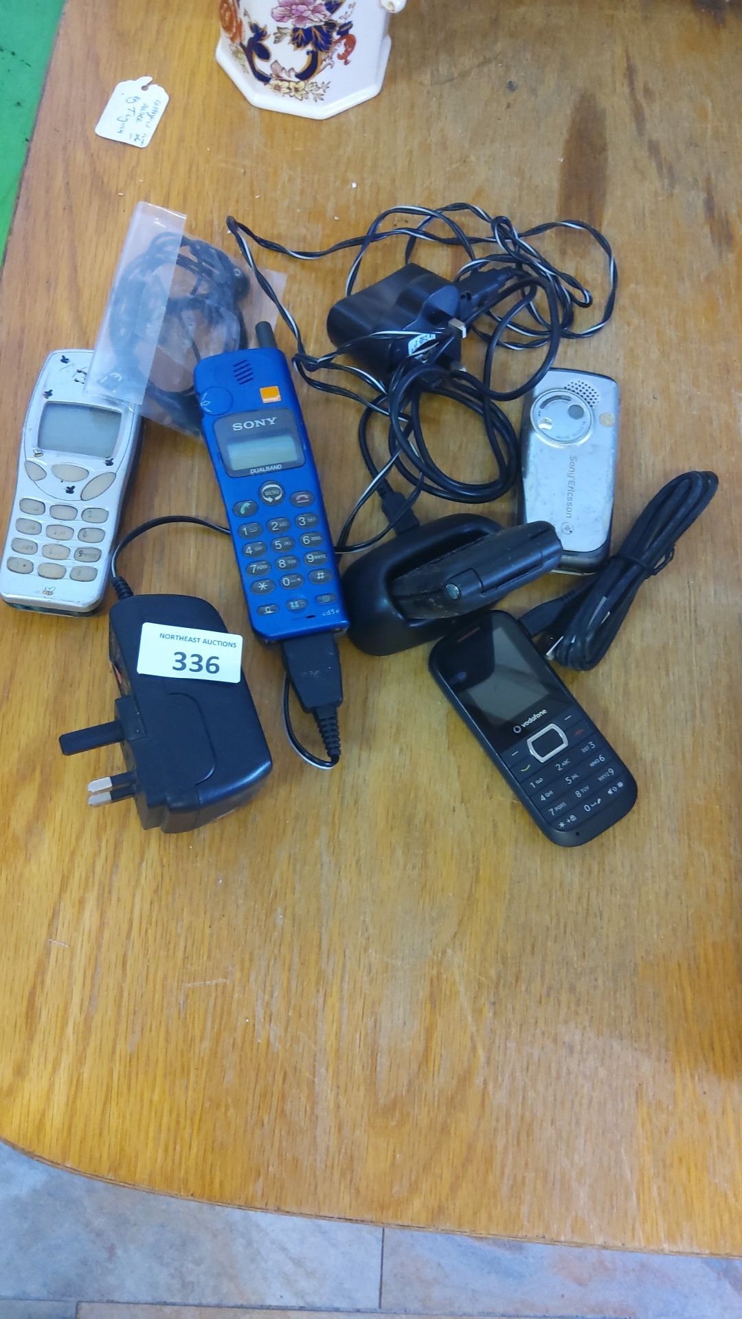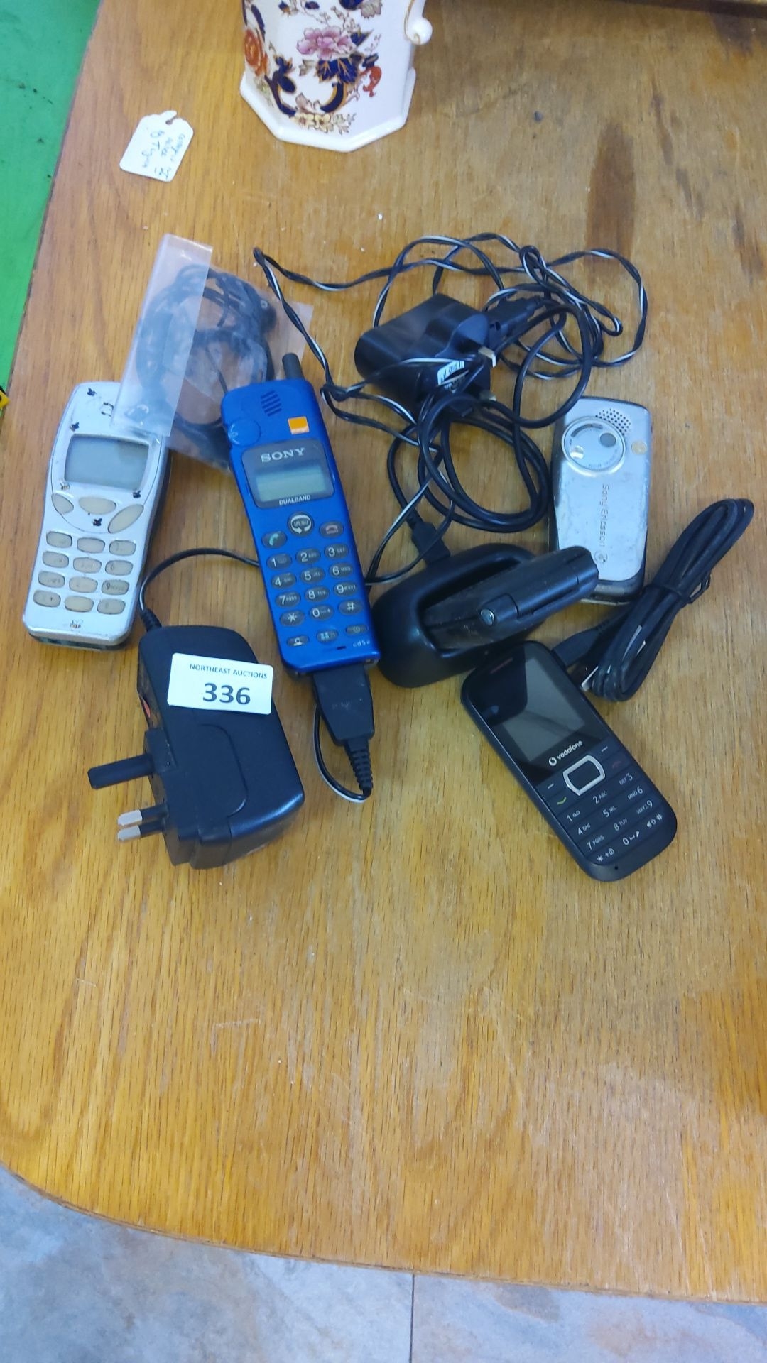 Collection of vintage mobile phones and accessories, featuring models by Sony and Sony Ericsson with chargers and cables.