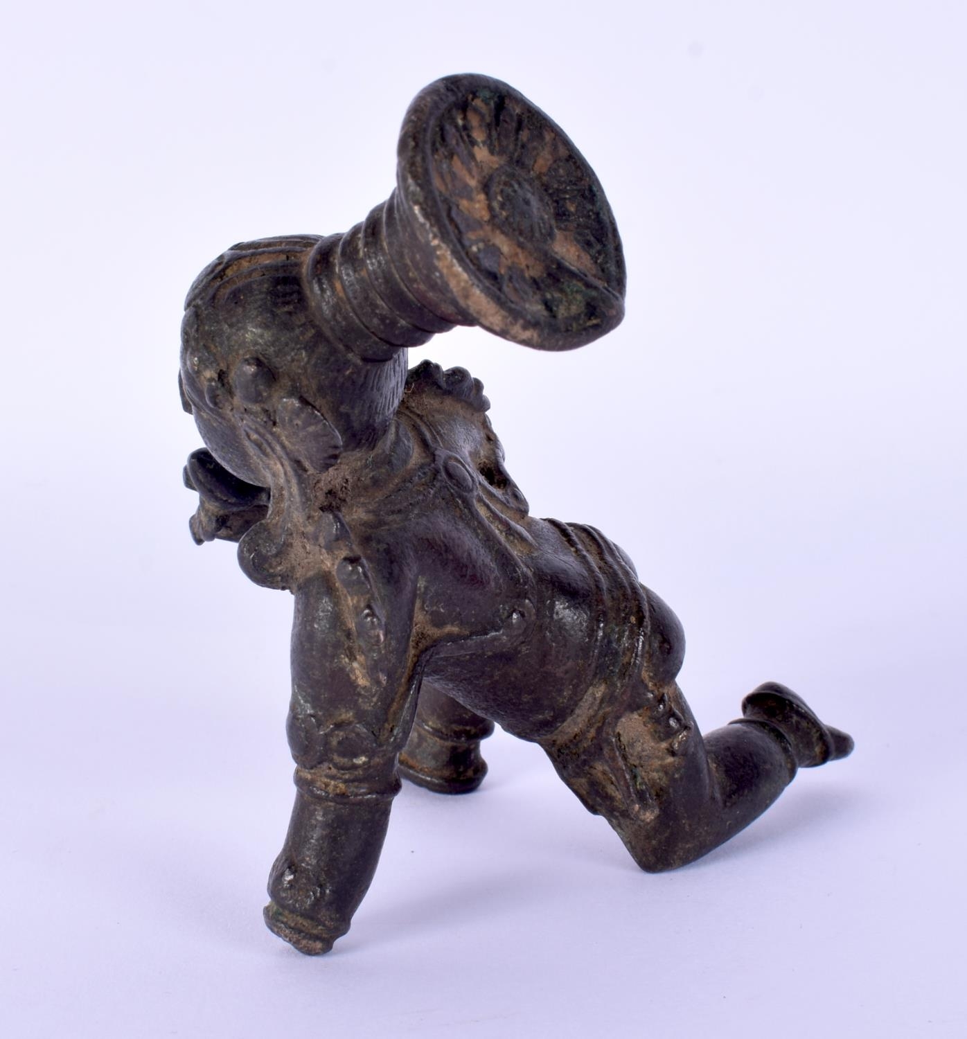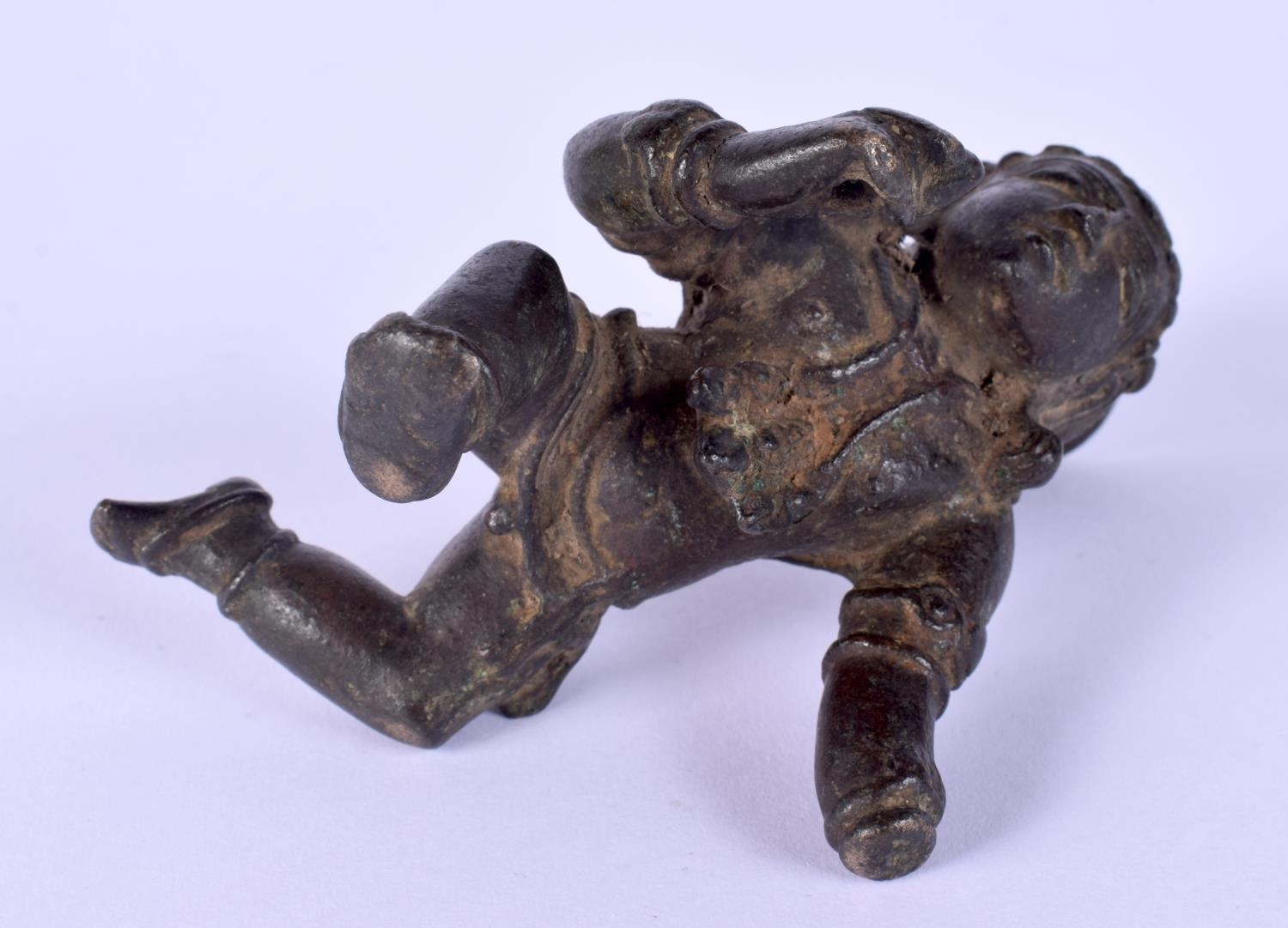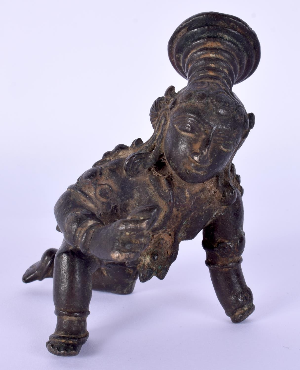 A FINE 16TH/17TH CENTURY BRONZE ALLOY FIGURE OF THE KRISHNA (The Butter Thief) Tamil Nadu, Vijayanagara Period. 8 cm x 10 cm.