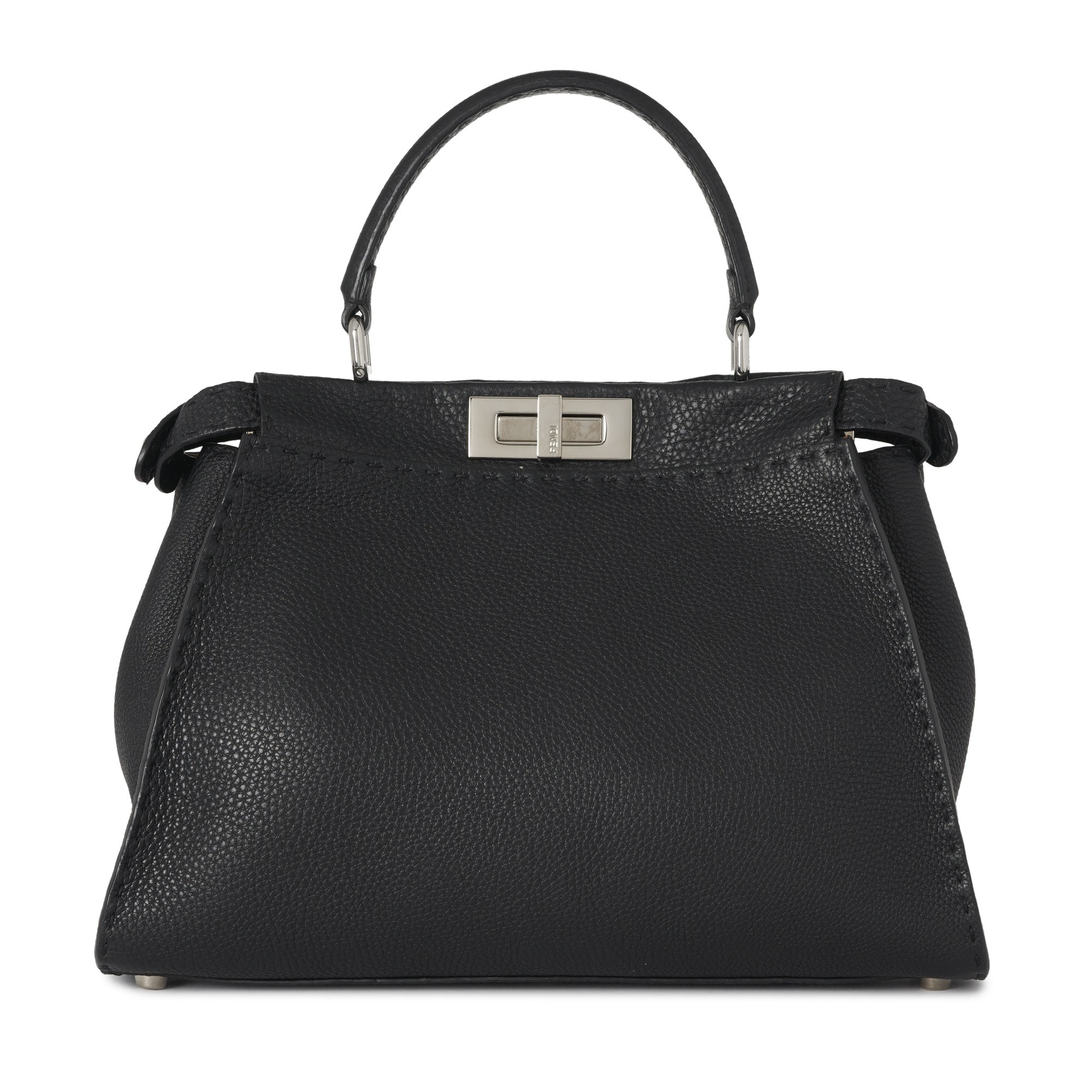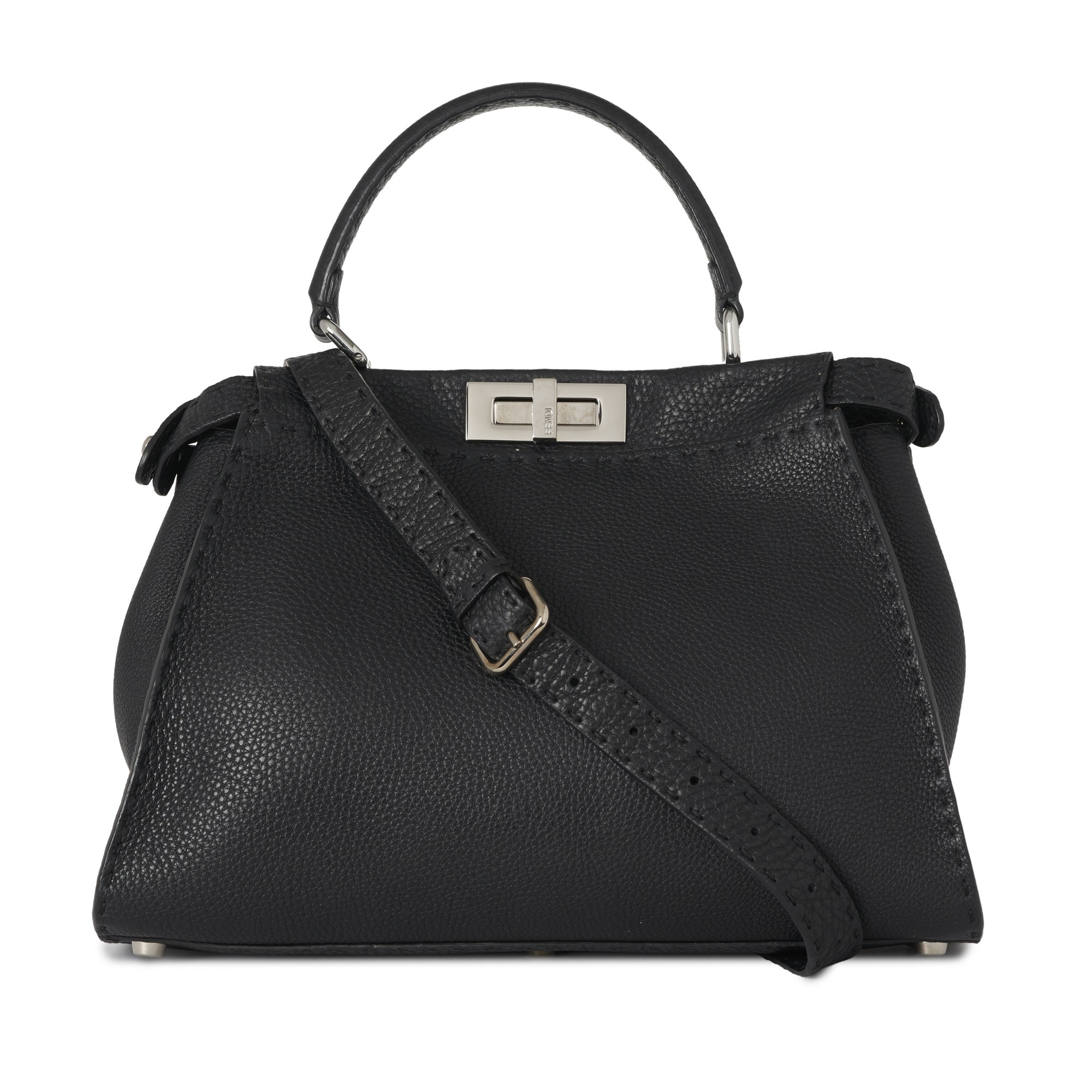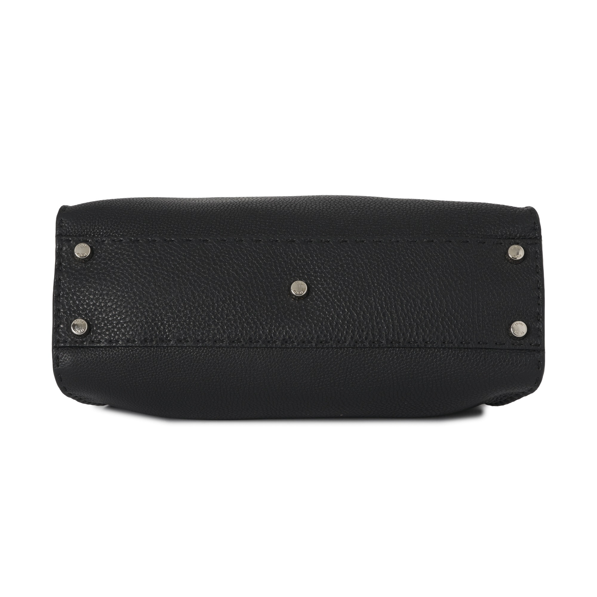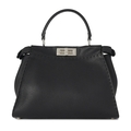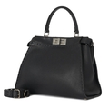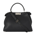 Fendi, a medium Peekaboo Selleria handbag, designed with a black leather exterior, featuring a looping leather top handle and a detachable shoulder strap, with two internal compartments divided by a partition frame with silver-tone hardware accents, turn-lock fastenings, and a pink leather and microfibre-lined interior, measuring 12 by 25 by 34cm, with maker's rain protector and care guide