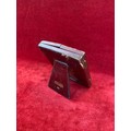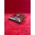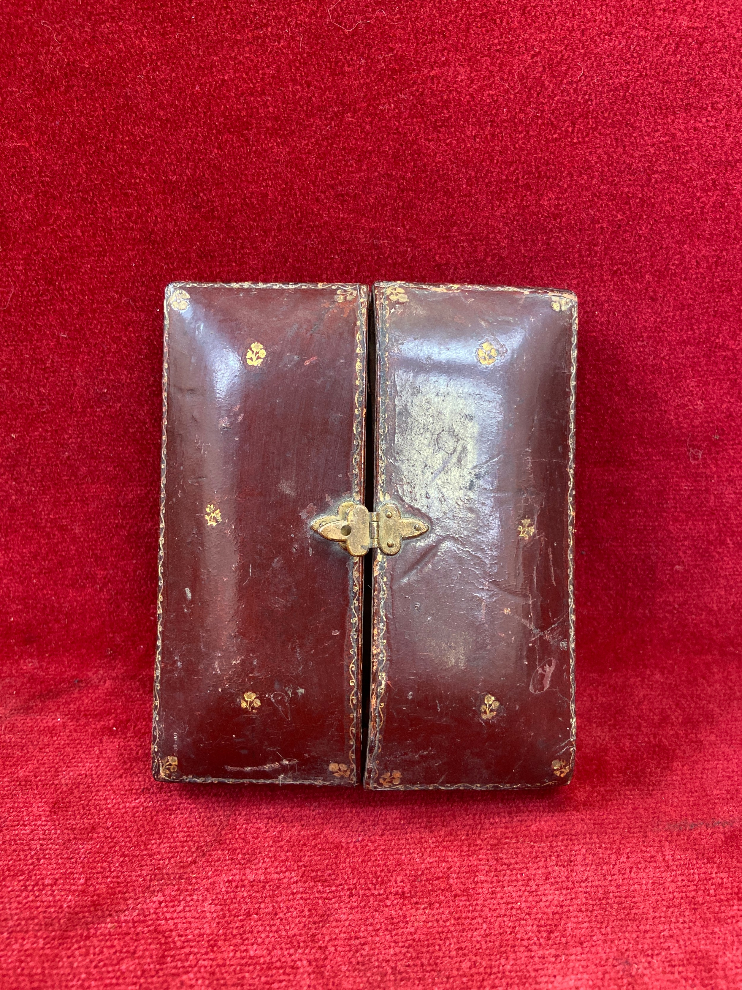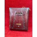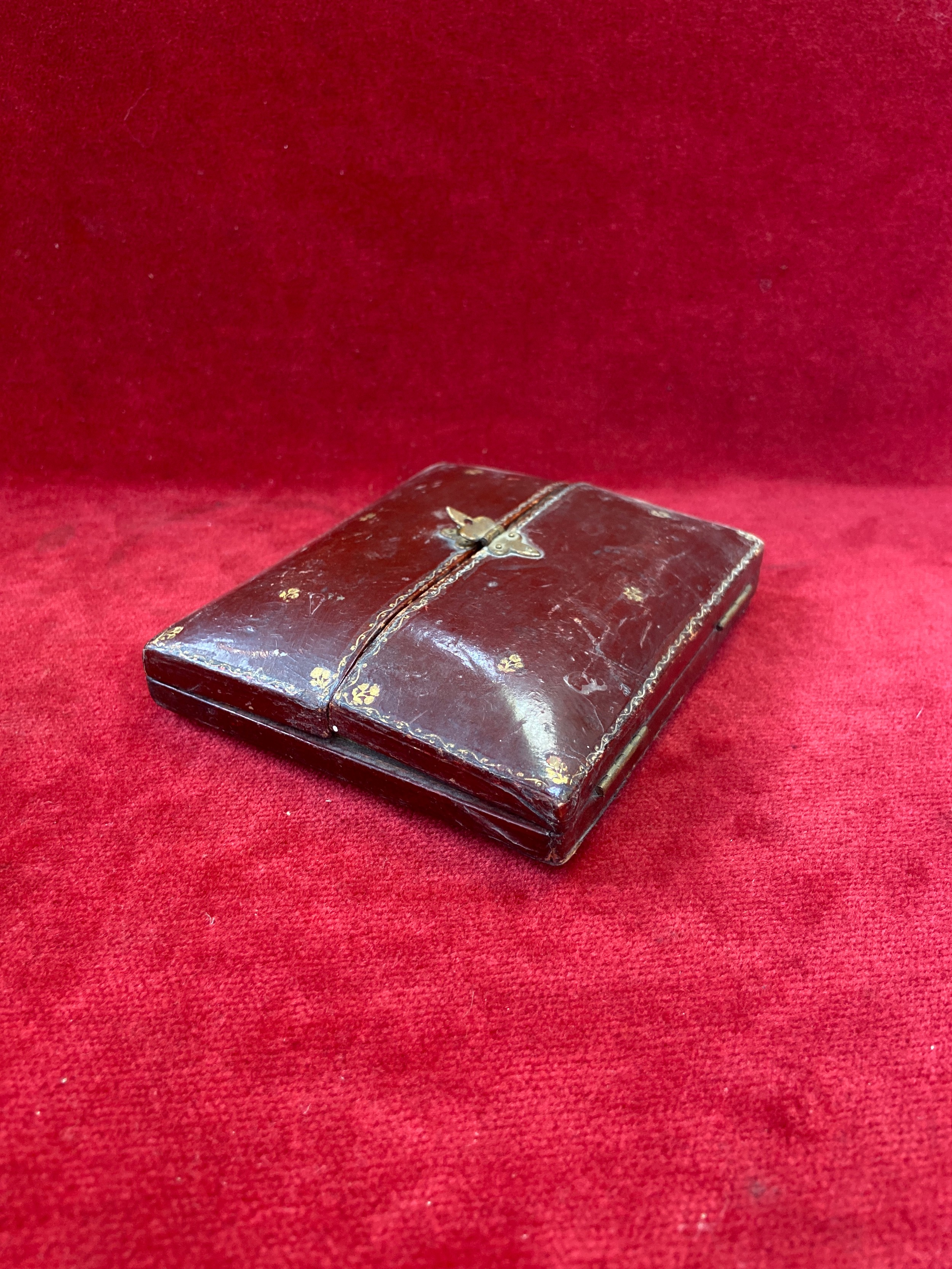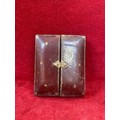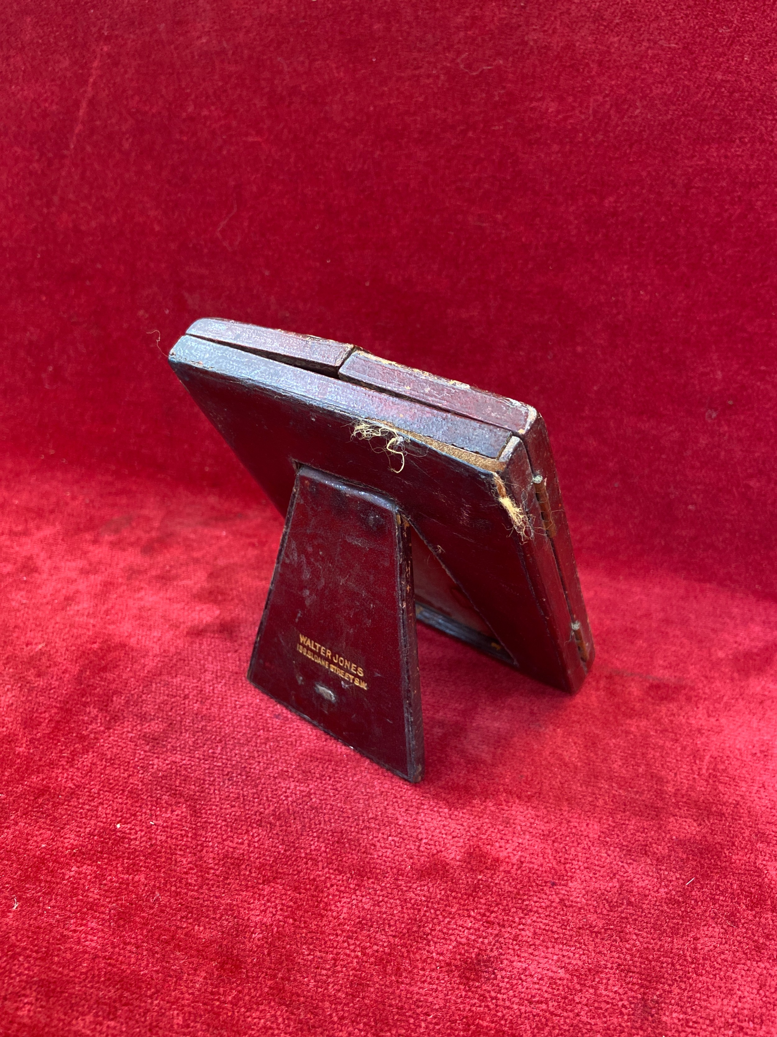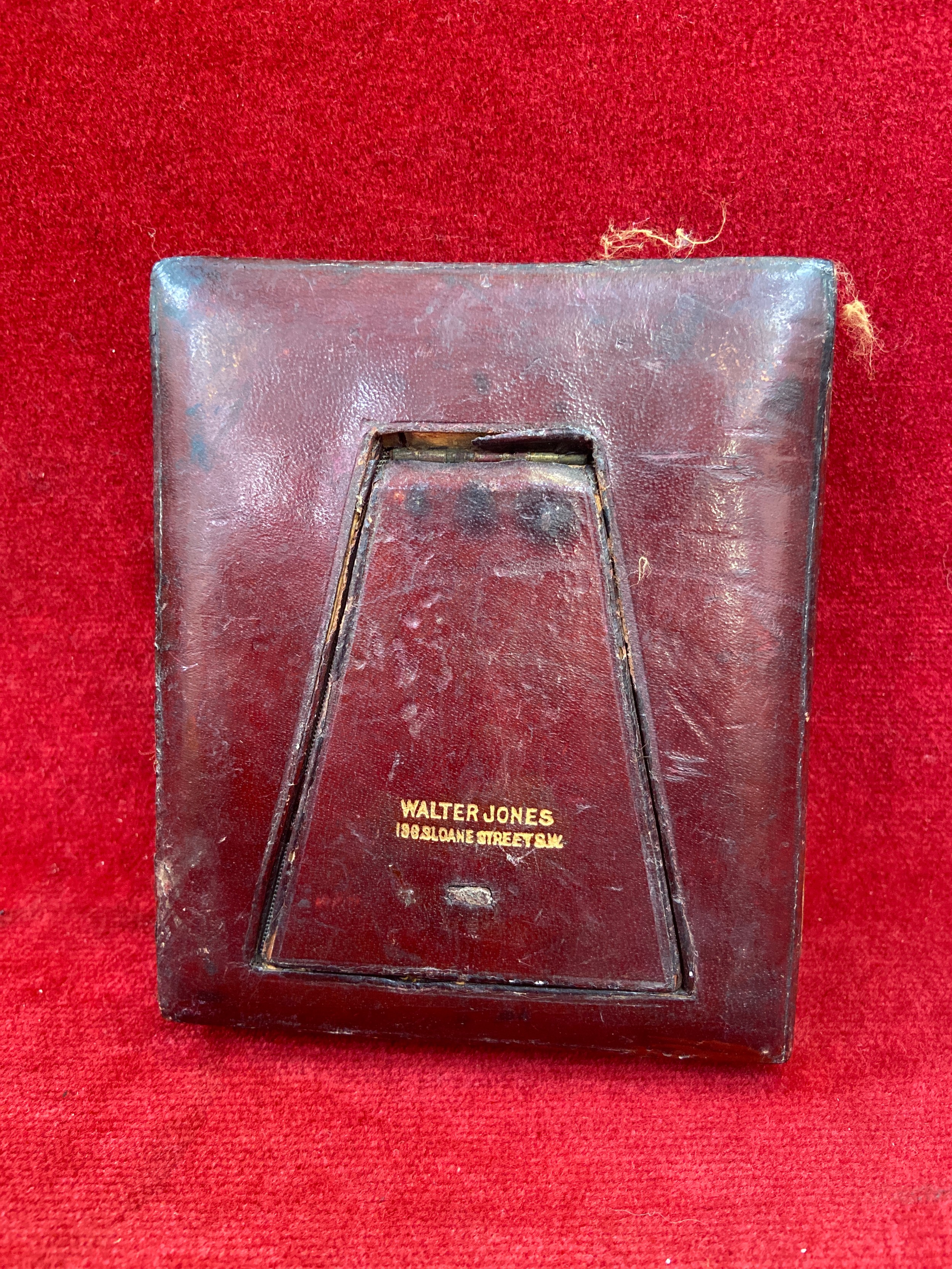 Antique red leather portrait miniature case marked "Walter Jones 198 Sloane Street" with easel back.