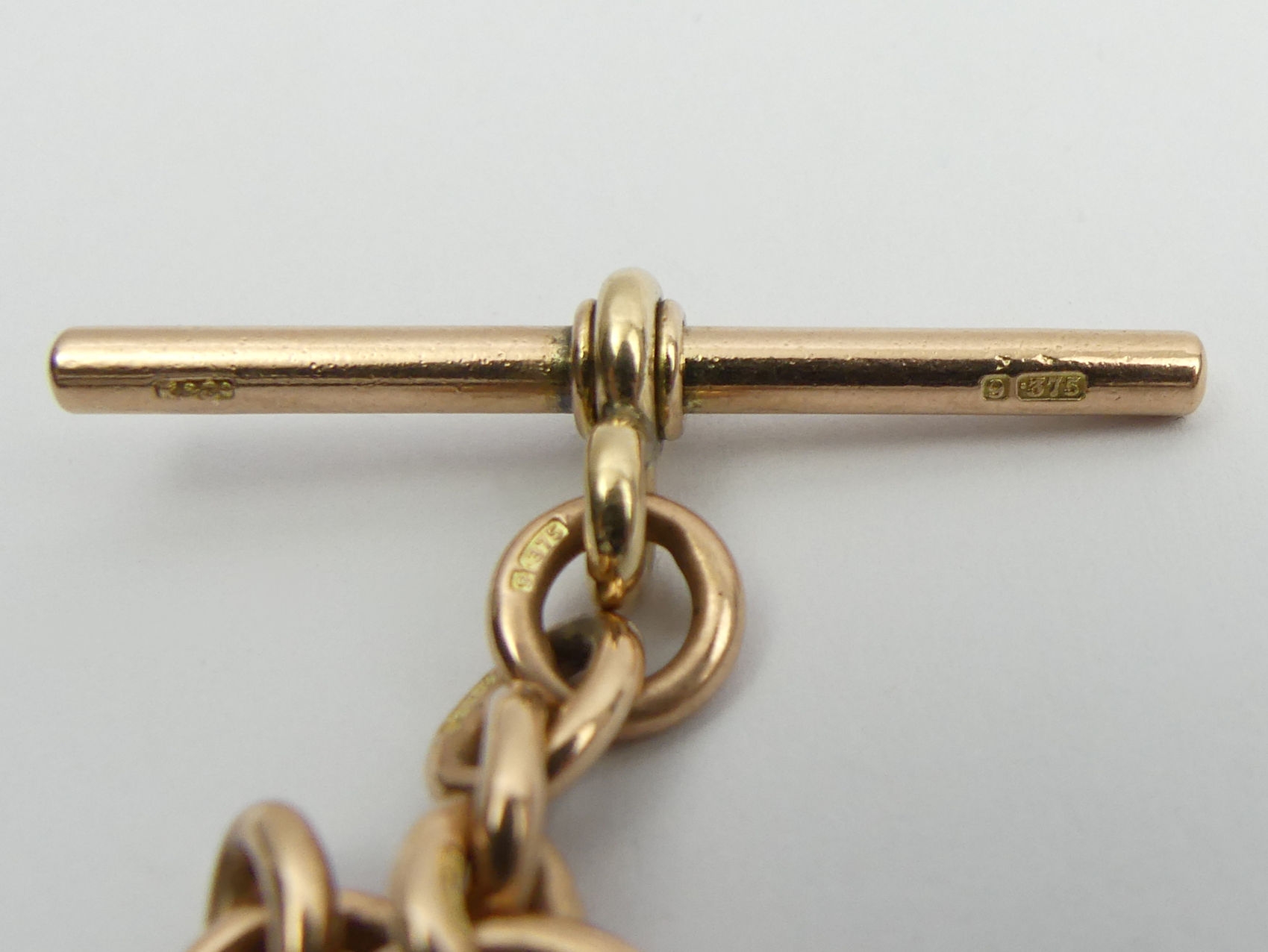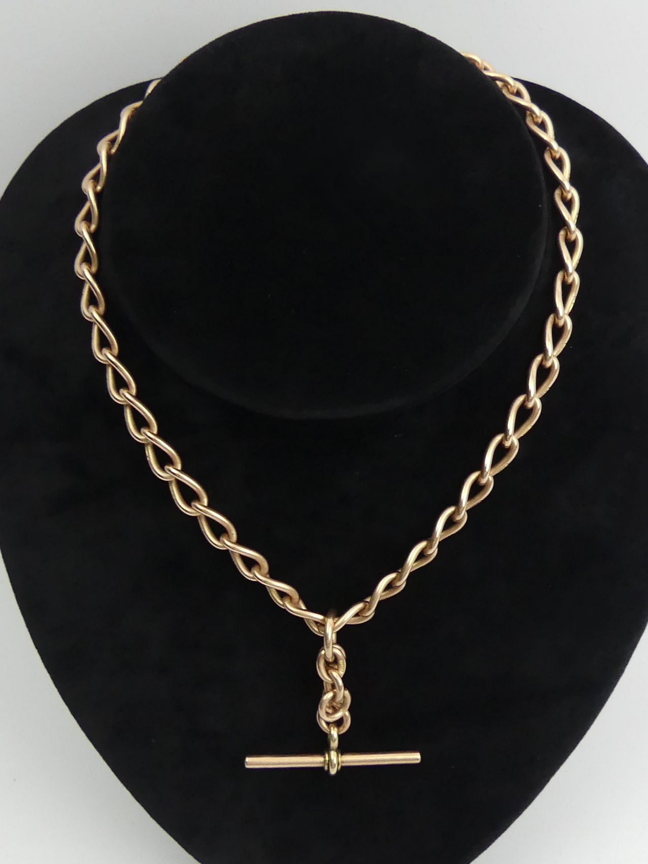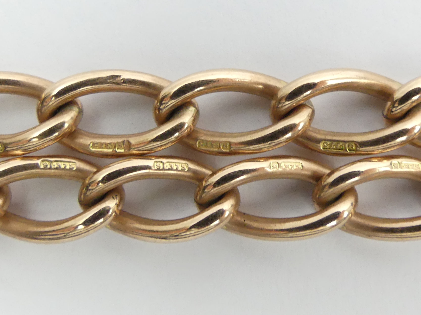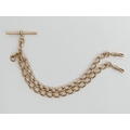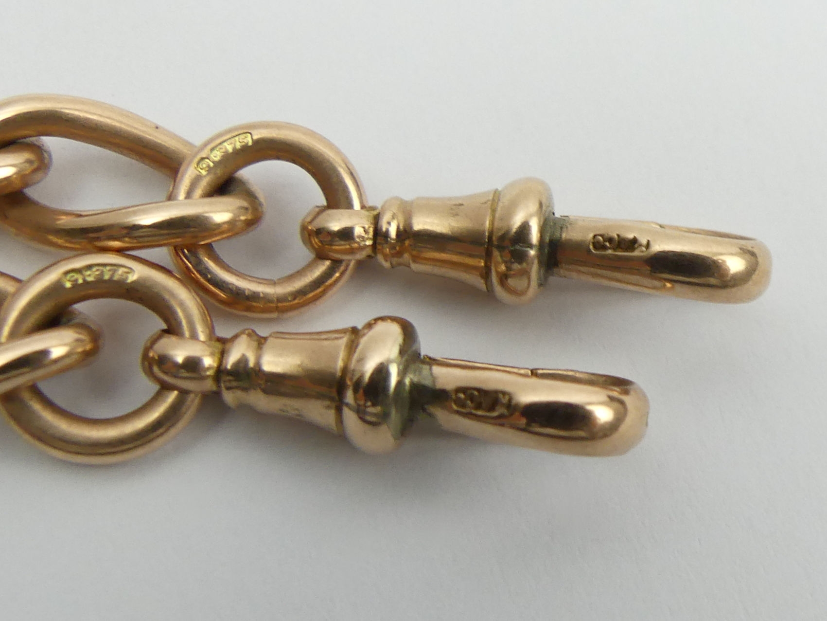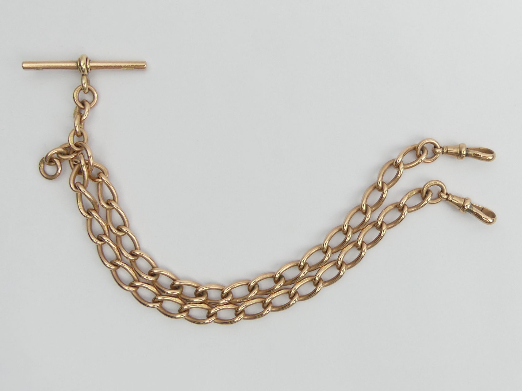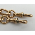 9ct rose gold curb link double clip pocket watch Albert chain, 51.1 grams, 38cm long, 7.3mm wide. UK Postage £12.