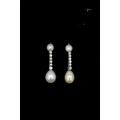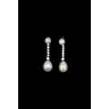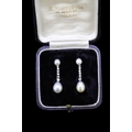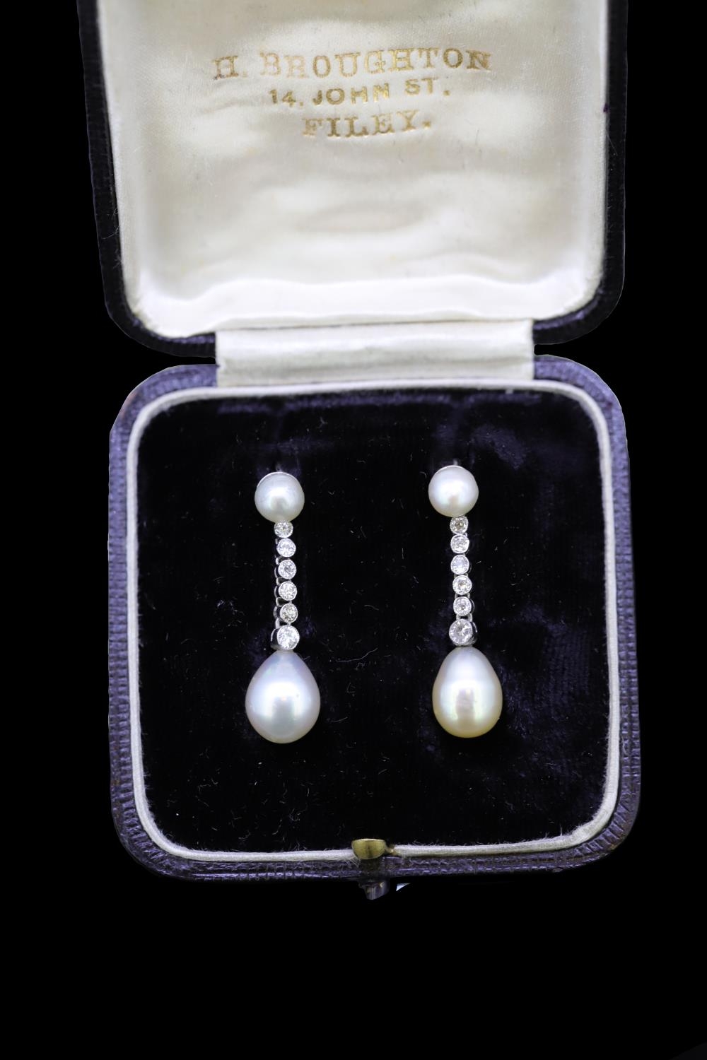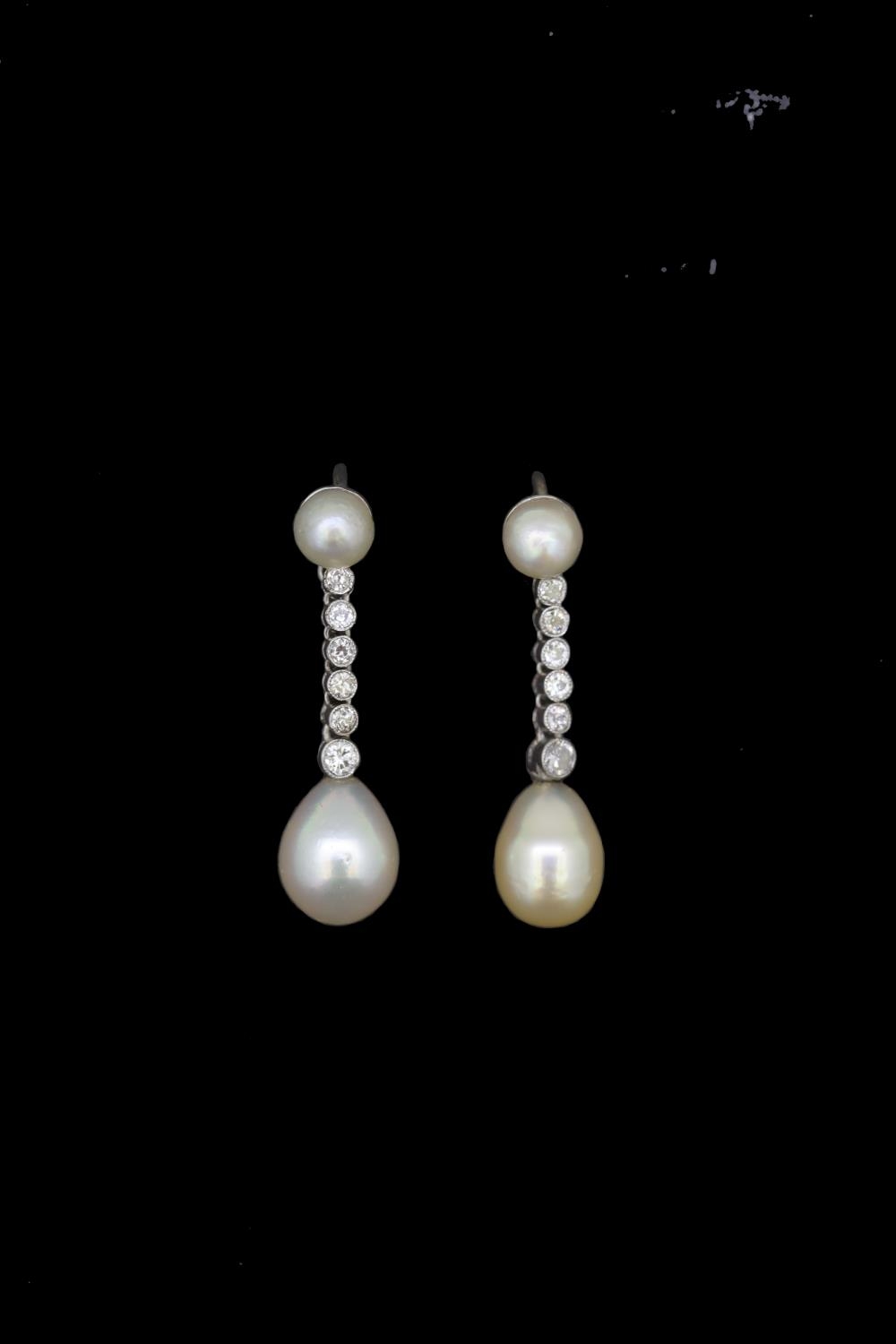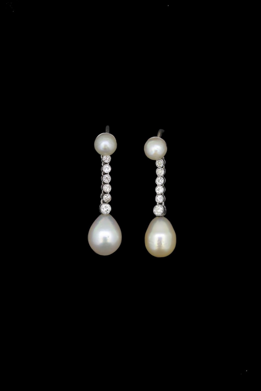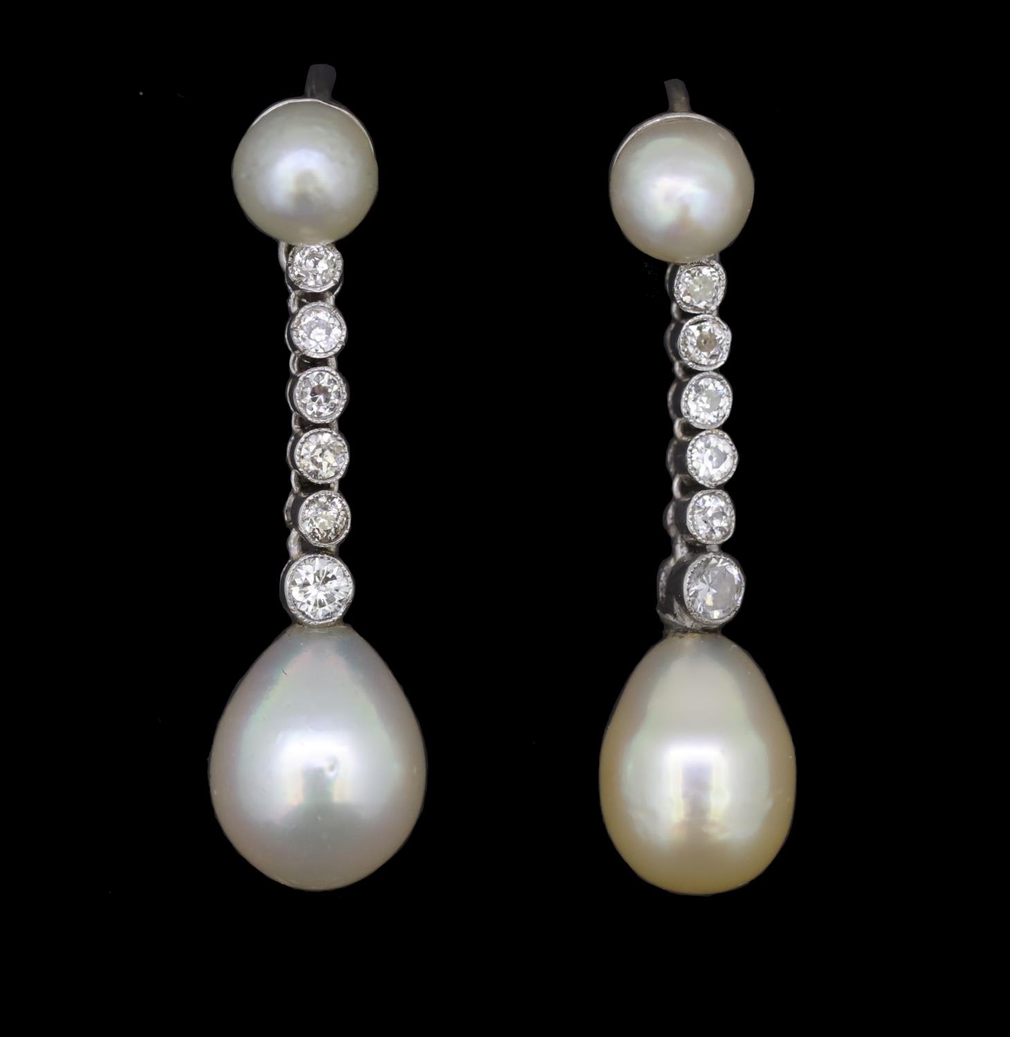 IMPORTANT PAIR OF NATURAL PEARL AN DIAMOND DROP EARRINGS, set with a pearl top, suspending a 6 diamond drop, holding a large pearl. L. 2.9 cm. 4.3 grams. With a fitted box. Accompanied by GCS London report No. 79196-39 stating that the 4 pearls are natural, Saltwater. Pearls approx: (5.2-5.3 x3.7 mm). (5.3-5.4 x 3.7 mm.) (7.3-7.6 x 9.7 mm.) (7.9-8.0 x 10.1 mm).