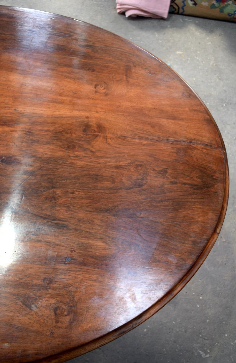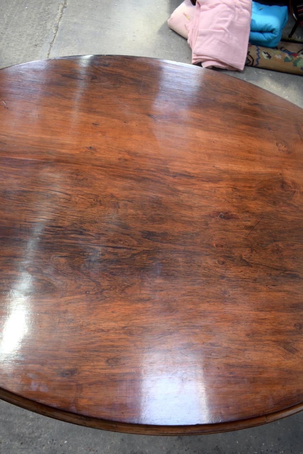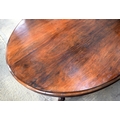A LARGE VICTORIAN ROSEWOOD BREAKFAST TABLE upon a scrolling acanthus capped base. 148 cm x 73 cm.
