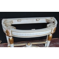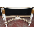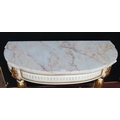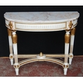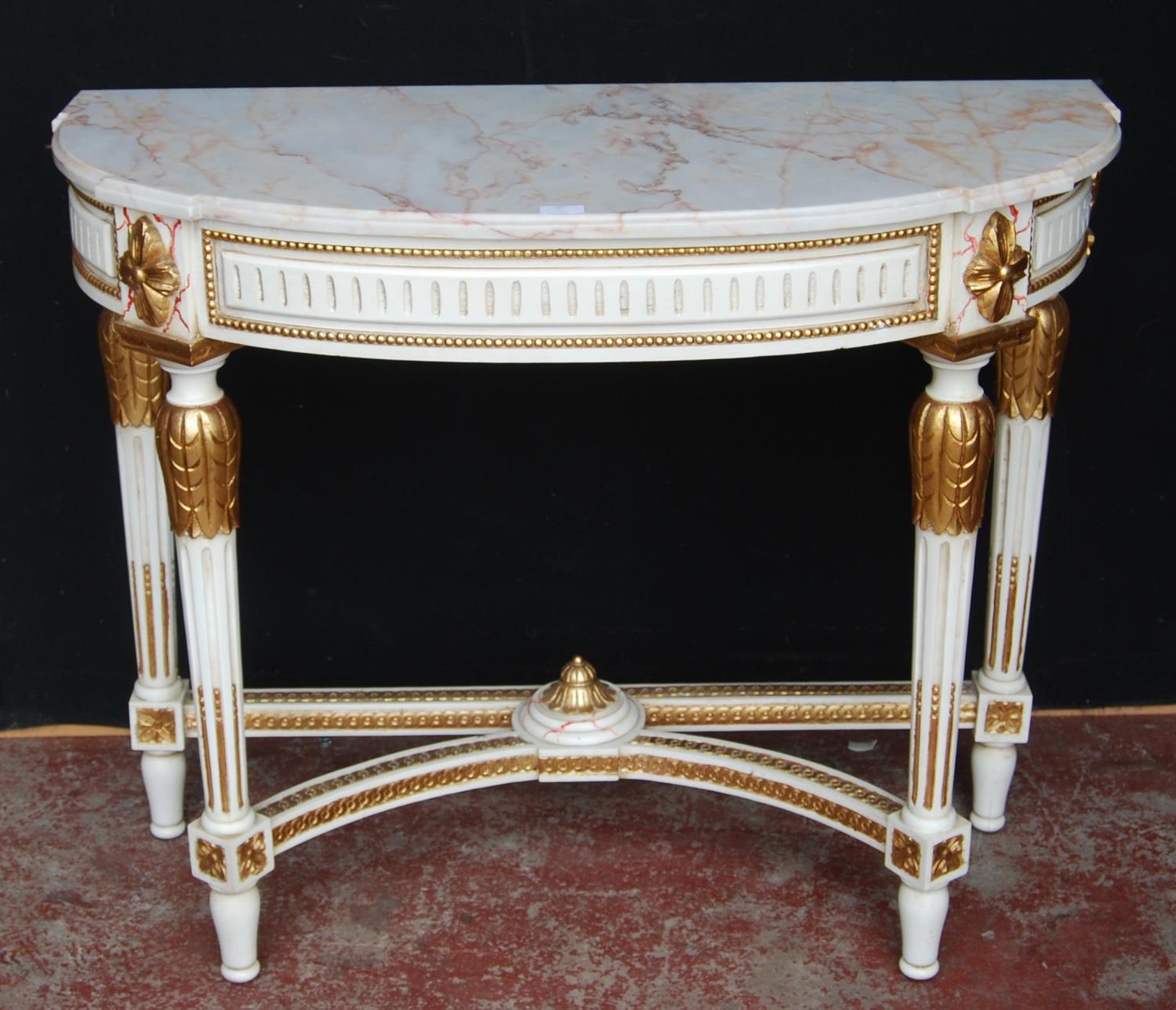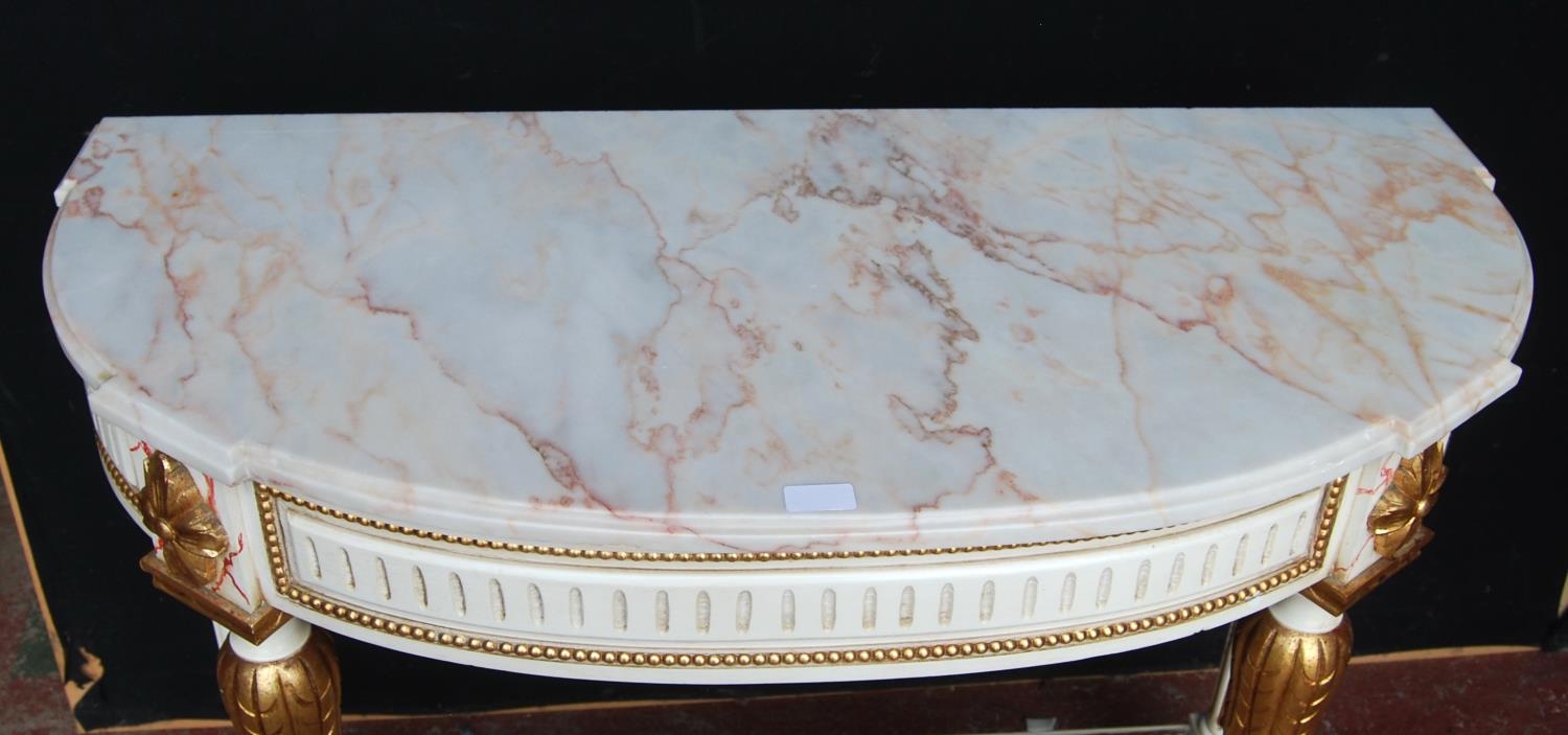 French-style painted console table, the demi-lune shaped top with detachable marble surface above applied floral mounts, on reeded supports with adjoining under stretchers, decorated with parcel gilt effect beading, mounts and appliques, 87cm high, 109cm wide and 50cm deep.