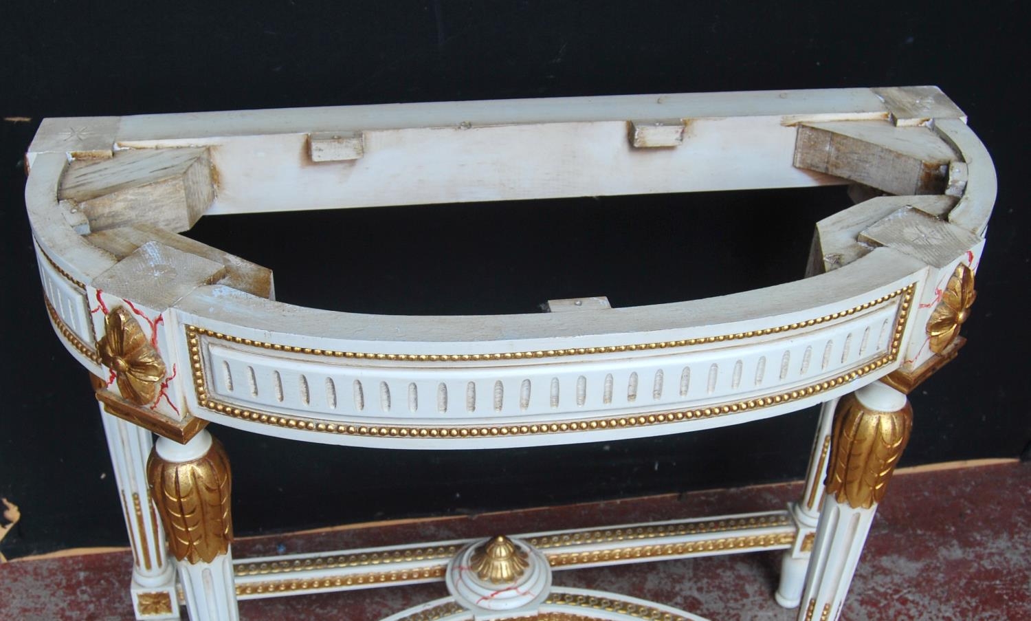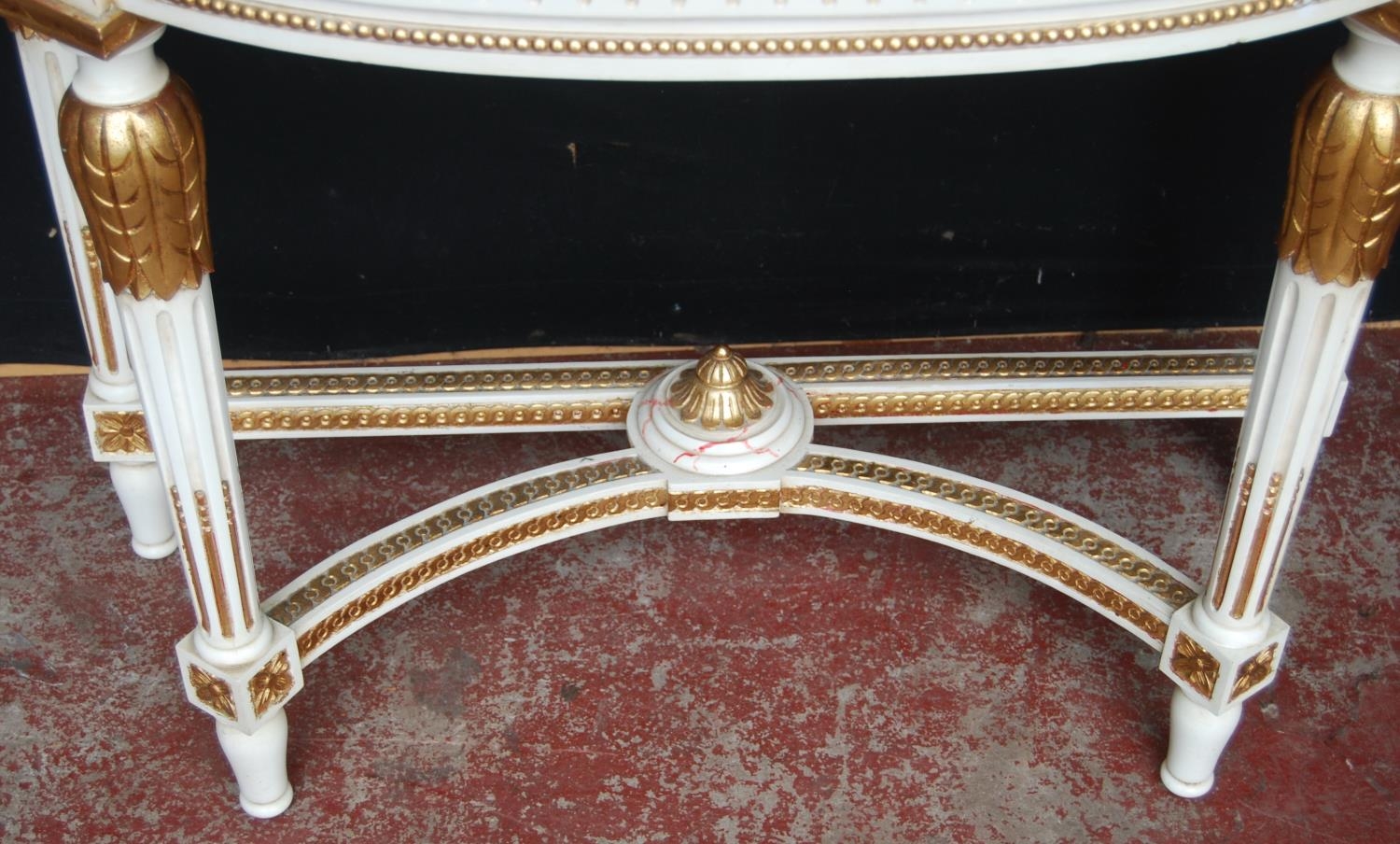 Visible scratches/scrapes to the marble top. There is a chip to the left corner of the marble. There is a crack to the back left foot. There is visible staining and colour fading to paintwork. There is some paint losses to the gilt decoration.