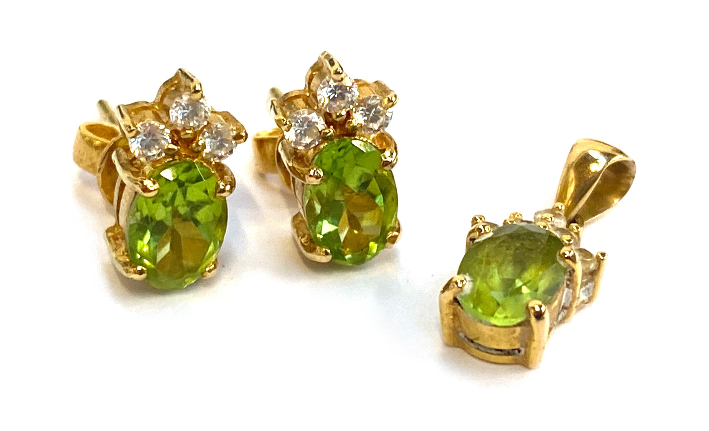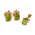 A pair of 14ct gold, CZ and peridot stud earrings, 1cmL, and matching pendant, gross weight 4.1g