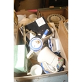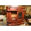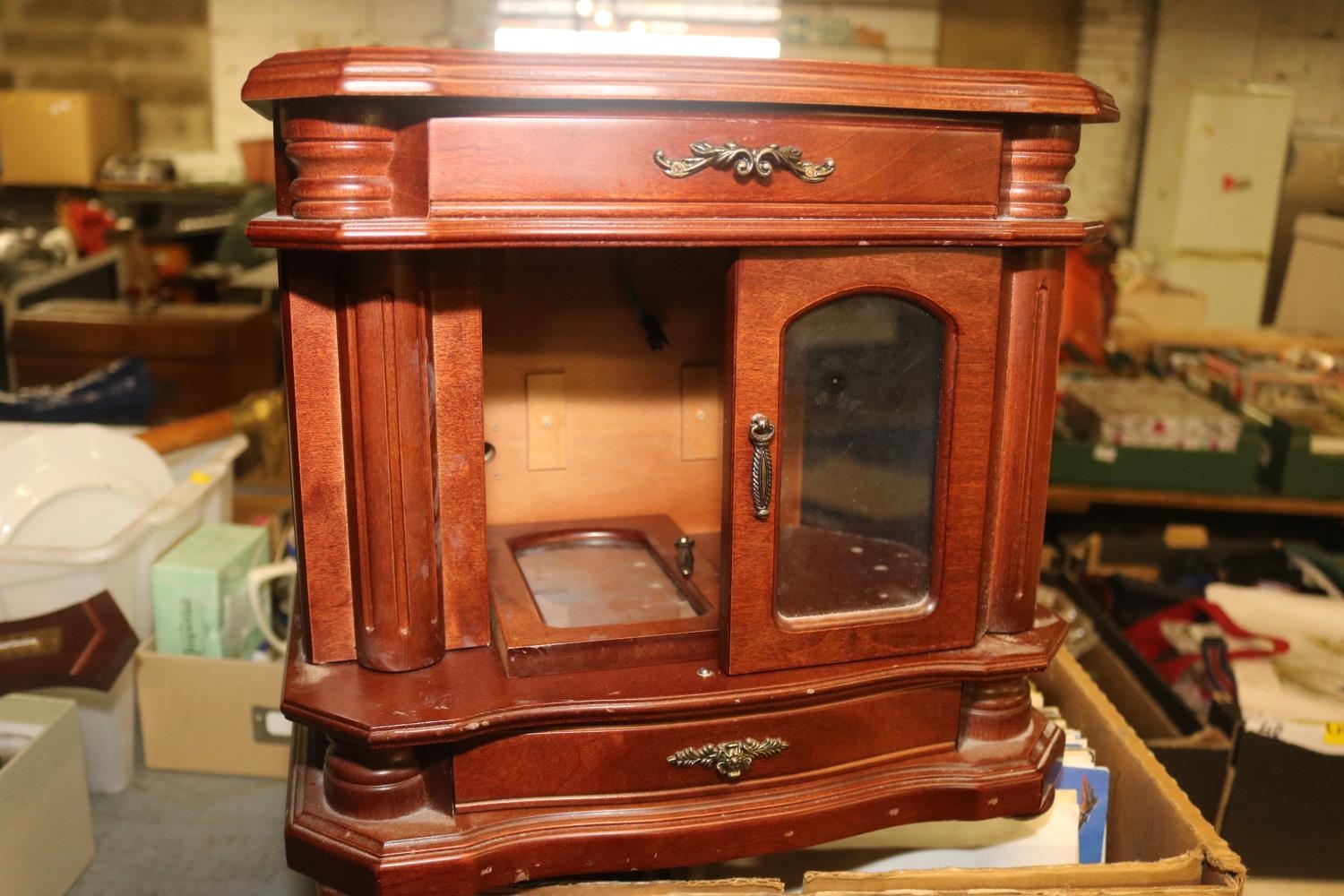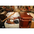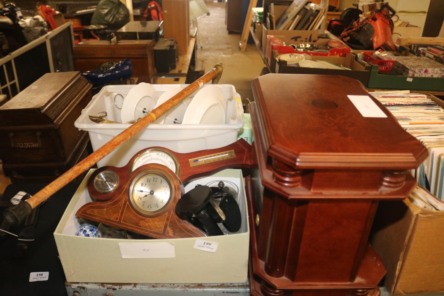 3 BOXES OF COLLECTABLES/WALKING STICK & SMALL DISPLAY CABINET (A/F)