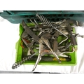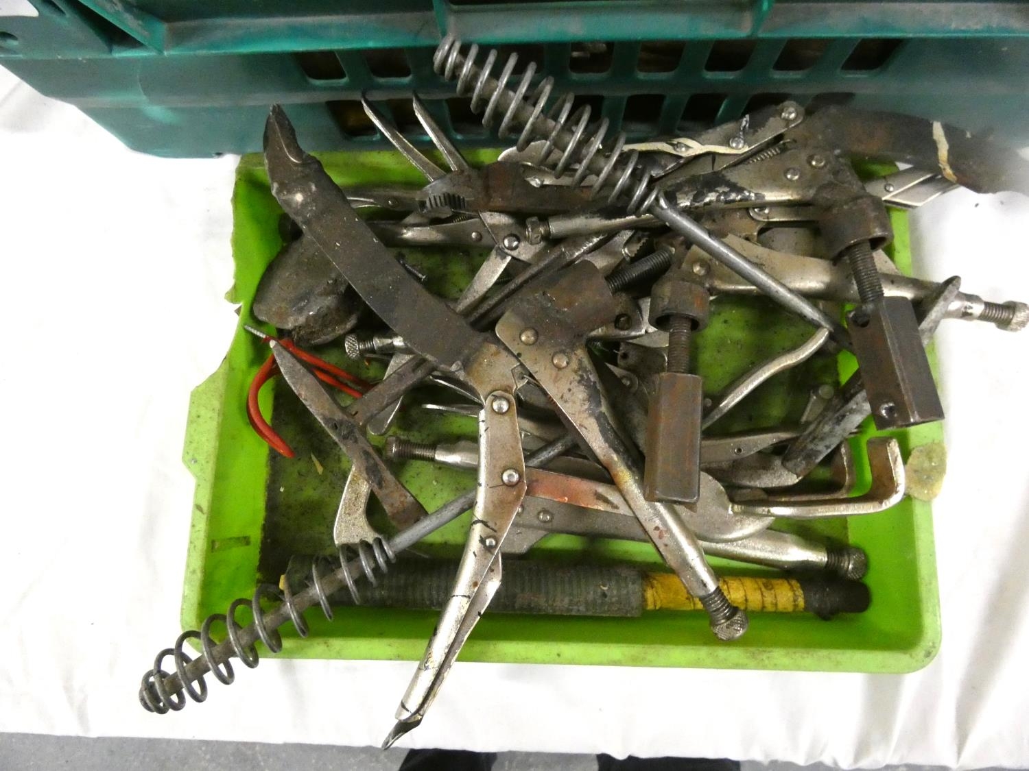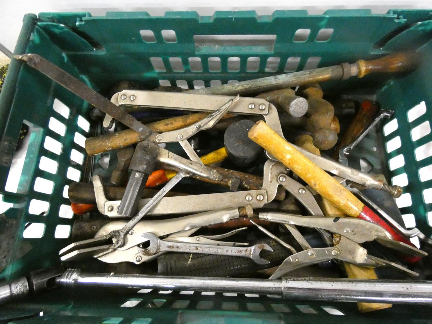 Crate of hand tools including hammers, welding clamps etc.