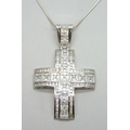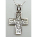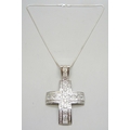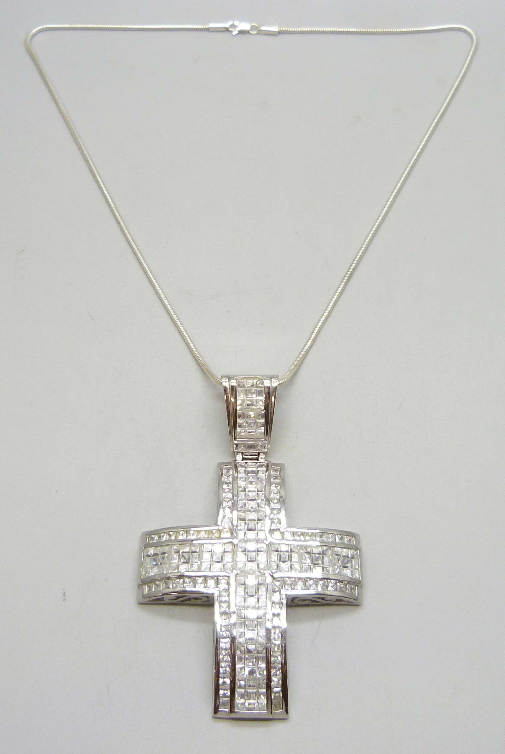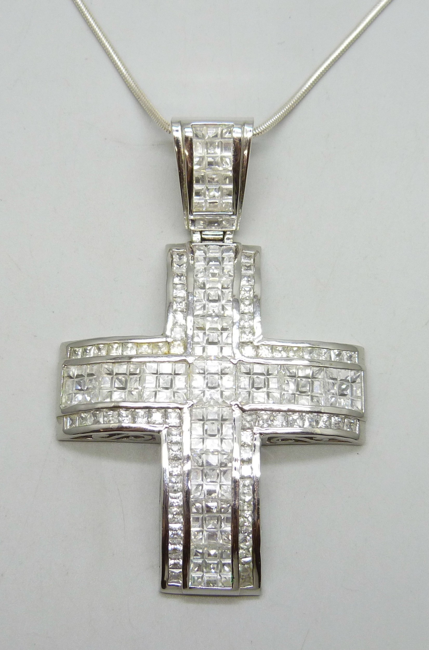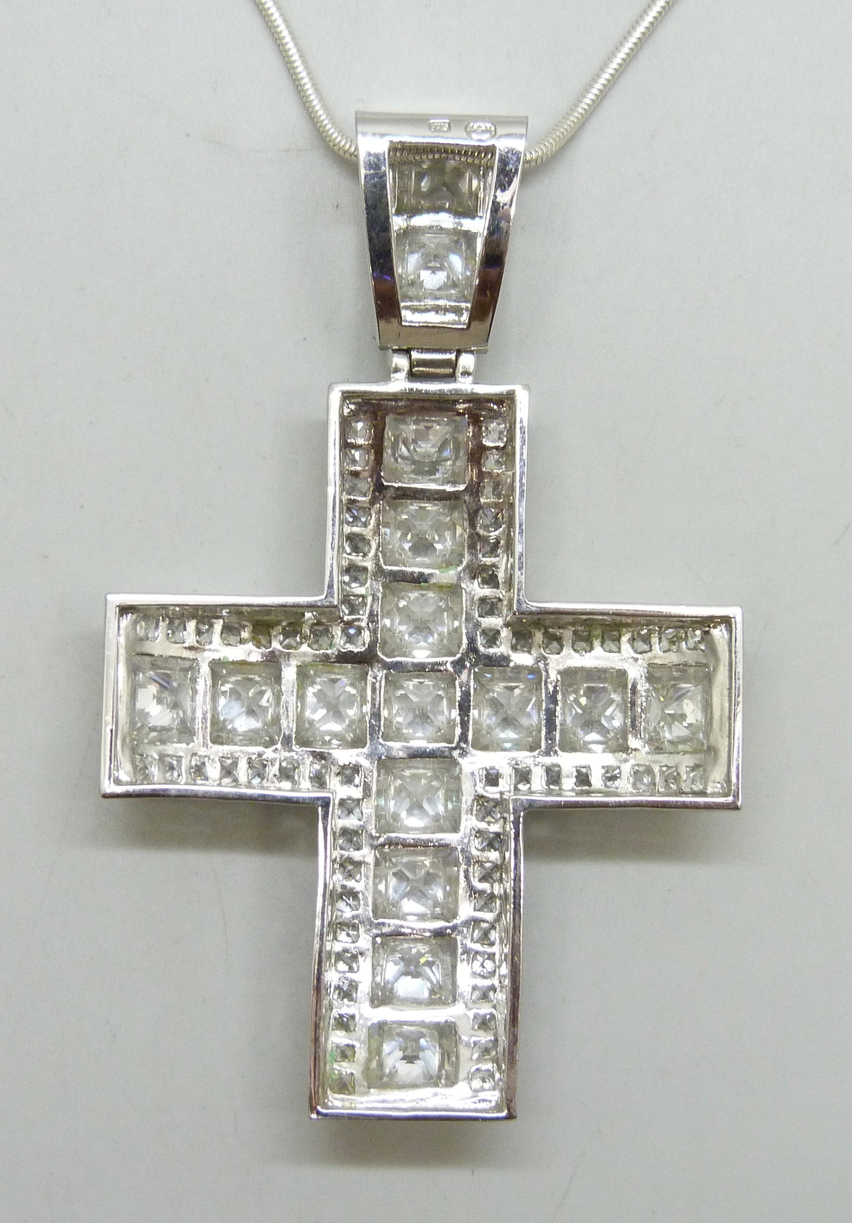 A large silver stone set cross pendant, on a silver chain, 83g total, 10cm including bail