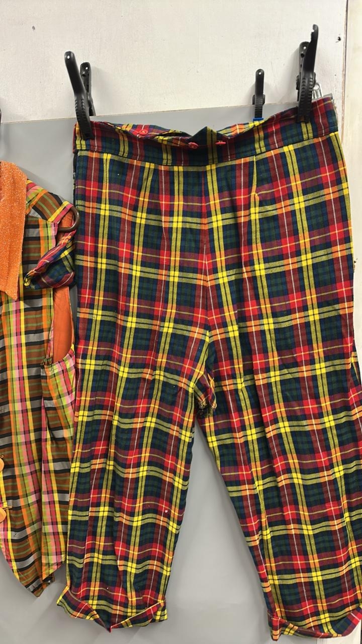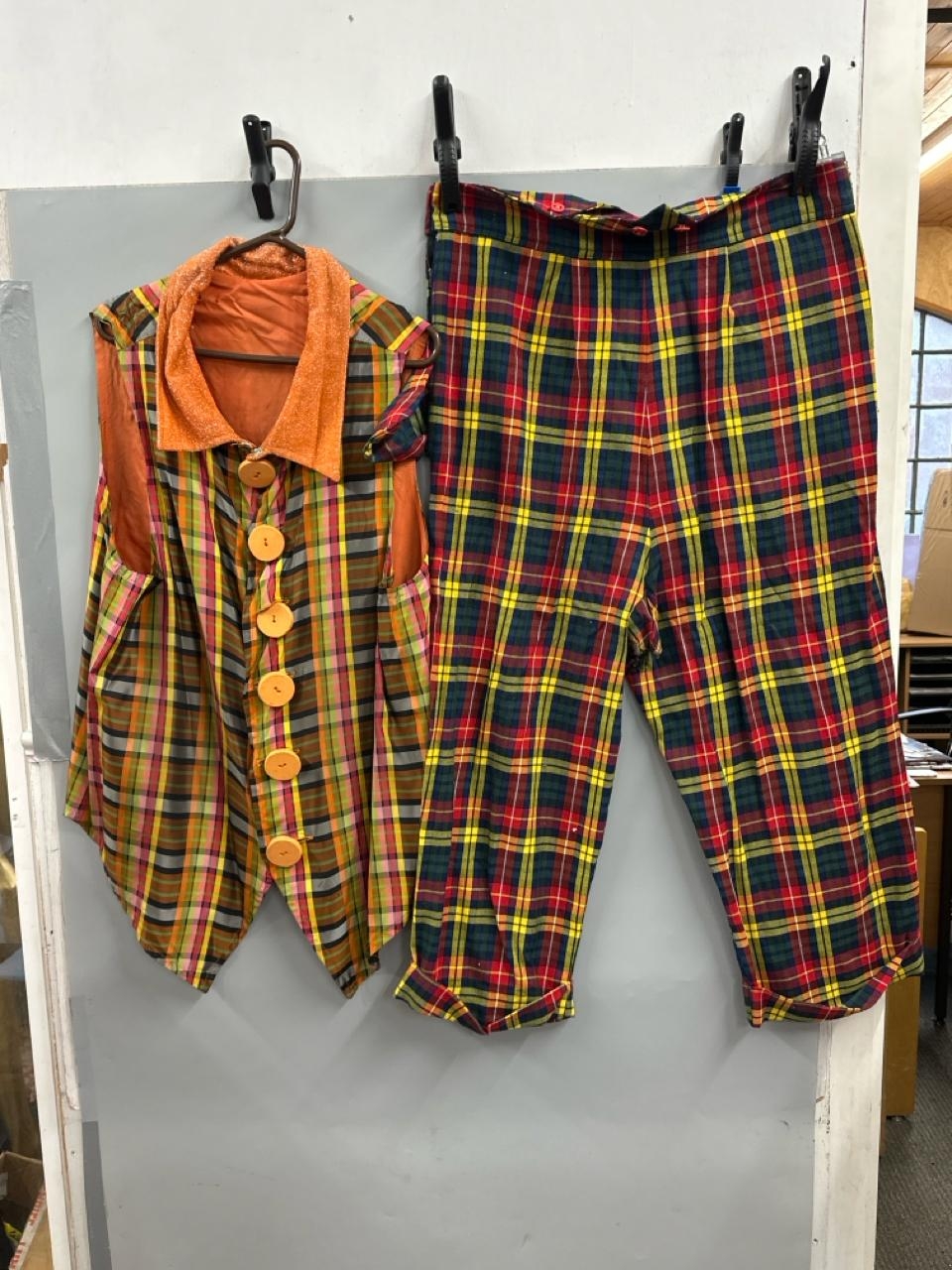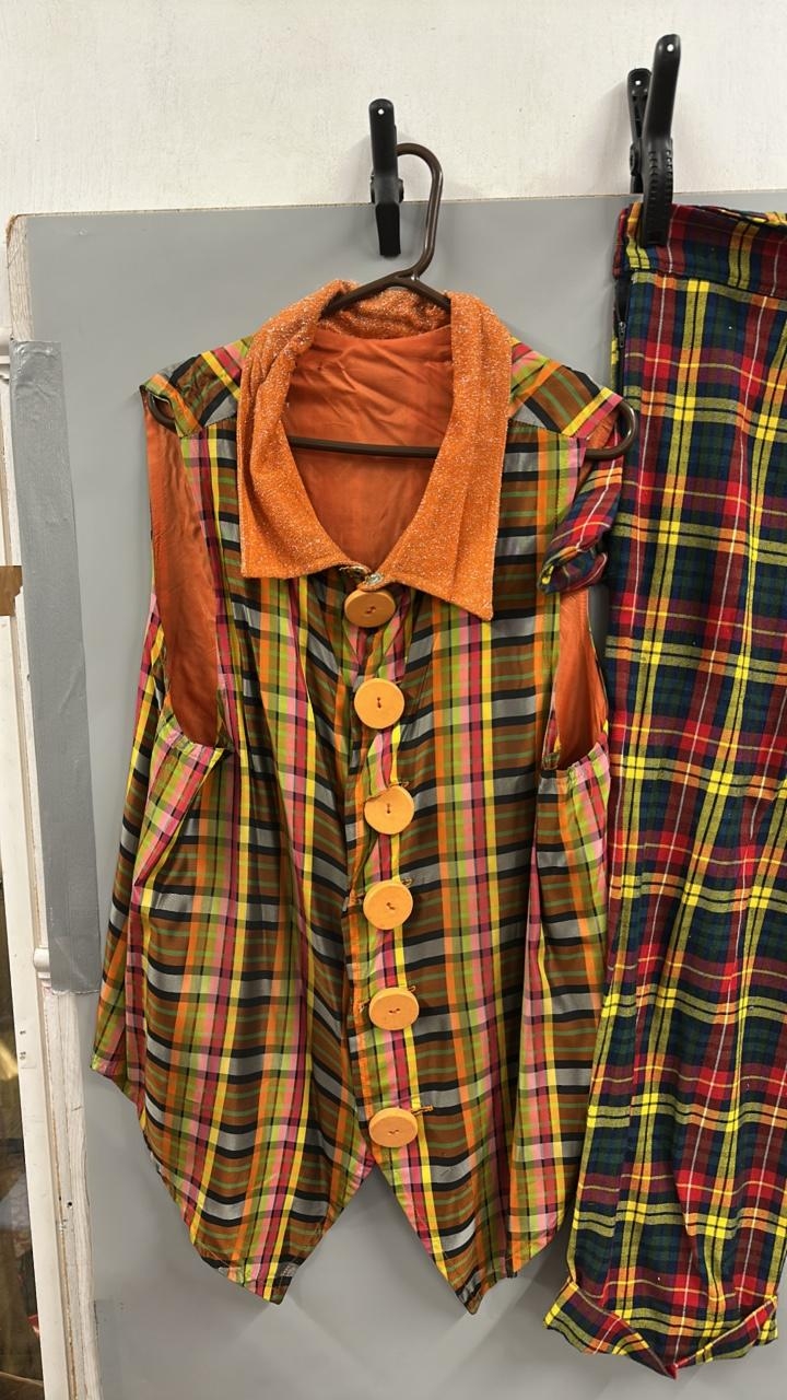 Stage worn clown costume including waistcoat with oversized buttons and trousers / Rail 4