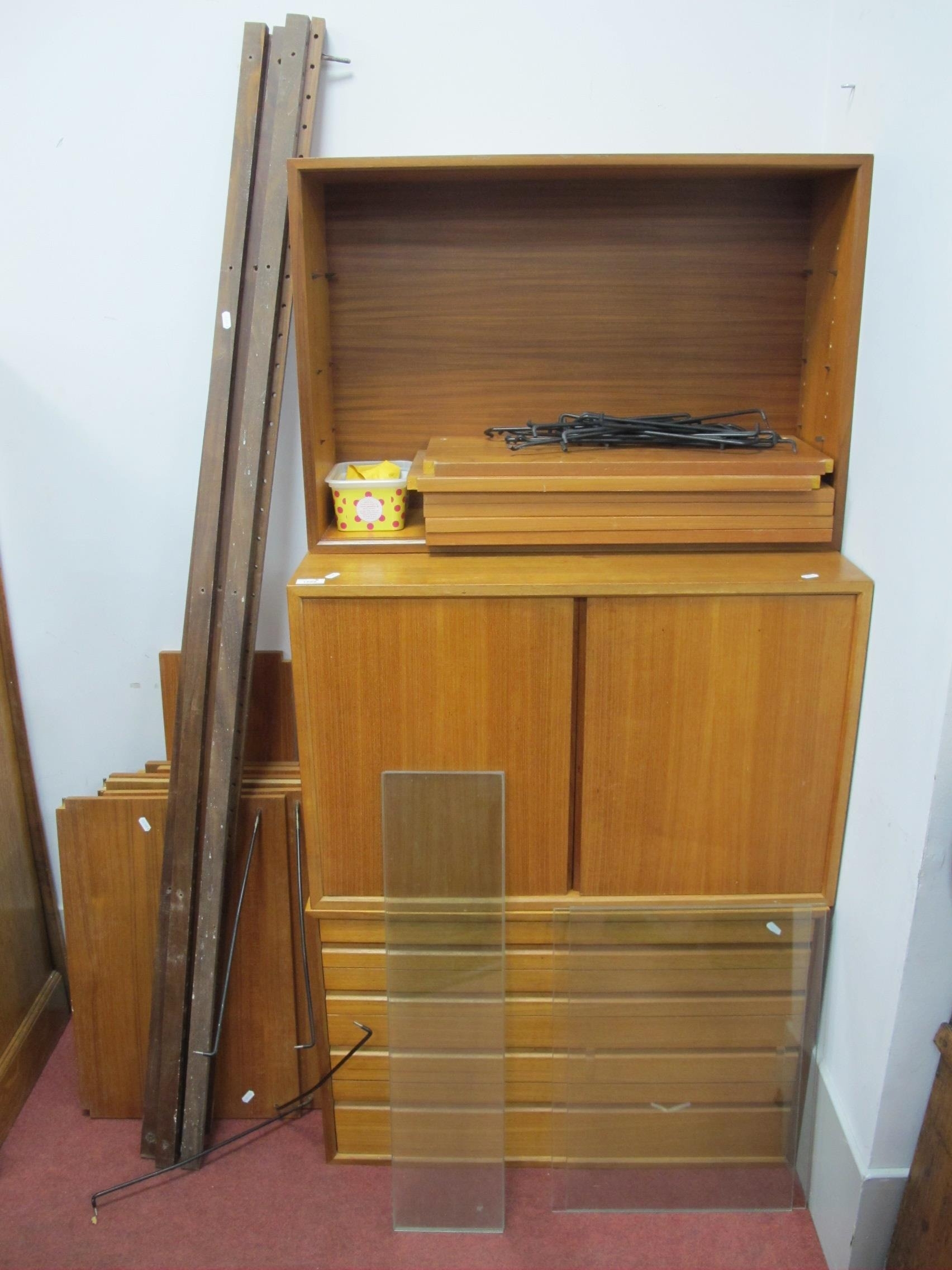 Teak Circa 1960s Stacking Units, possibly Poul Cadovius Design Danish Royal System, 80cm wide, two door cupboard, labelled "128.600? Control No" and four drawer chest, both 51.5cm high and twin glazed doored cupboard 56.5cm high, various 60cm wide shelves and black metal fittings and six vertical wall attachment strips 186cm high.