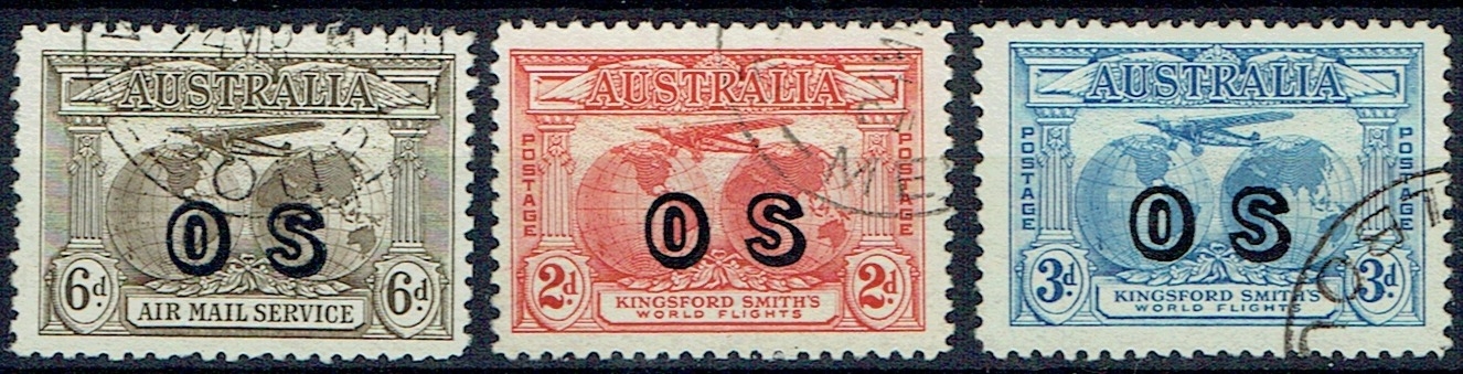 AUSTRALIA - OS Overprints on Fokker 2d & 3d, plus 1931 6d air all cds used, SG 139a, O123/4.