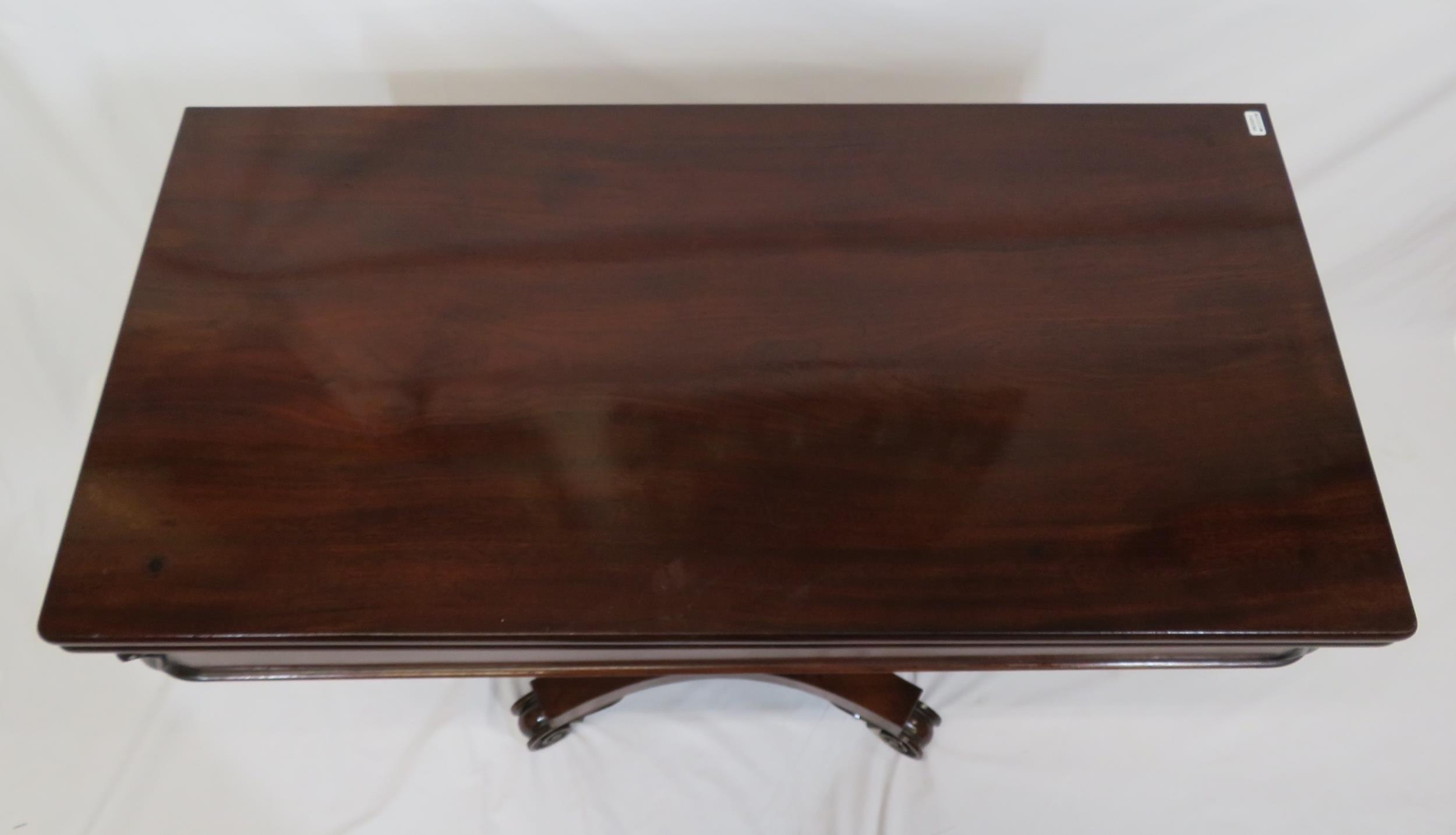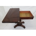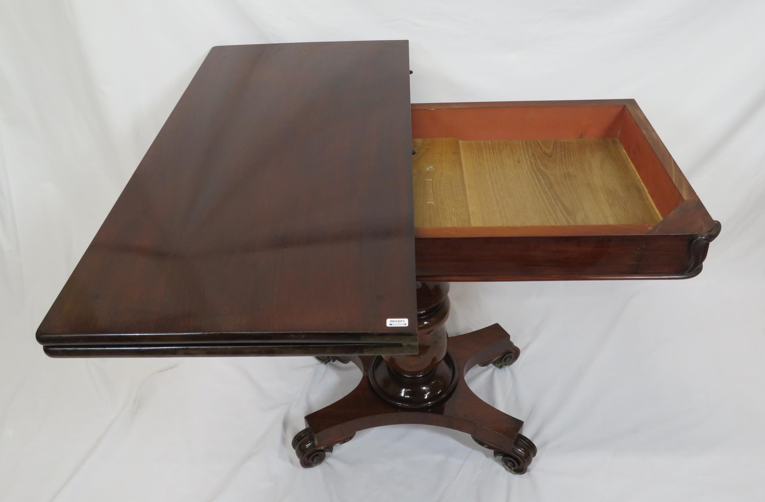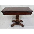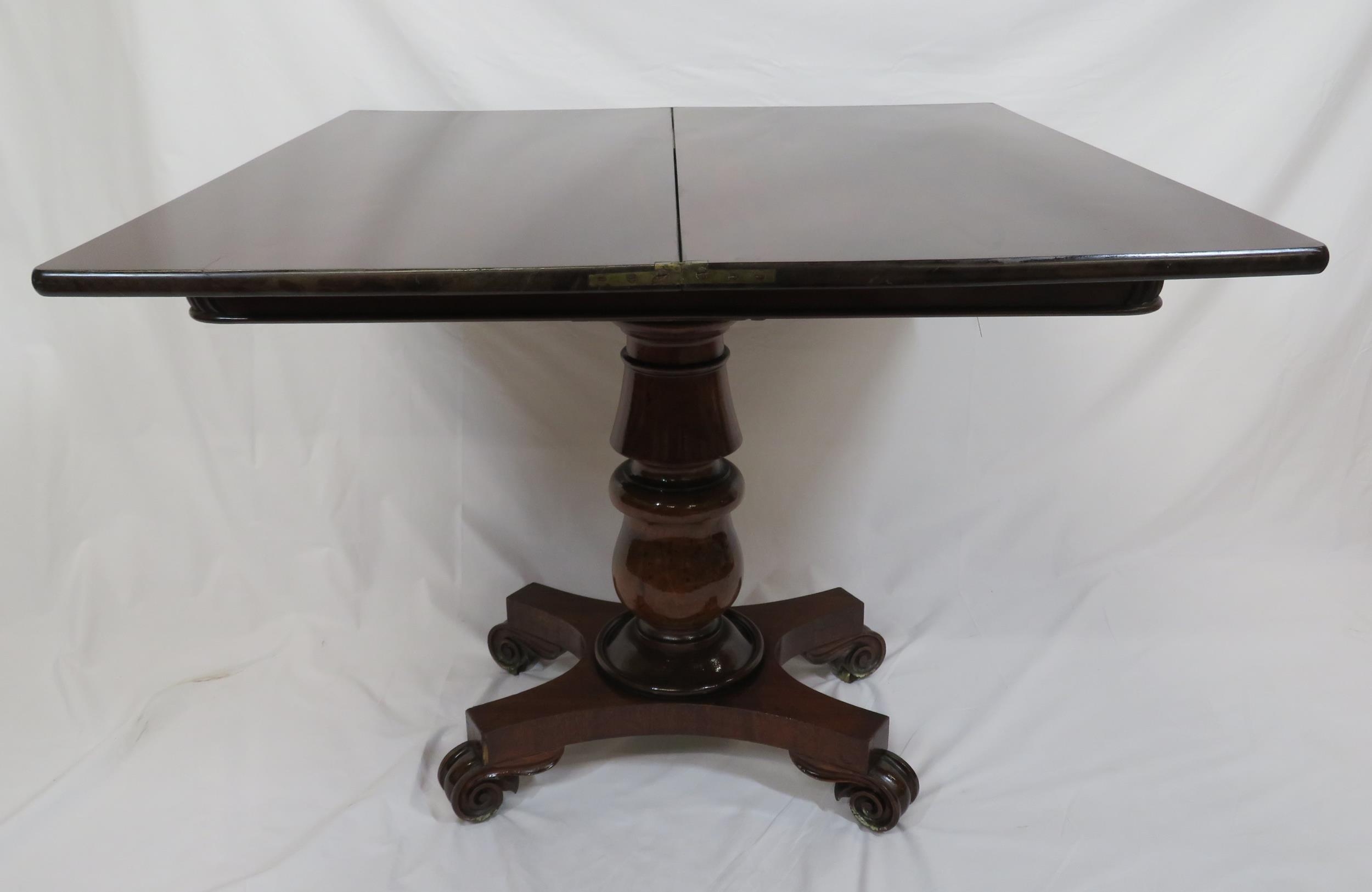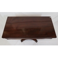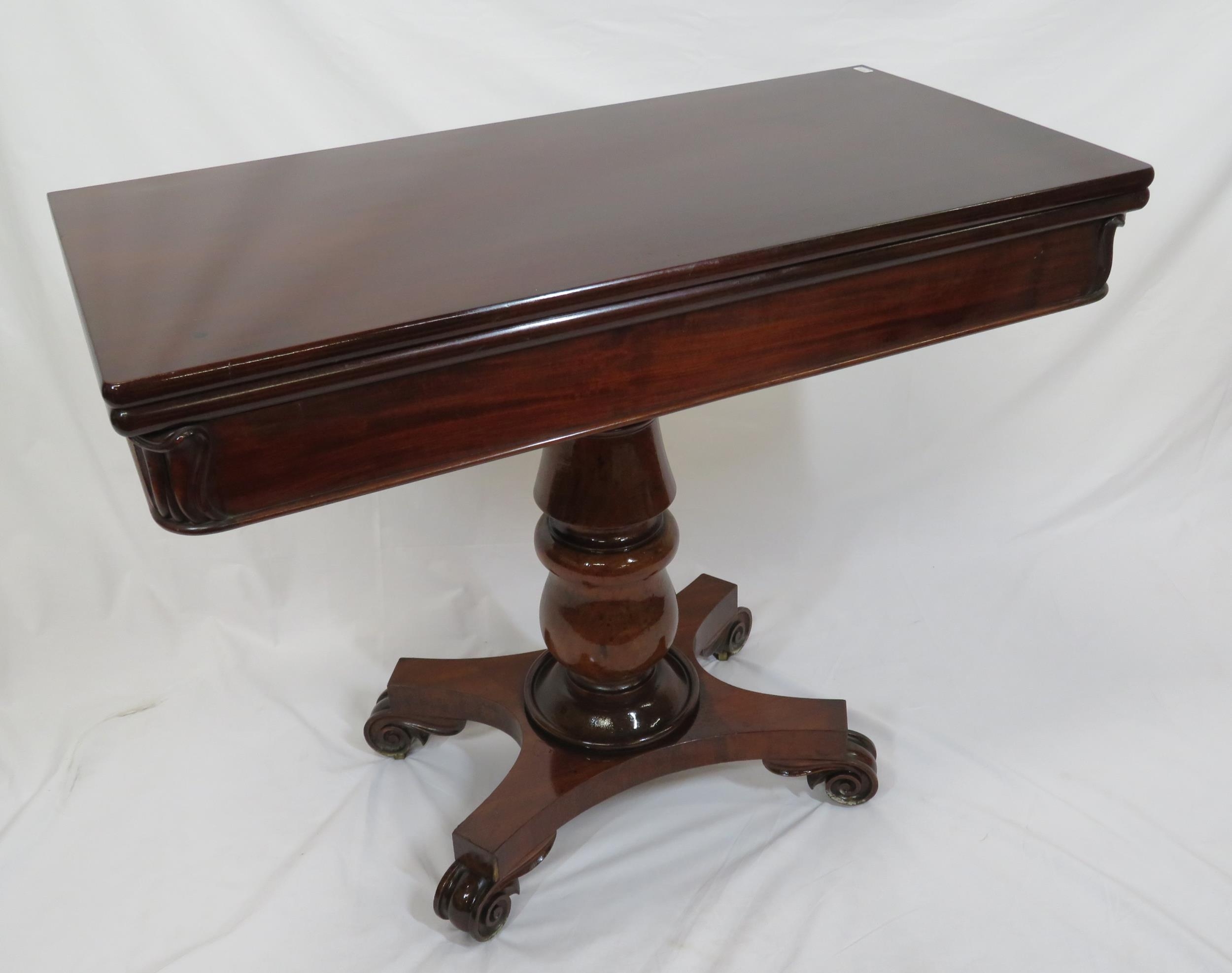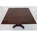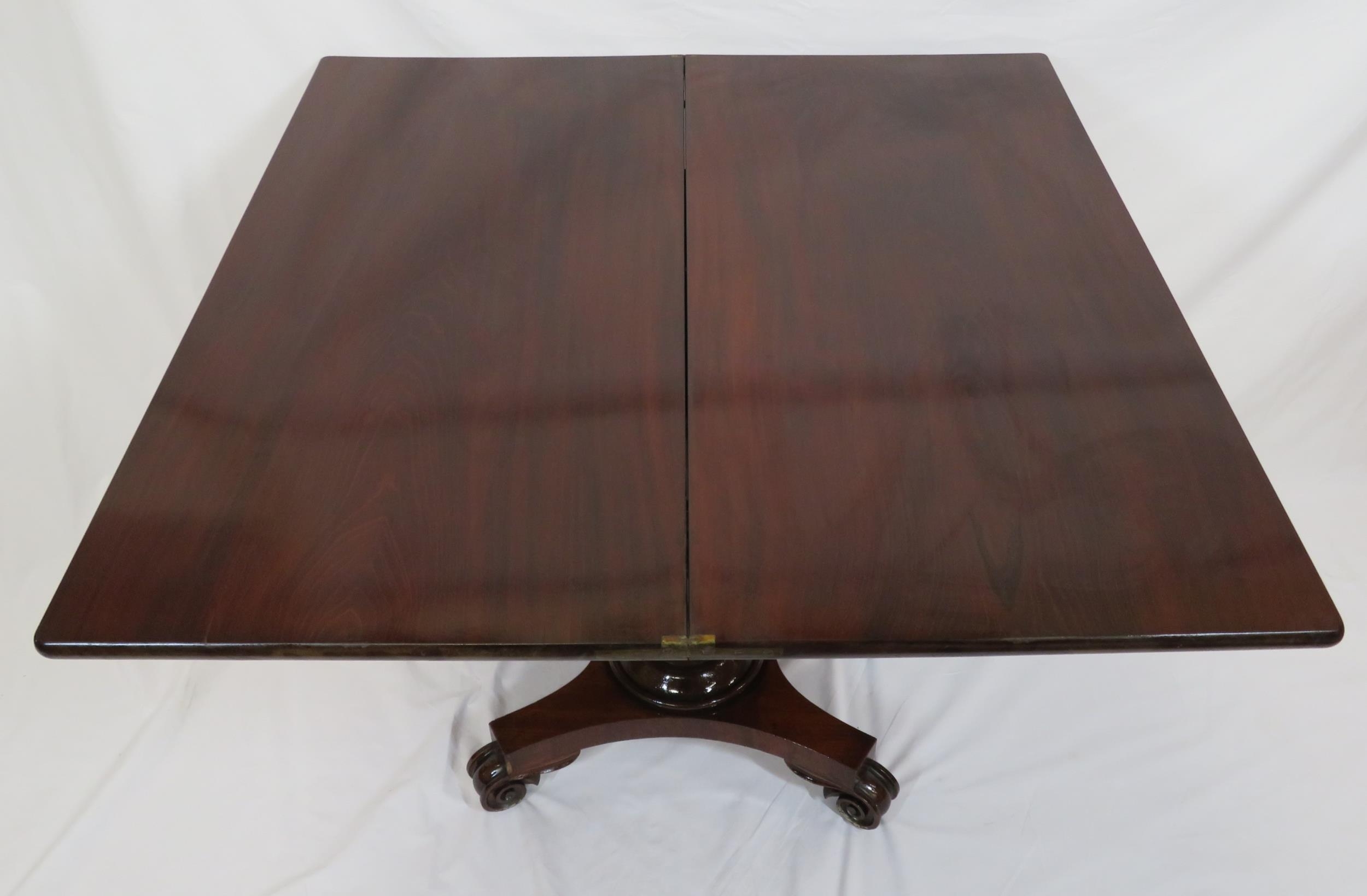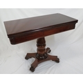 Victorian mahogany tea table with triple fold-over top, raised on tapering and ball turned column with round collar, on concave plinth with scroll feet