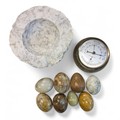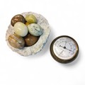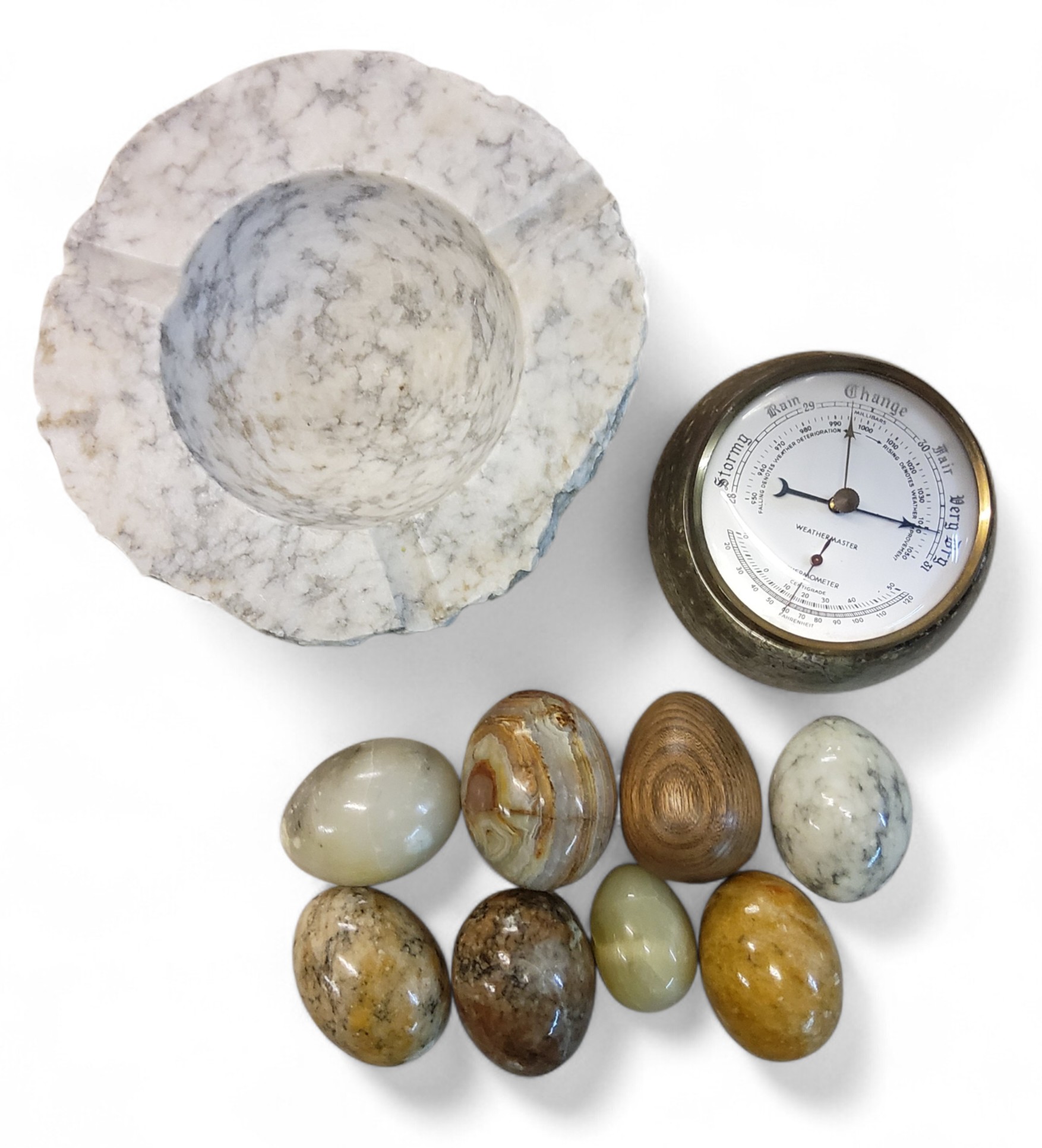 A Weathermaster aneroid barometer/thermometer, set in Cornish Serpentine stone, 12cm diam; an Italian white and grey marble ashtray, 19cm wide; onyx and other hardstone eggs