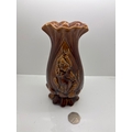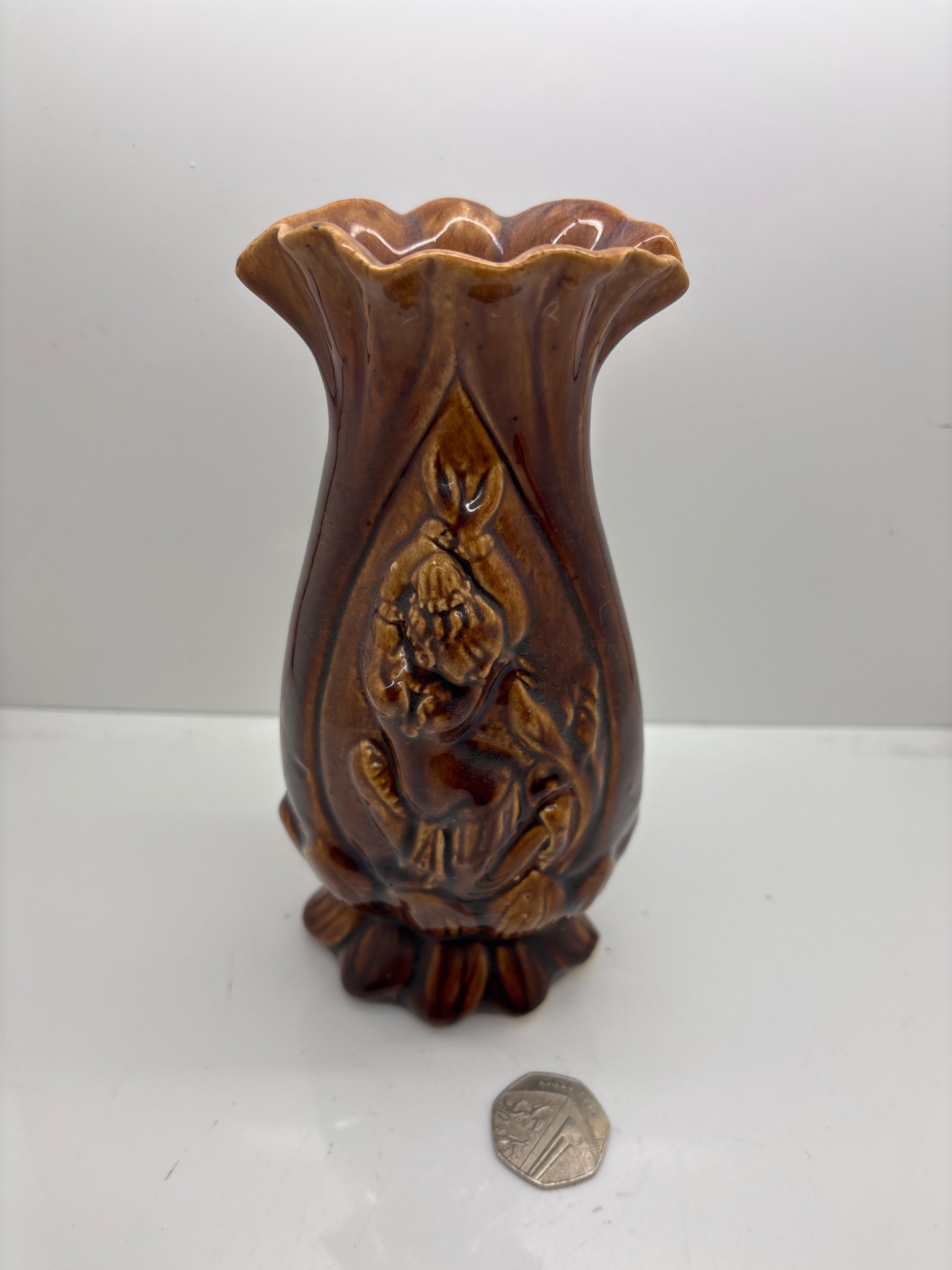 Brown ceramic vase with floral relief design. Approximately 6 inches tall, in good condition.
