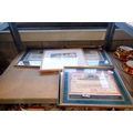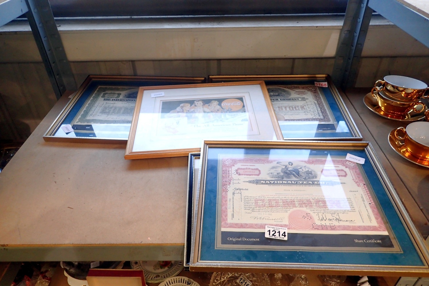 Three framed share certificates, early Coca Cola print and print of Barry Mcguigan. Not available for in-house P&P
