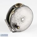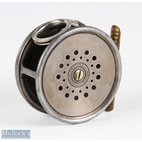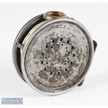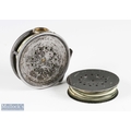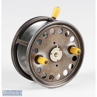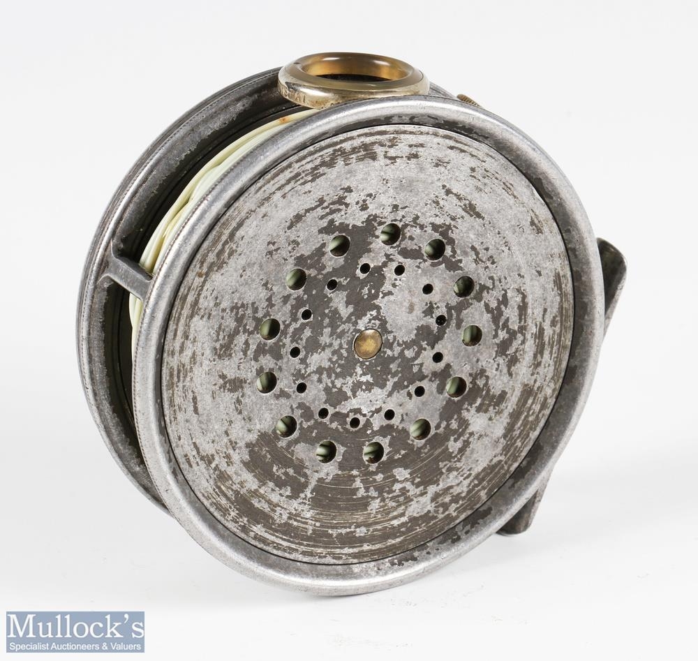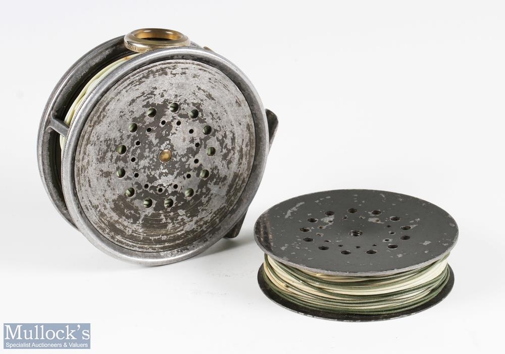 Hardy Bros alloy Perfect trout fly reel and spare spool, 3 7/8" spool, black handle, straight line stamped logo, small and large perforated spool, milled rim tensioner, alloy foot, clear agate line guide