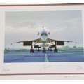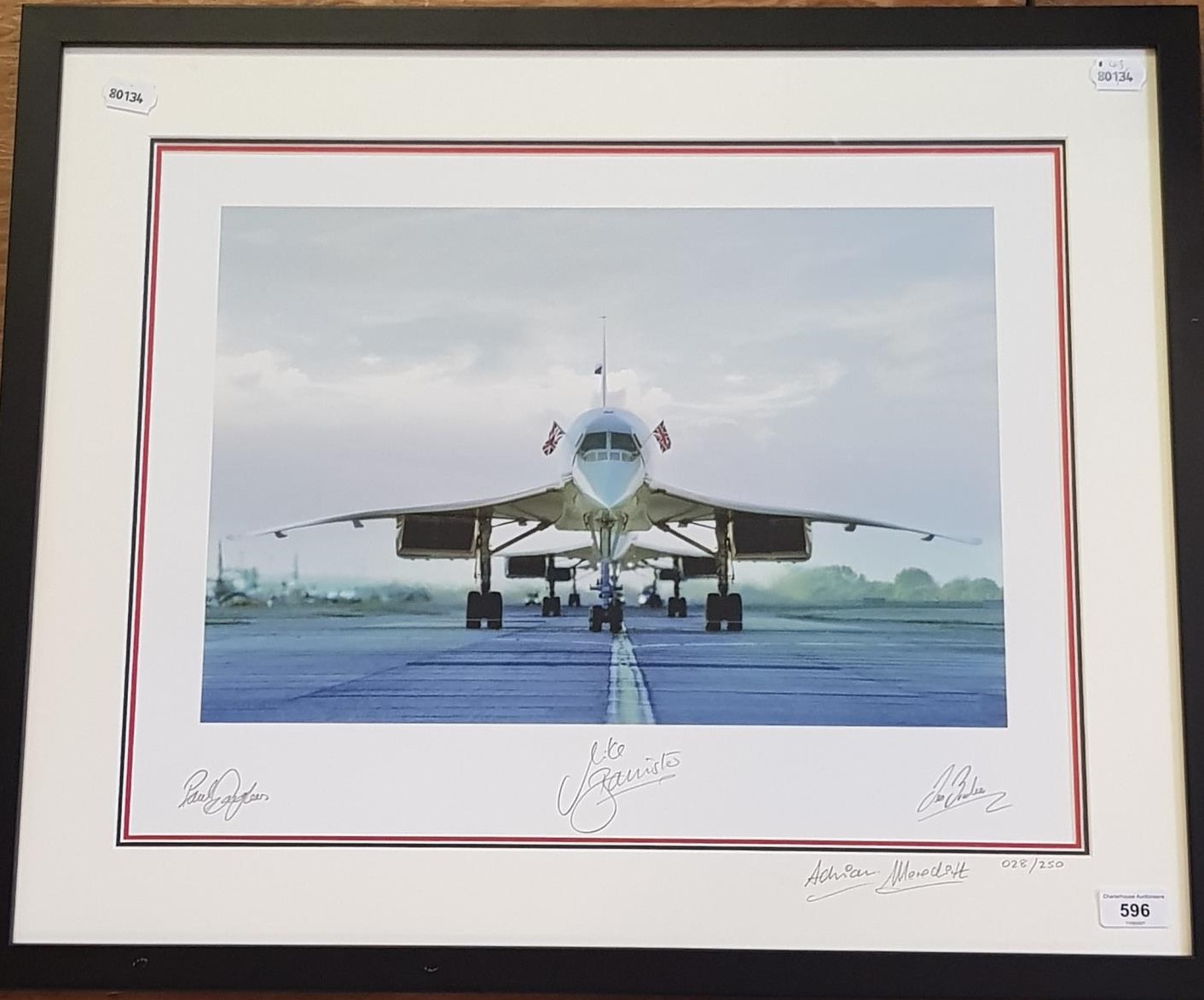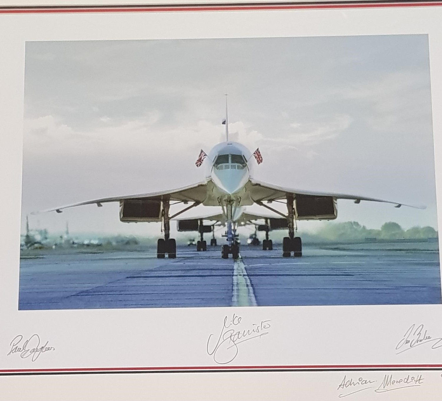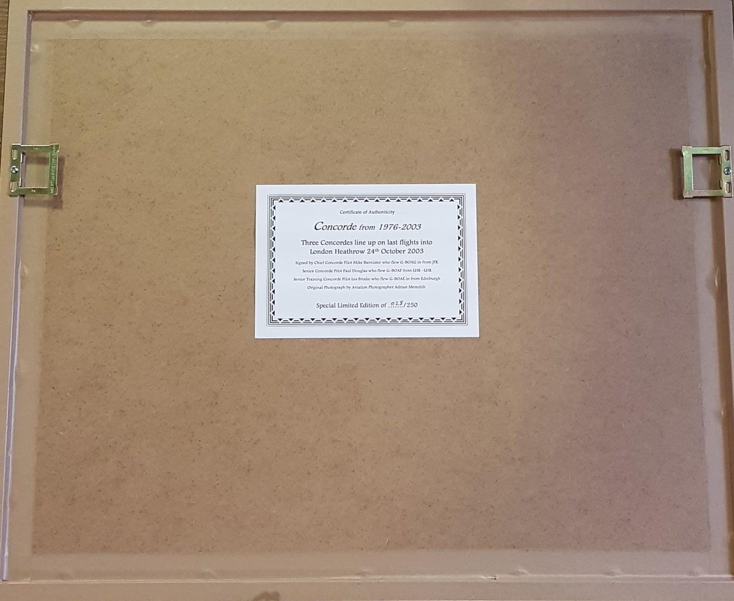 Concorde memorabilia: Concorde from 1976-2003, three Concordes line up on the last flight into London Heathrow 24th October 2003, photograph signed by chief Concorde pilot Mike Bannister, senior Concorde pilot, Paul Douglas, senior training Concorde pilot Les Brodie, photography by Adrian Meredith, 28 of 250, 40 x 52 cm