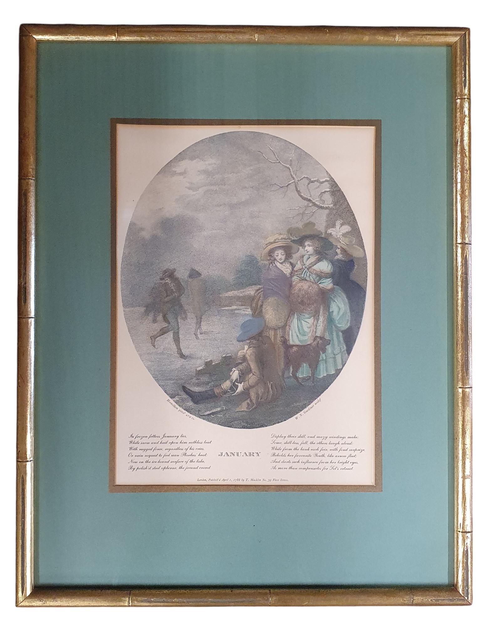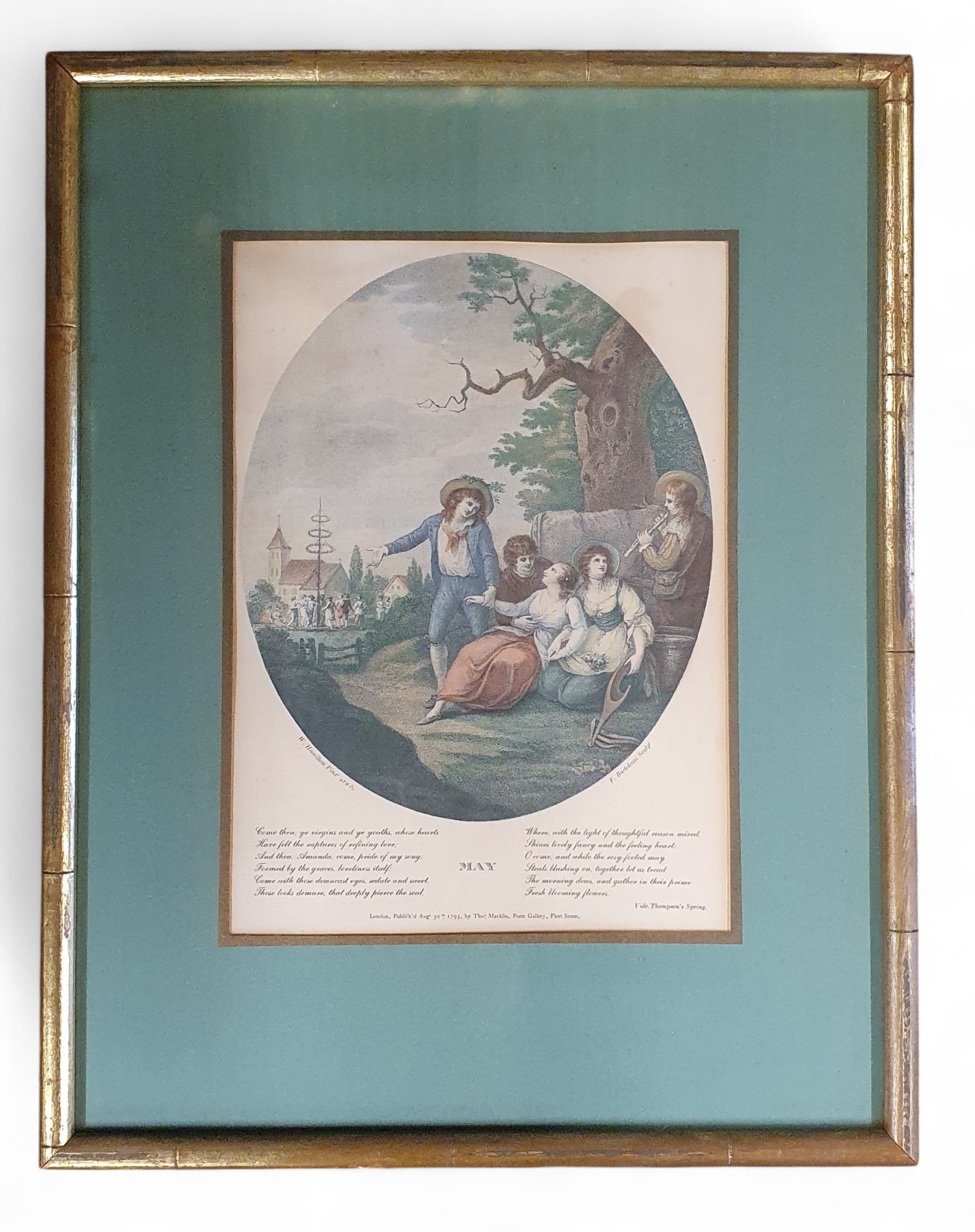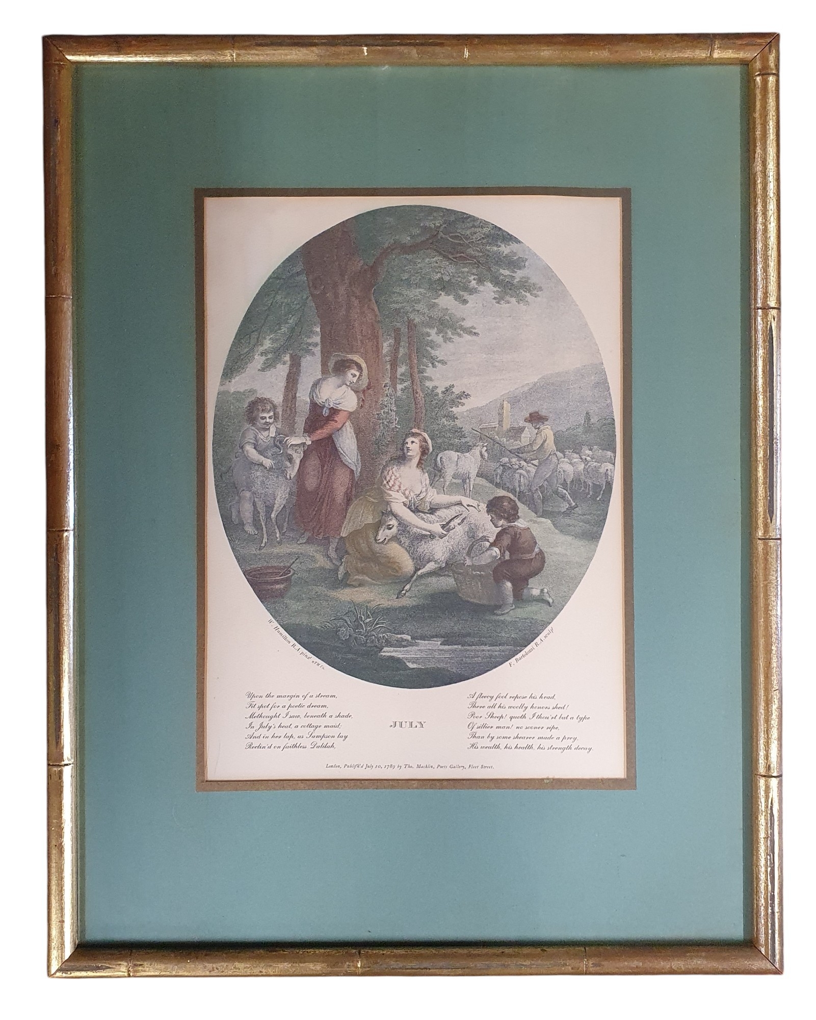 A good set of three 19th Century coloured Engravings after Bartolozzi after William Hamilton depicting January, May and July.