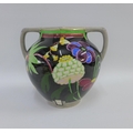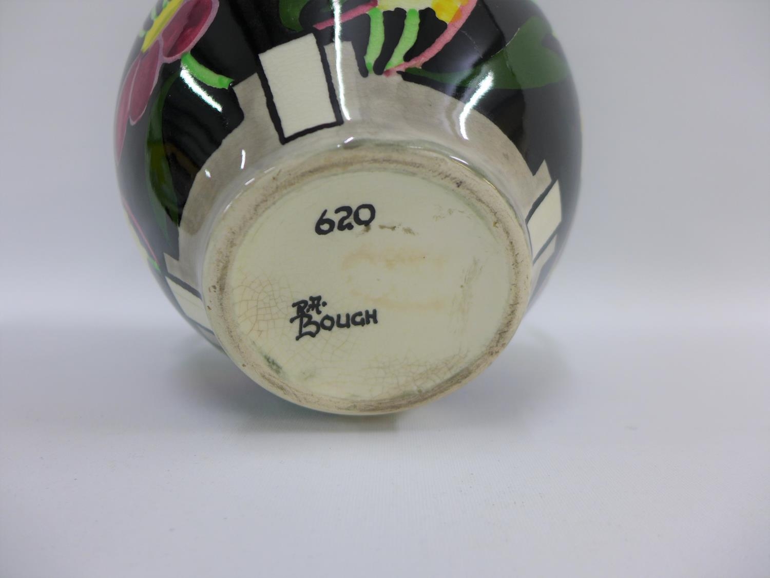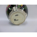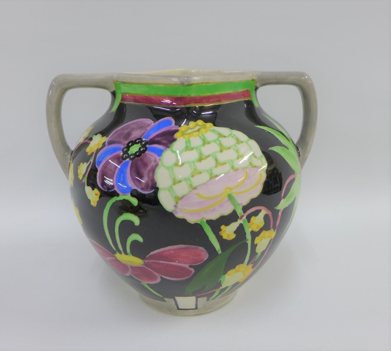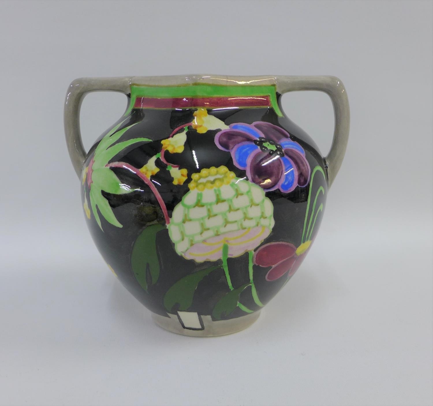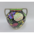 Bough Scottish pottery twin handled vase hand painted with stylised flowers to a black ground, number tot he base 620, 16cm high