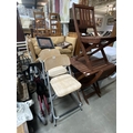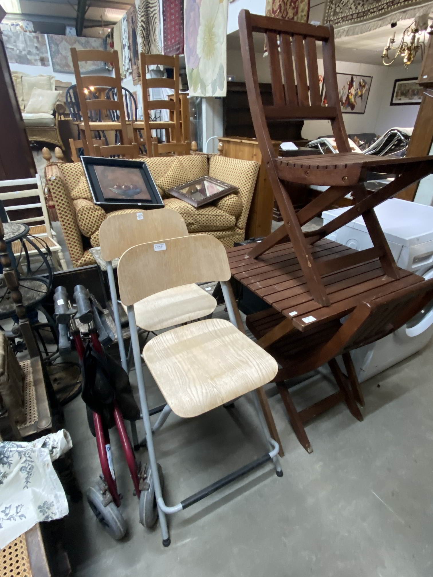 2 beech folding bar stools 38W & a teak garden table 75H 62W 62D with 2 chairs