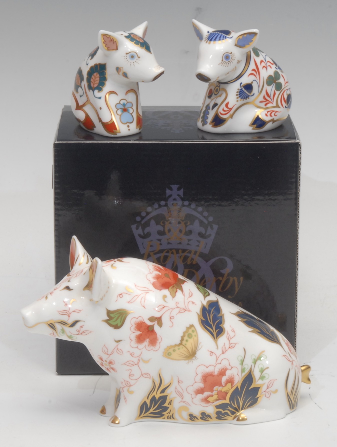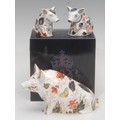 A Royal Crown Derby paperweight, Sitting Pig, gold stopper, 16cm long, printed mark in red, boxed; others, Sitting Piglet, gold stopper, 6.5cm, printed mark and Snuffle Piglet, gold stopper, printed mark (3)