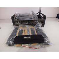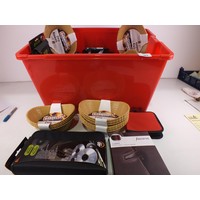 Two boxes of mixed items to include phone, radio, branded measuring tapes etc