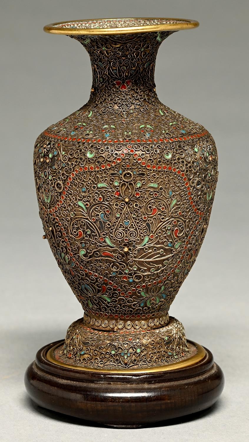 A Chinese brass and cloisonne enamel vase, early 20th c, 11.5cm h and a wood stand (2)