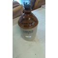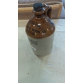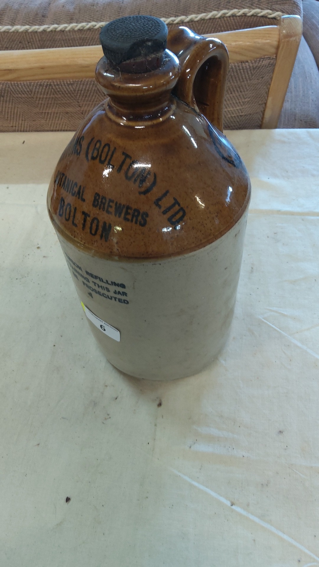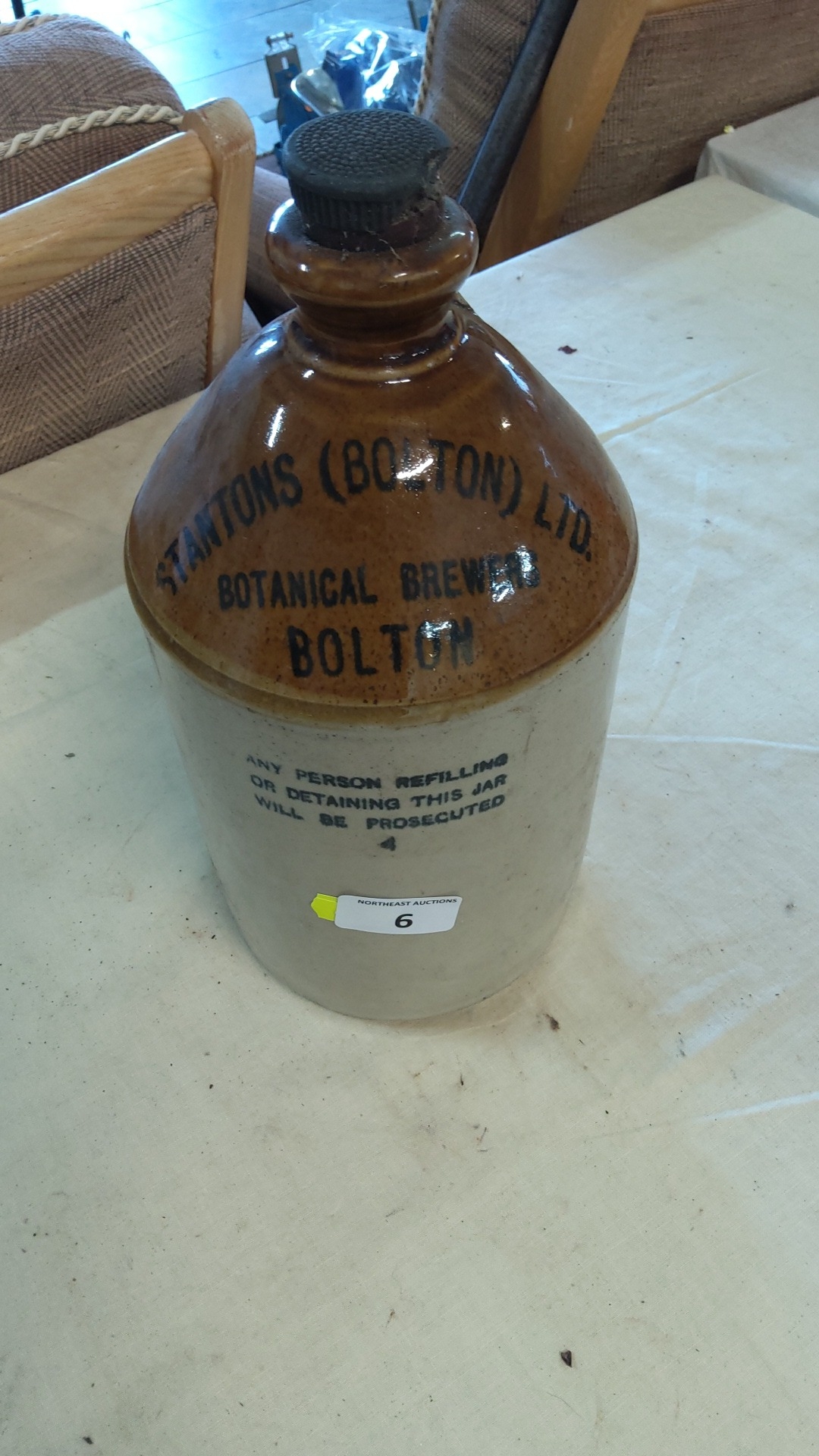 Two-tone salt-glazed stoneware flagon advertising “Stantons (Bolton) Ltd, Botanical Brewers, Bolton”, cylindrical body with loop handle and black screw stopper, early–mid 20th century.