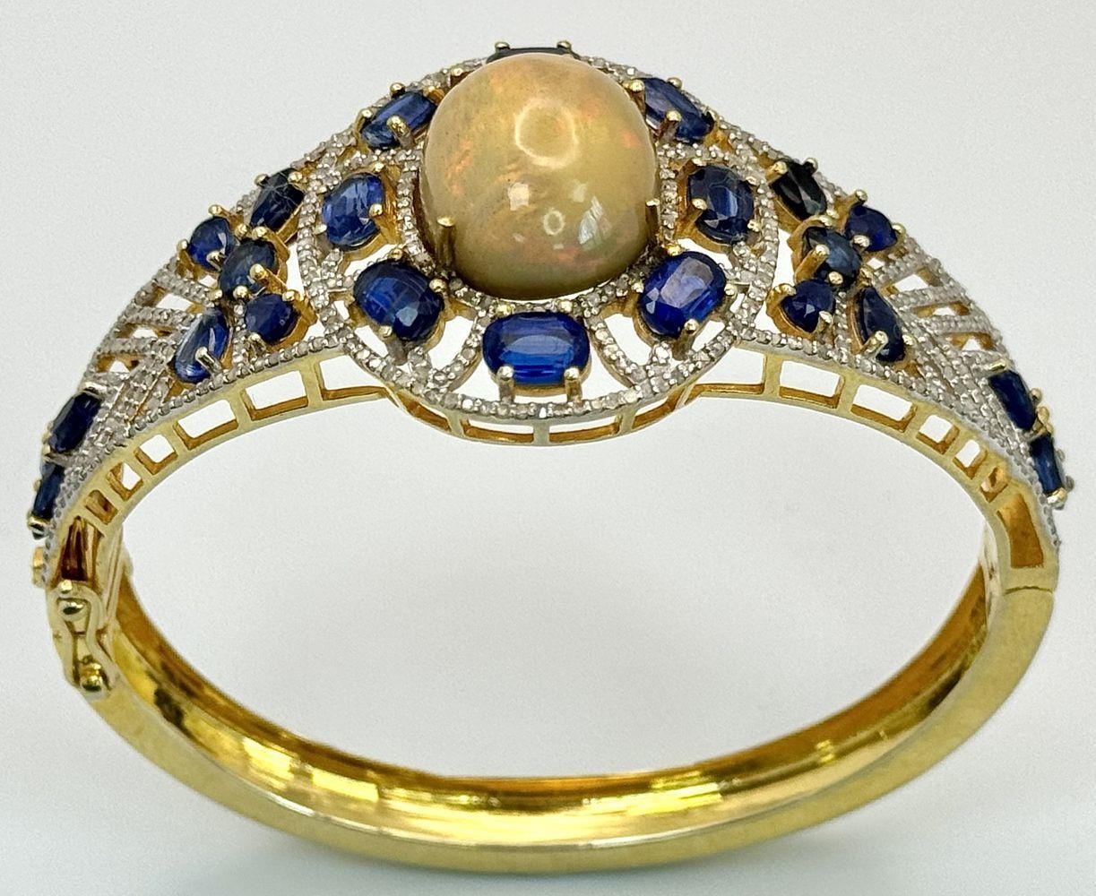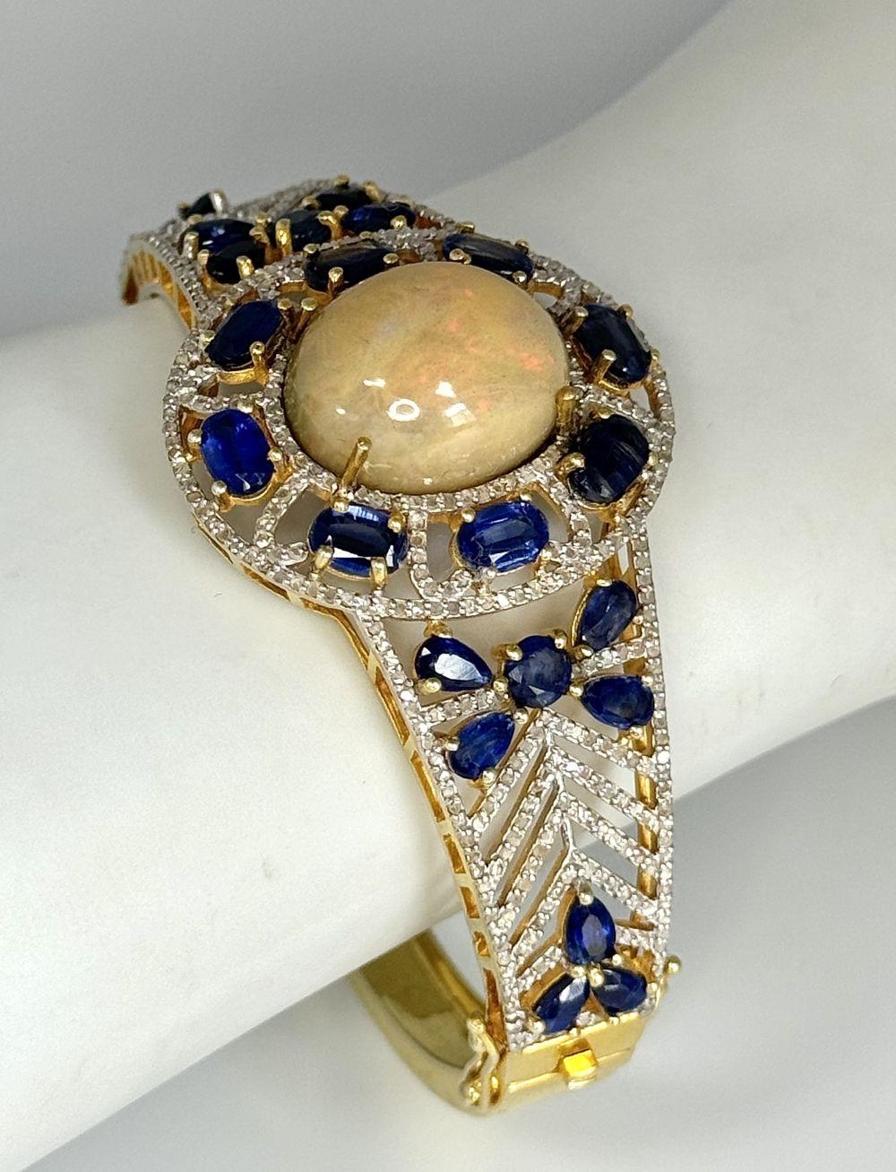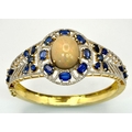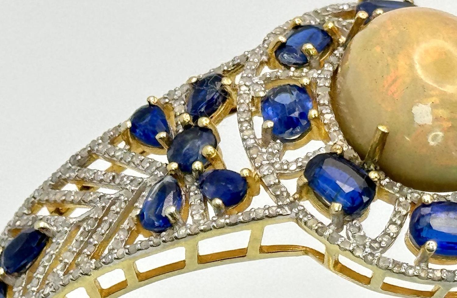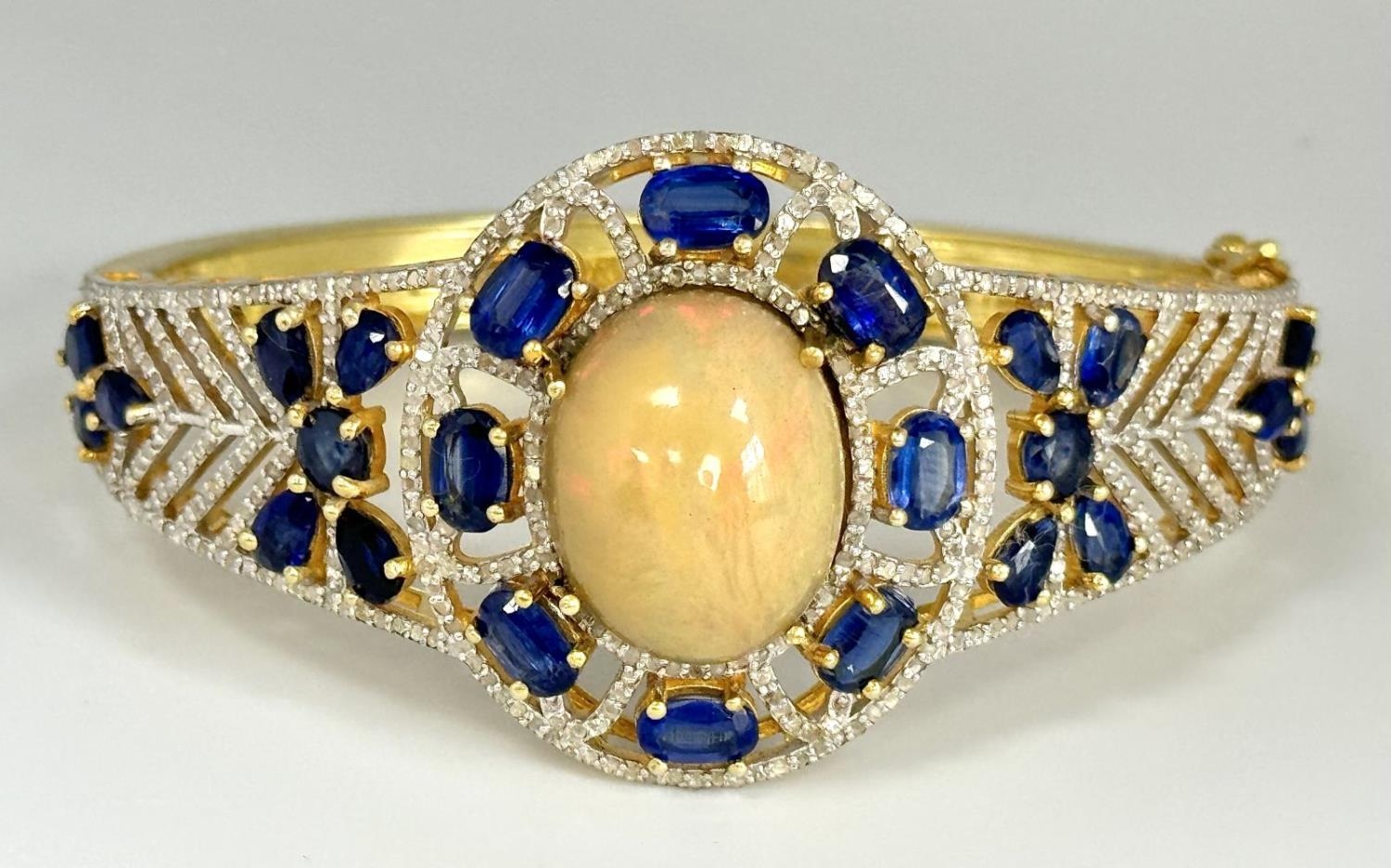 A Scintillating Ethiopian Fire Opal, Kyanite and Diamond Clasp Bangle/Bracelet. A 10ct fire opal cabochon surrounded by a web of diamonds and orbiting kyanites. Chevron and floral form shoulders. Set in gilded 925 Silver. Kyanite - 12ctw. CD-1496