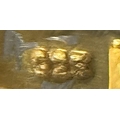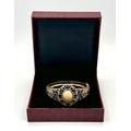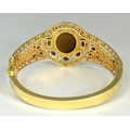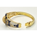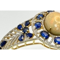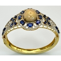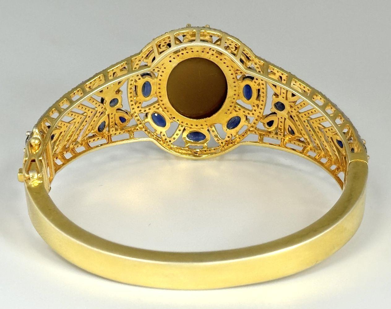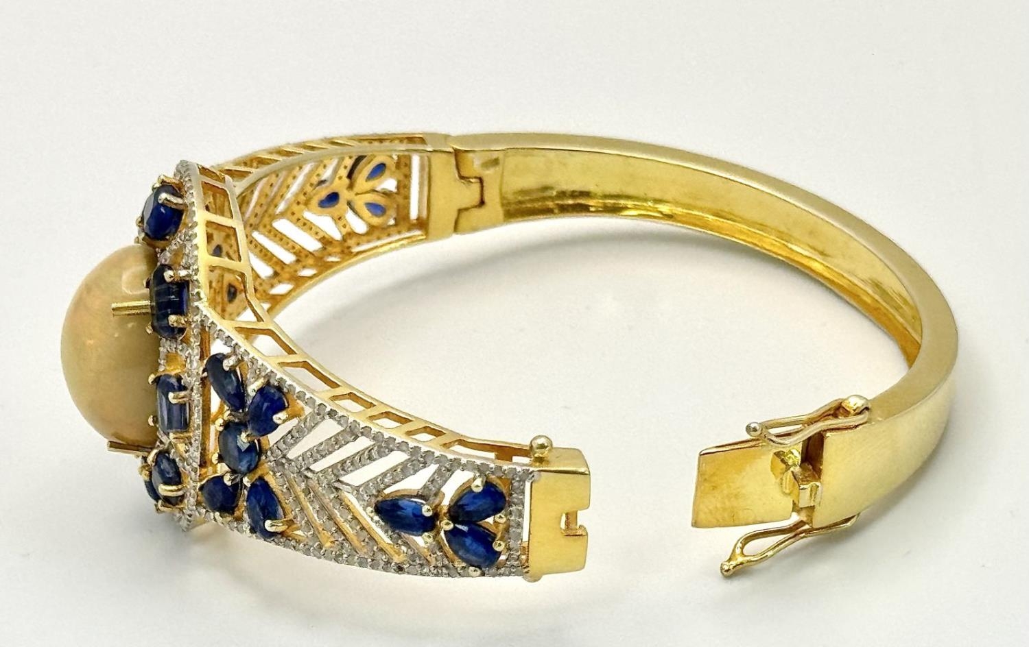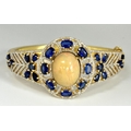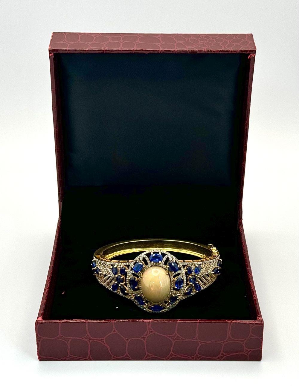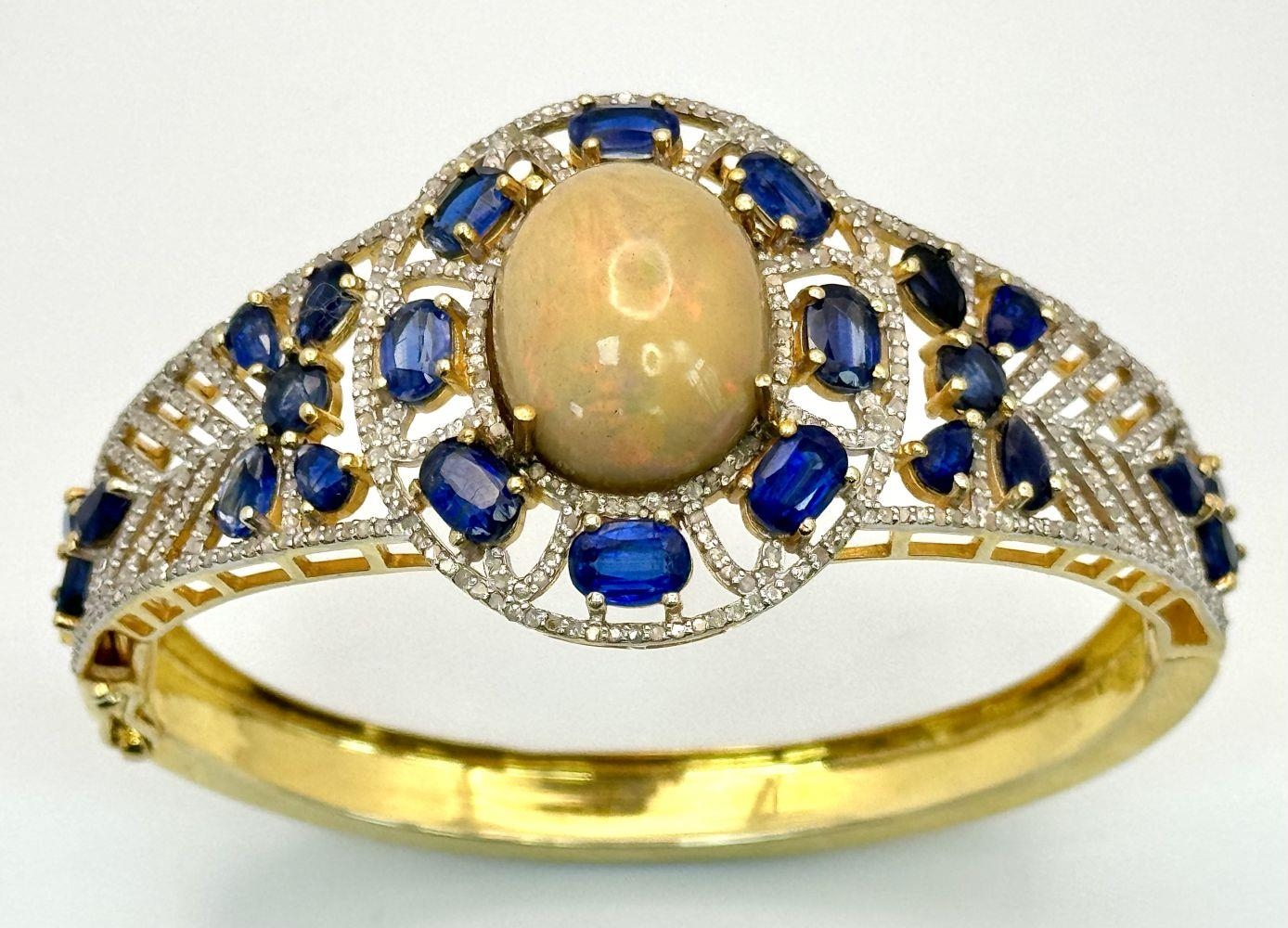 A Scintillating Ethiopian Fire Opal, Kyanite and Diamond Clasp Bangle/Bracelet. A 10ct fire opal cabochon surrounded by a web of diamonds and orbiting kyanites. Chevron and floral form shoulders. Set in gilded 925 Silver. Kyanite - 12ctw. CD-1496