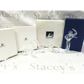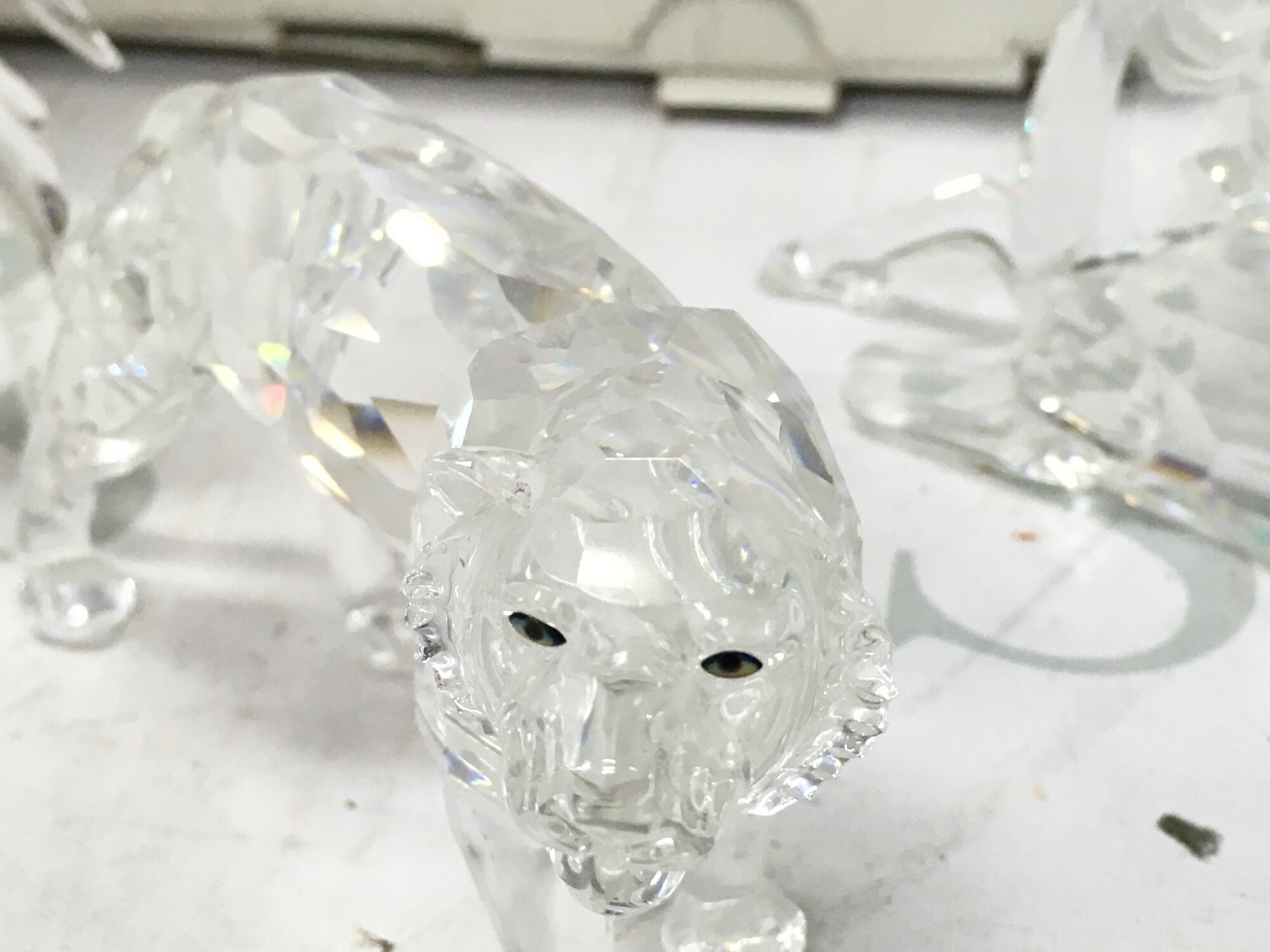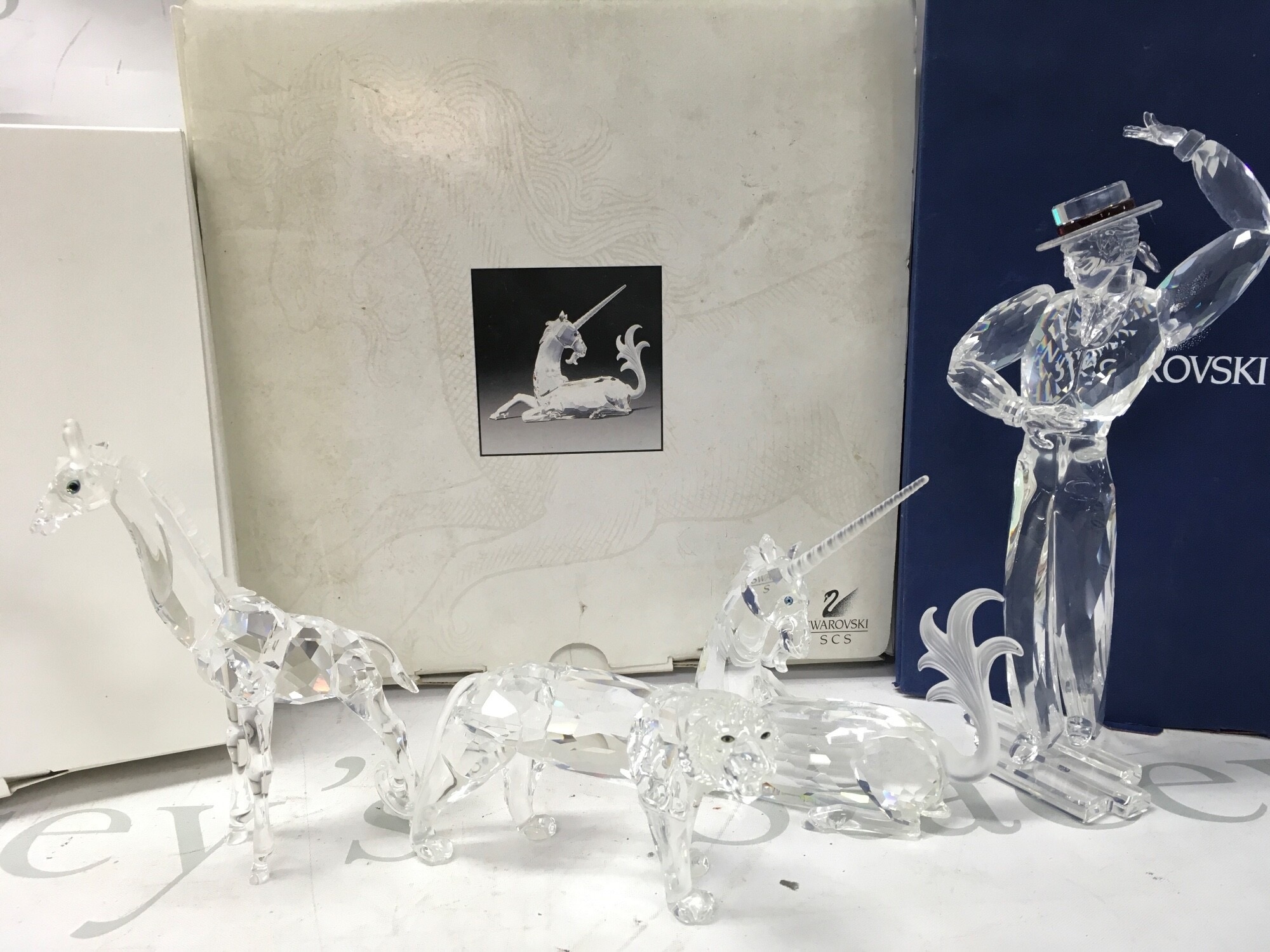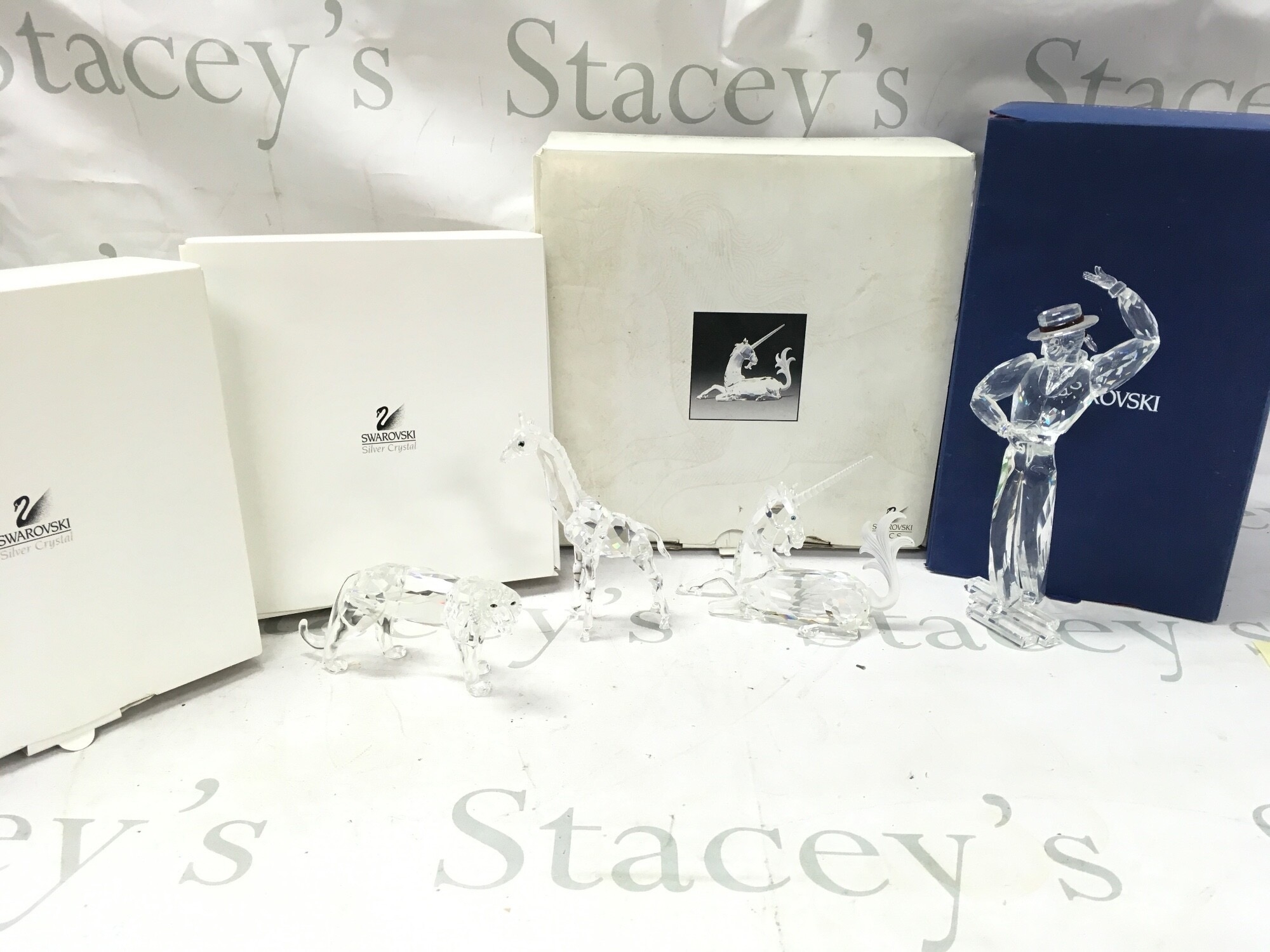 Four boxed Swarovski crystal glass figures including 2003 SCS Annual Edition "Antonio" from the "Magic of Dance" trilogy., baby giraffe, the unicorn , tiger