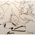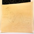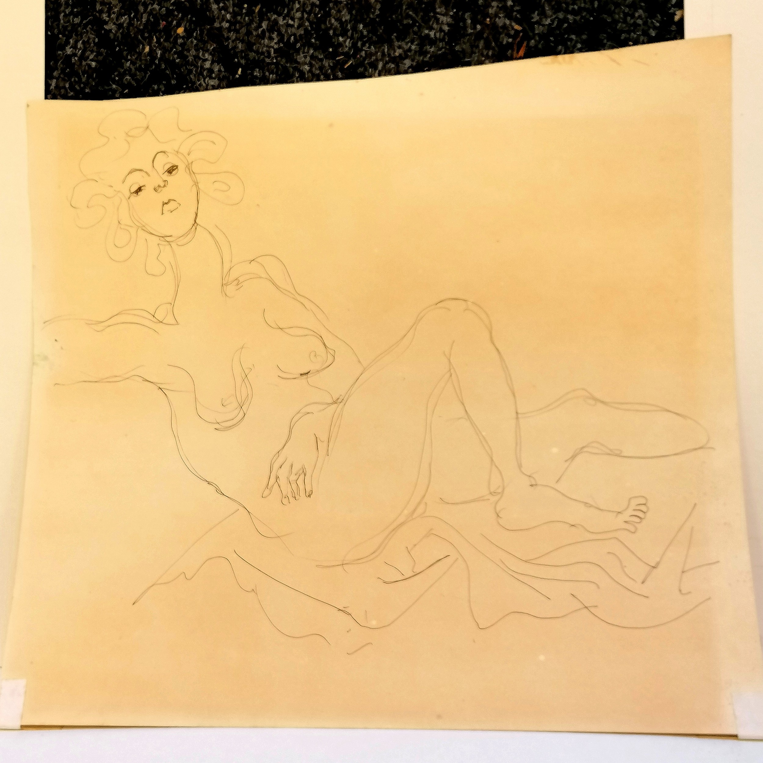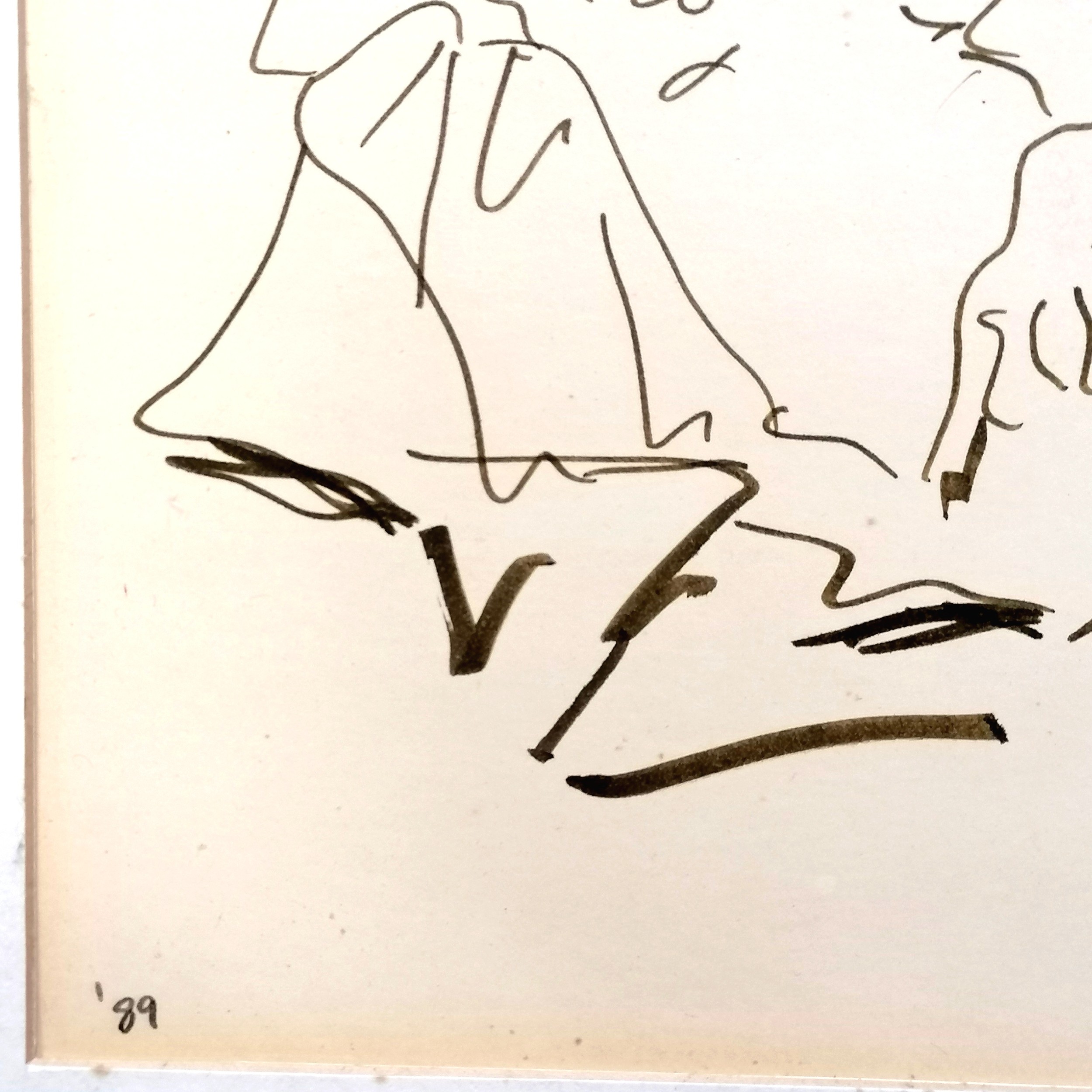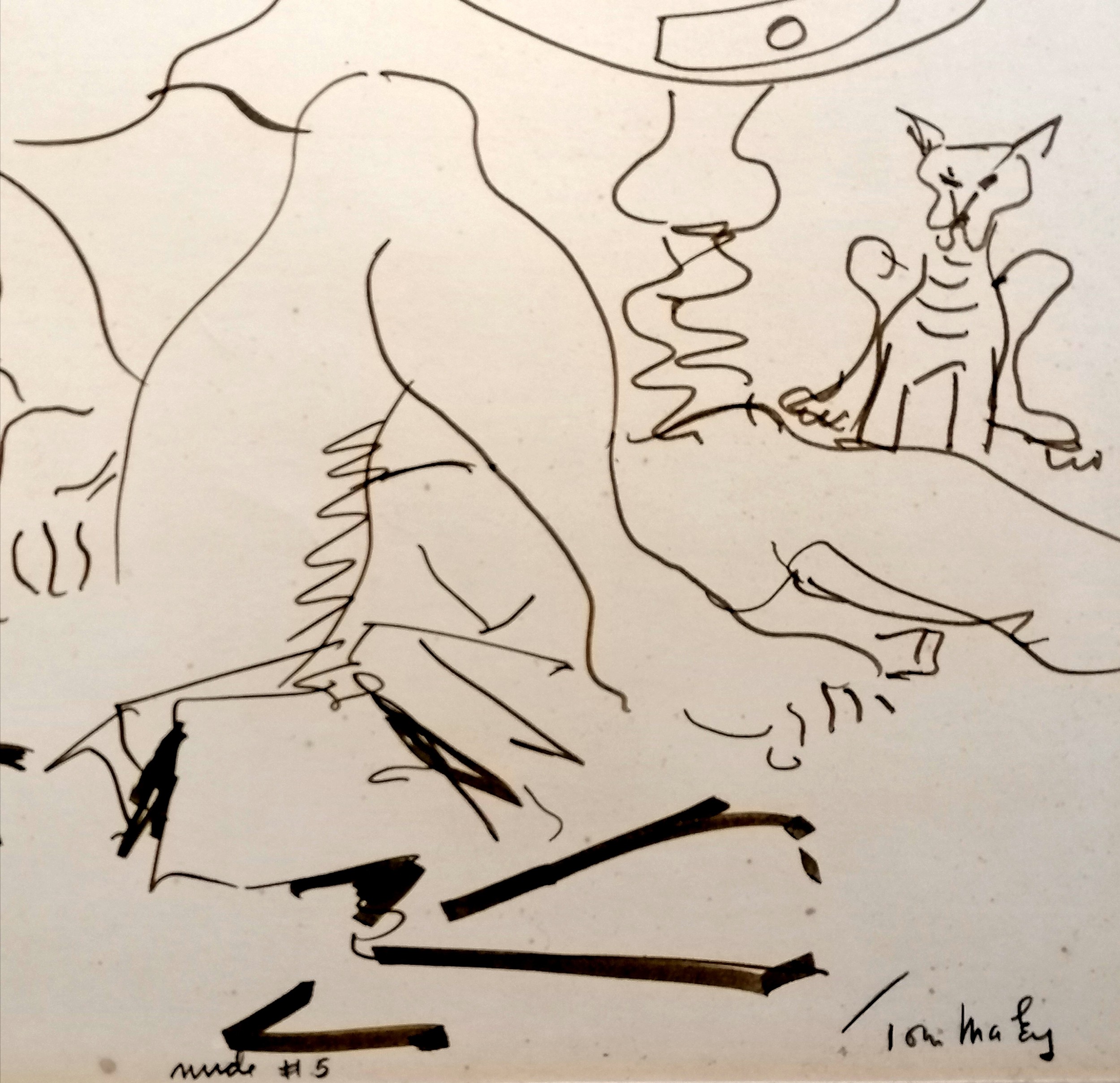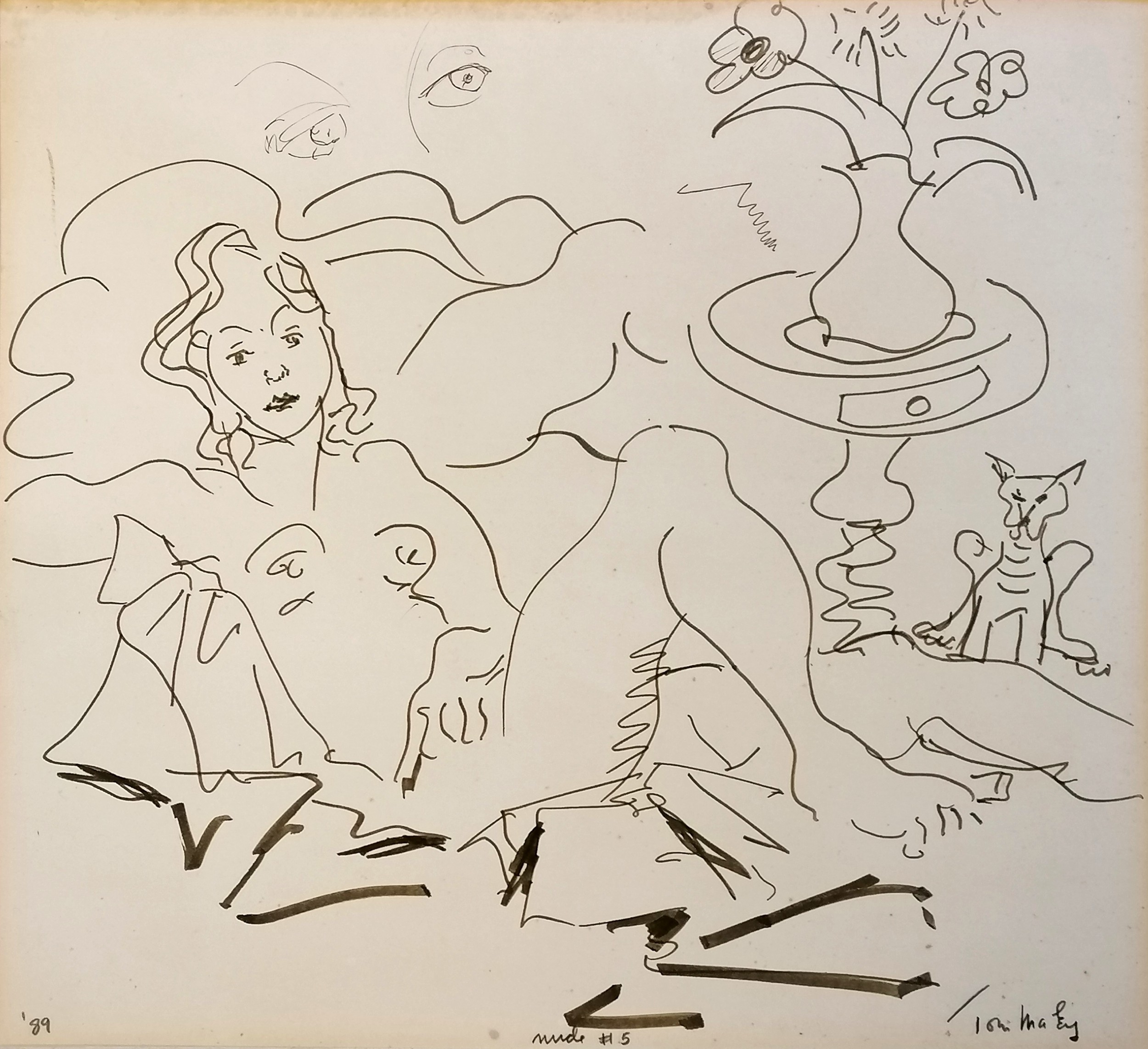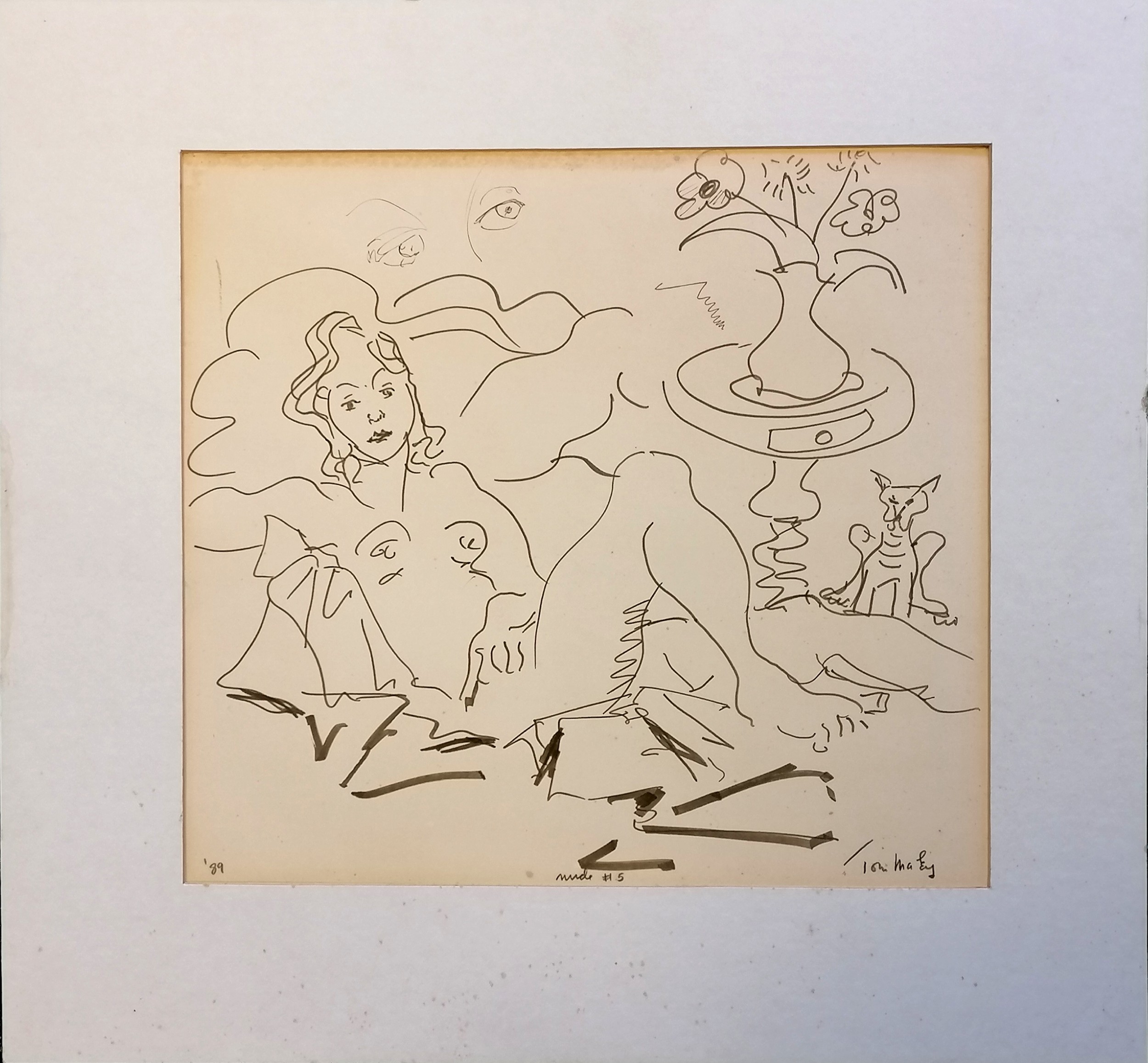 Tom Maley (?) original pen & ink drawing of a nude lady 'Nude #5' dated 1989 - mount 45cm x 48cm ~ has sketch to reverse of picture