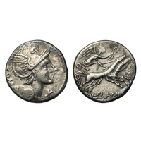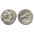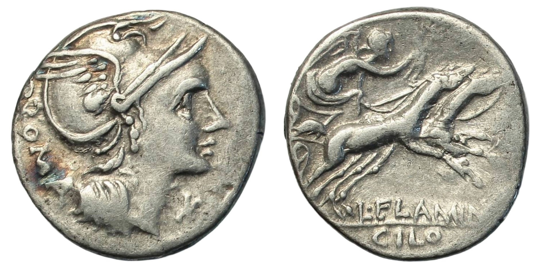 † Roman Republic, L. Flaminius Chilo (109-108 BC) Denarius Rome mint, helmeted head of Roma right, X (mark of value) below chin, Roma behind, rev. Victory, holding wreath and reins, driving galloping biga right, 3.82g, (Crawford 302/1, Sydenham 540, Flaminia 1, RBW 1144). Nicely toned, very fine
