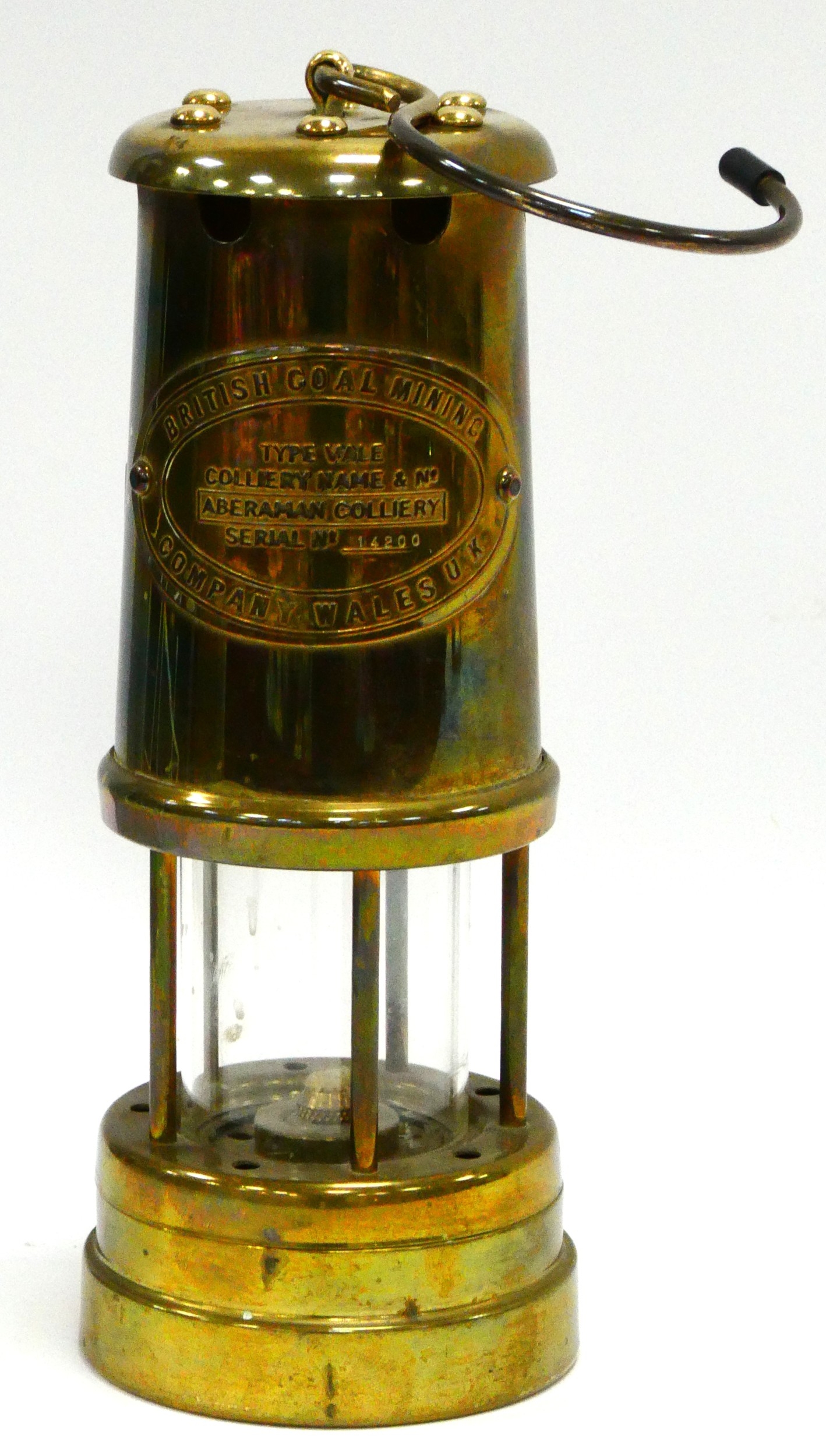 A Brass Miners Lamp Stamped British Coal Mining Company Wales - Aberaman Colliery, 22cm tall with handle down.