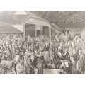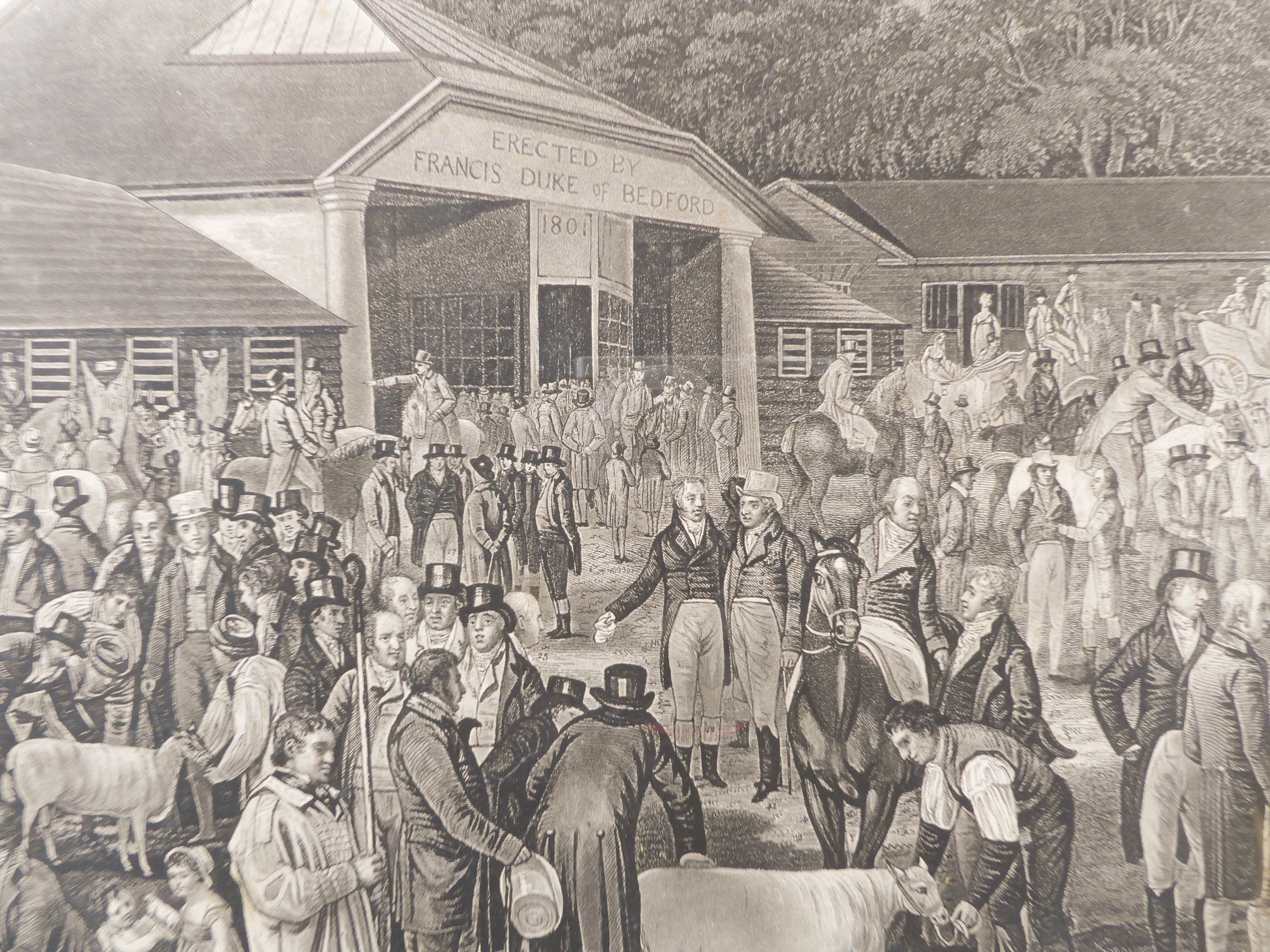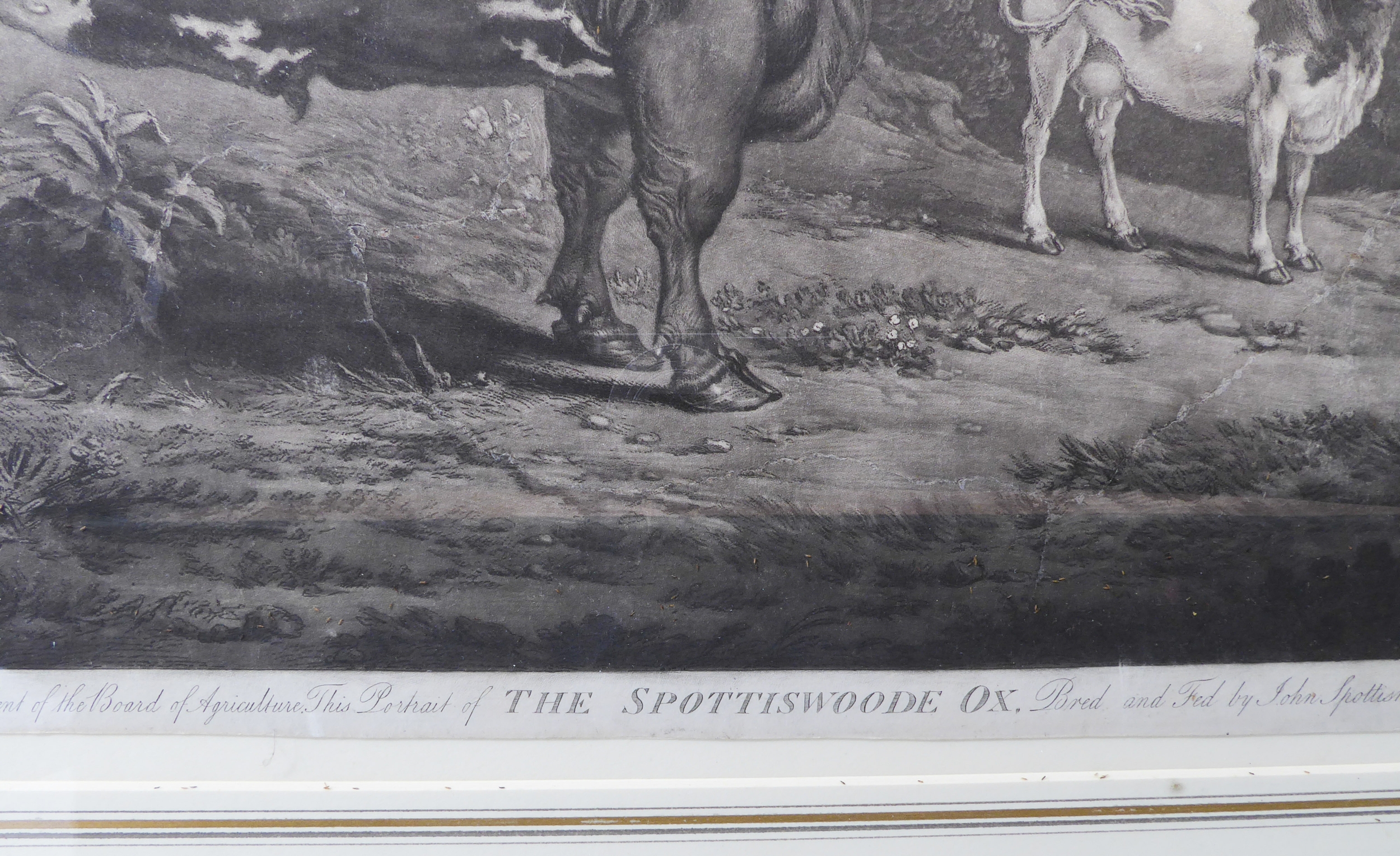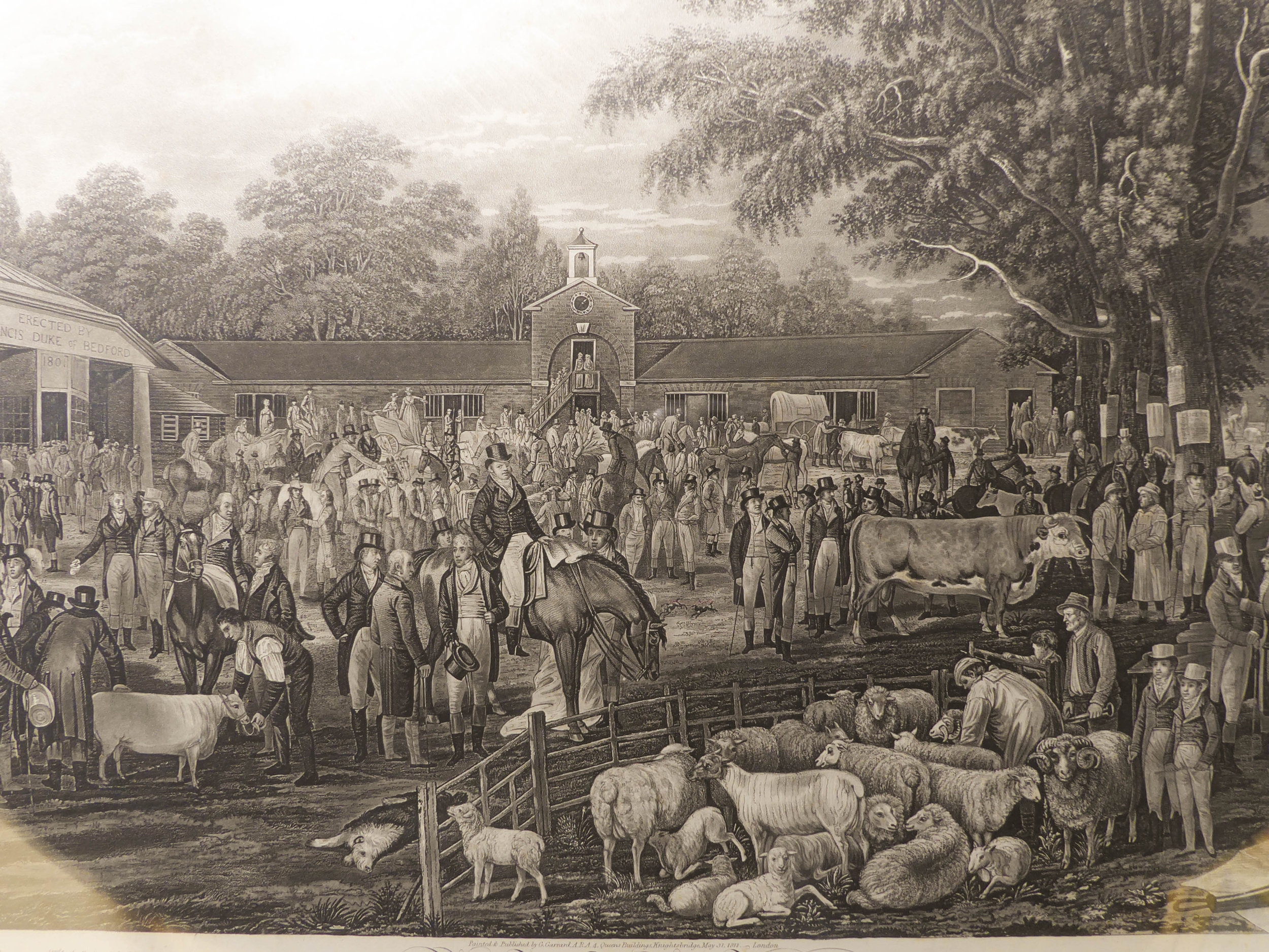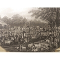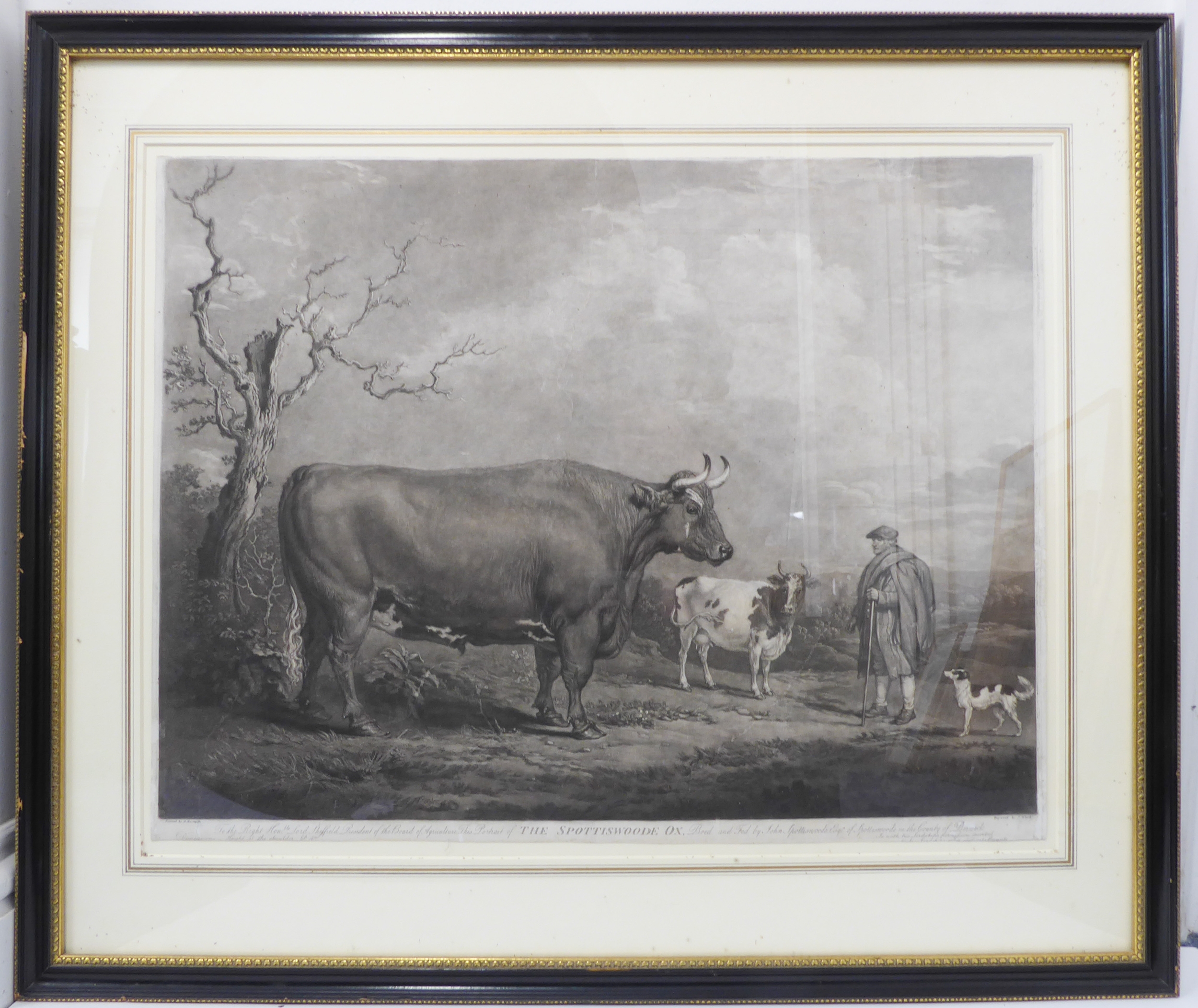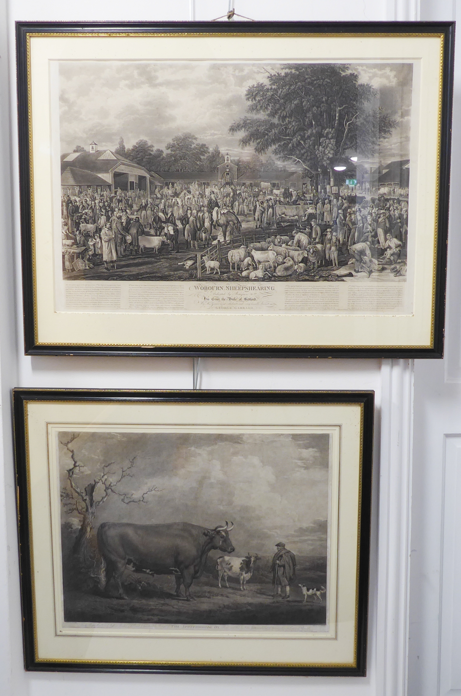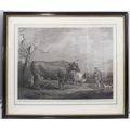 JAMES WARD RA after ALEXANDER NASMYTH - 'The Spottiswoode Ox', mezzotint on wove paper (plate size 17¾ x 23¾in; 45 x 60.5cm). Numerous repairs and margins reduced, also 'Woburn Sheep Shearing' after GEORGE GARRARD ARA, stipple engraving and etching, Publ. by G Garrard, London 1811 (plate size 17¾ x 29¼in;45.5 x 74.5cm). Some foxing in the sky (2)
