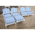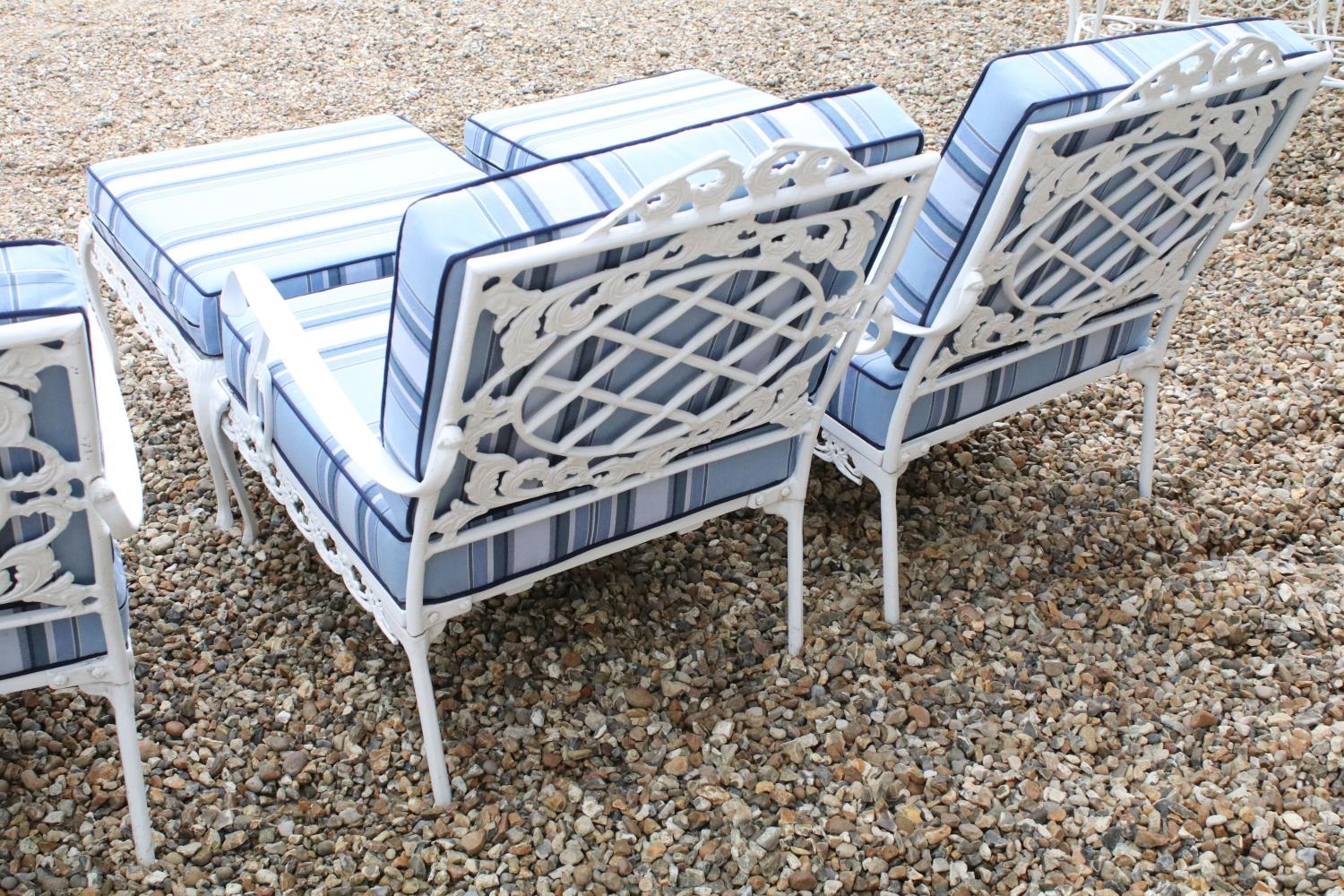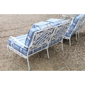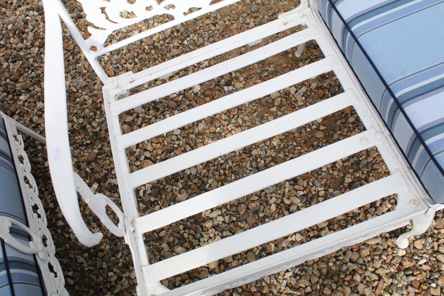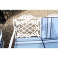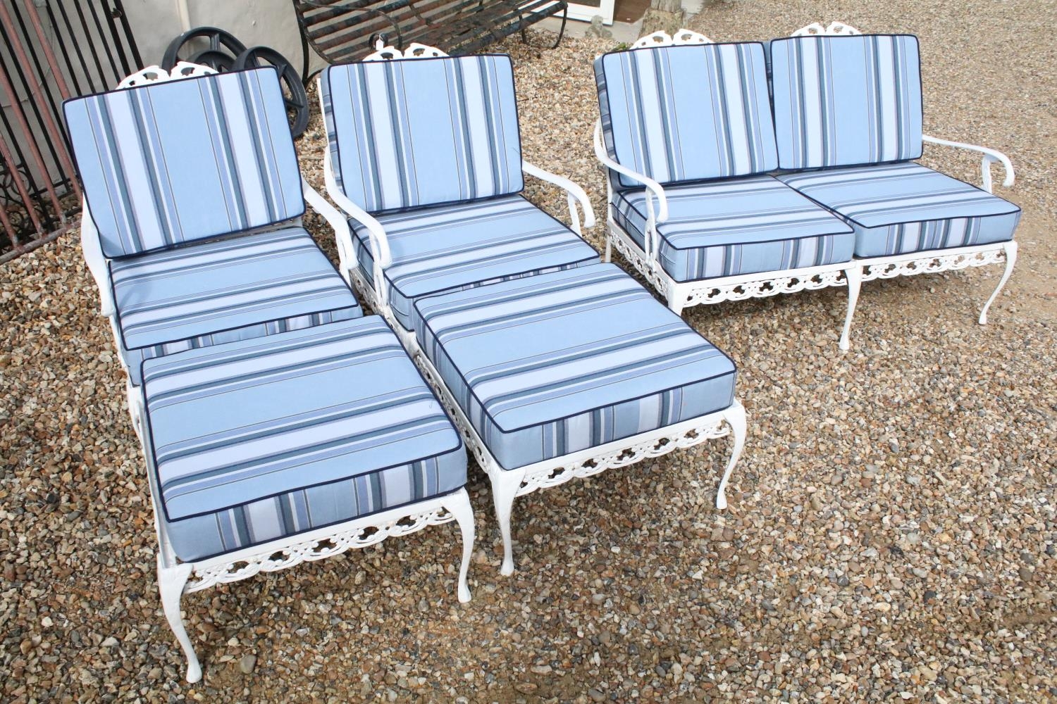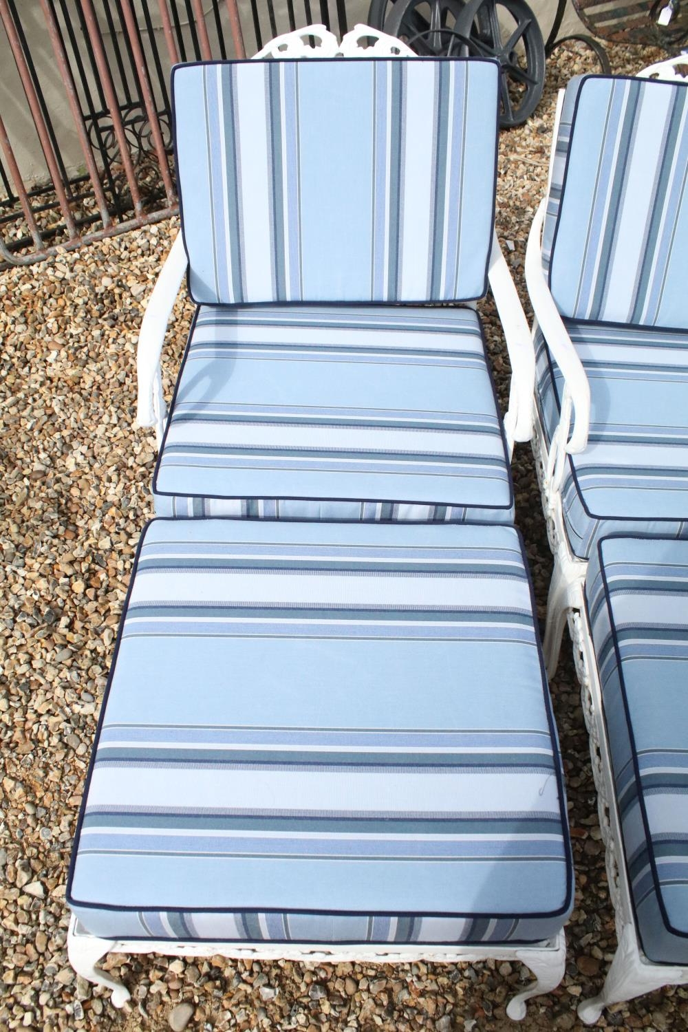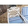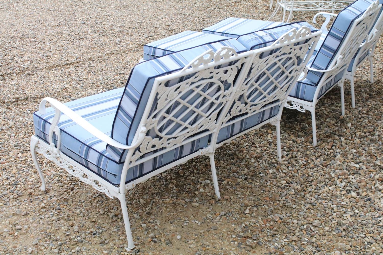 White painted cast metal garden / patio sun lounger set comprising a twin seat (approx 123cm wide) and two single seats, with two leg rests, complete with cushions, the chairs with acanthus leaf detail