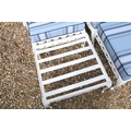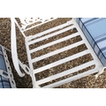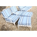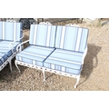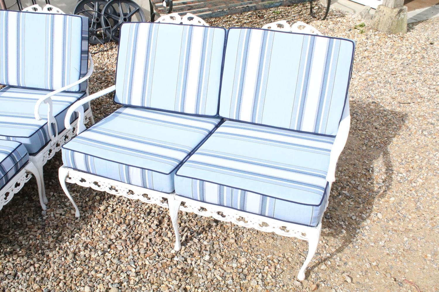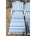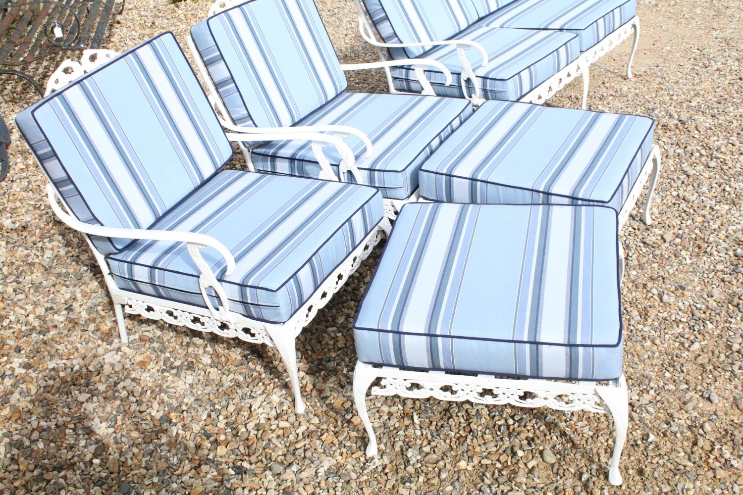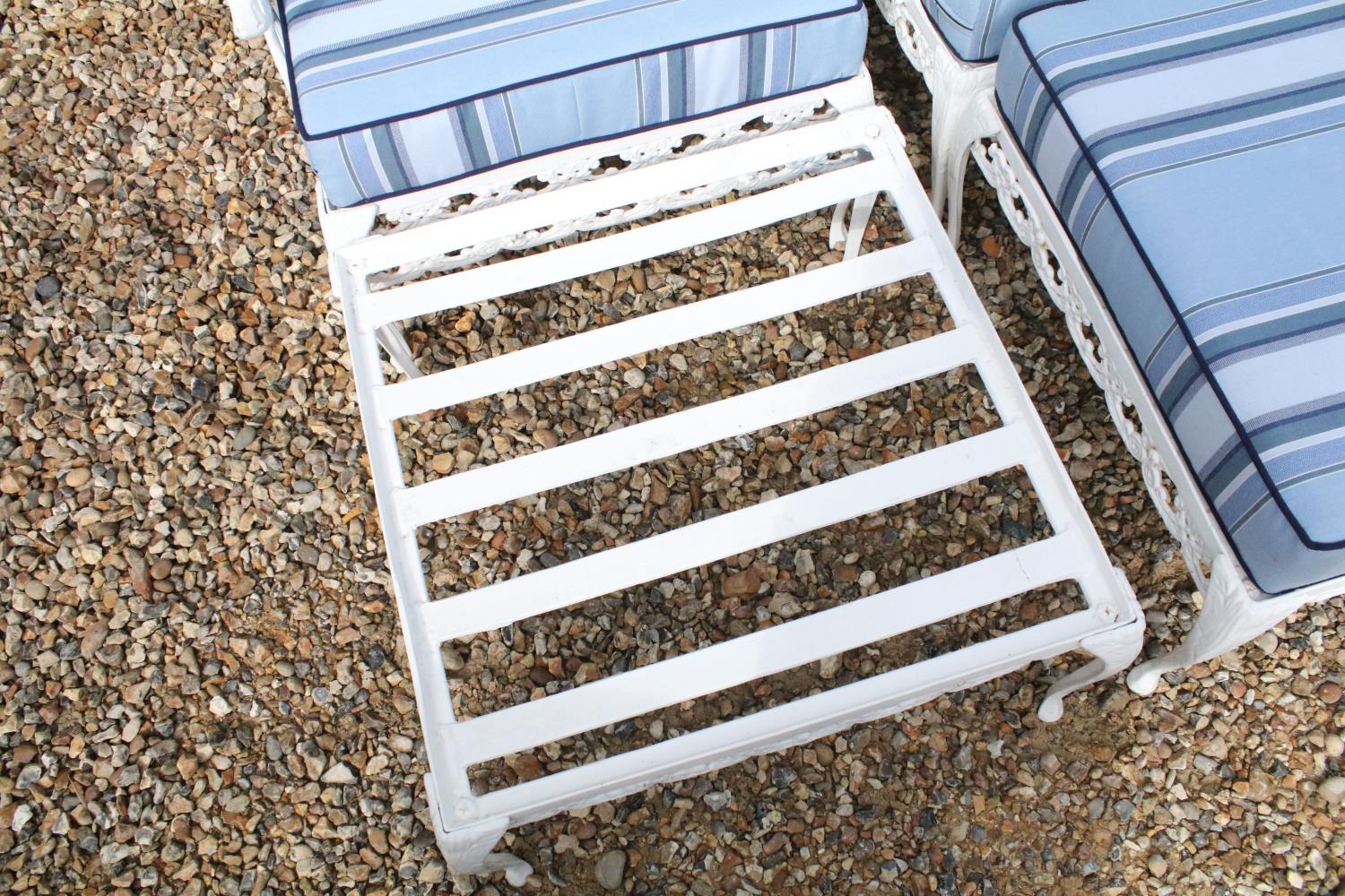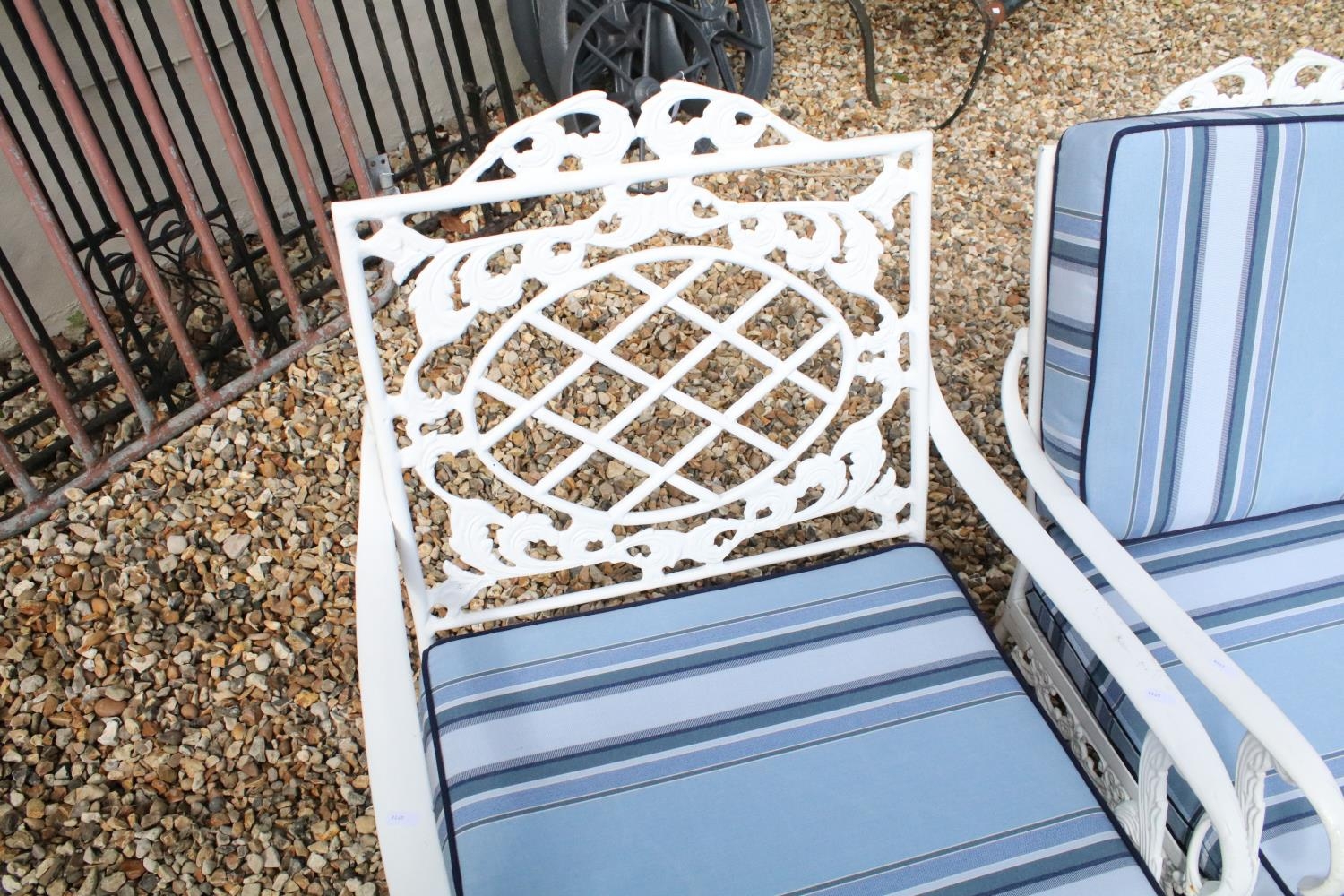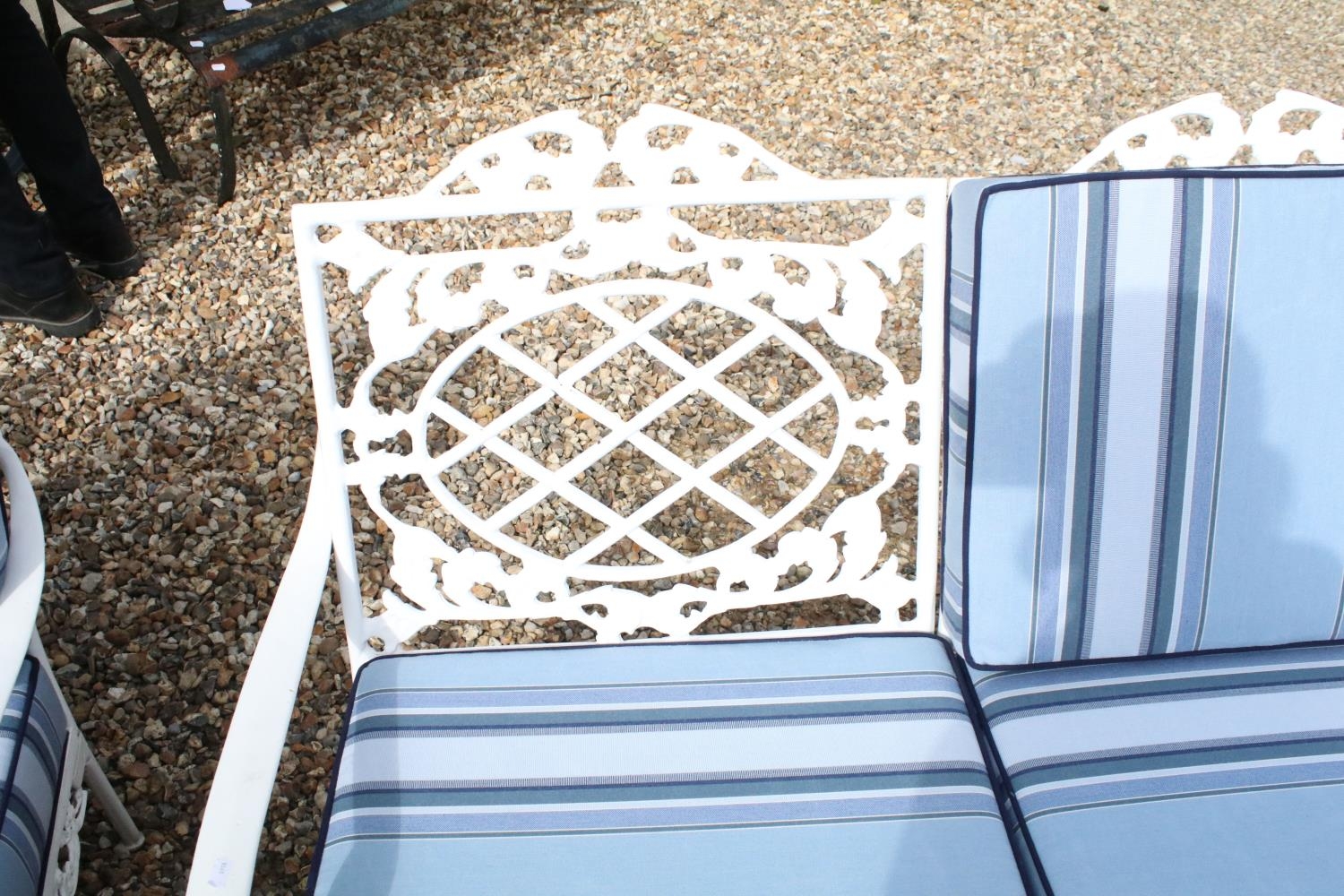 White painted cast metal garden / patio sun lounger set comprising a twin seat (approx 123cm wide) and two single seats, with two leg rests, complete with cushions, the chairs with acanthus leaf detail