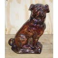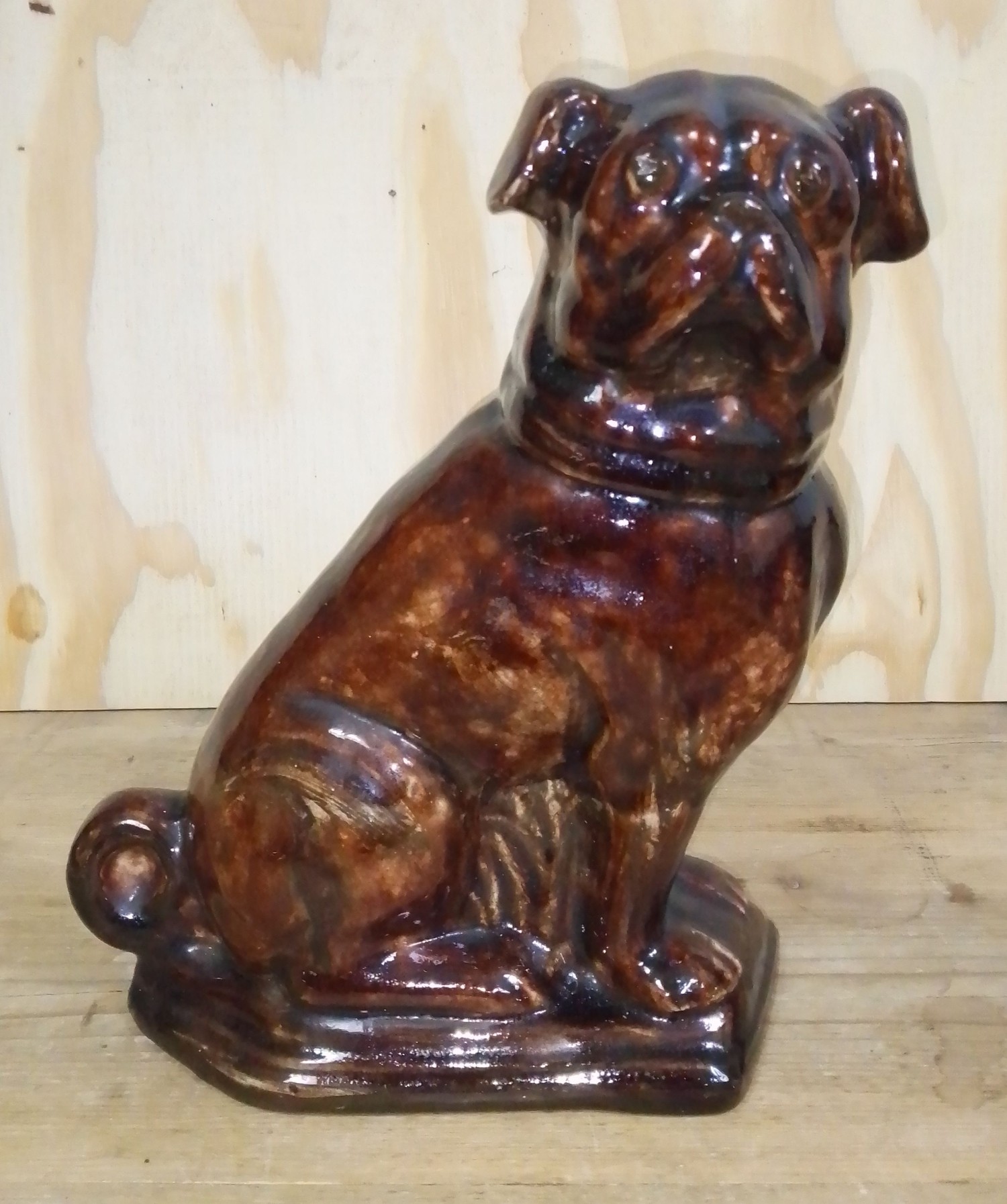 A brown pug door stop by inscribed 'The Mad Potter Wales', height 19cm.
