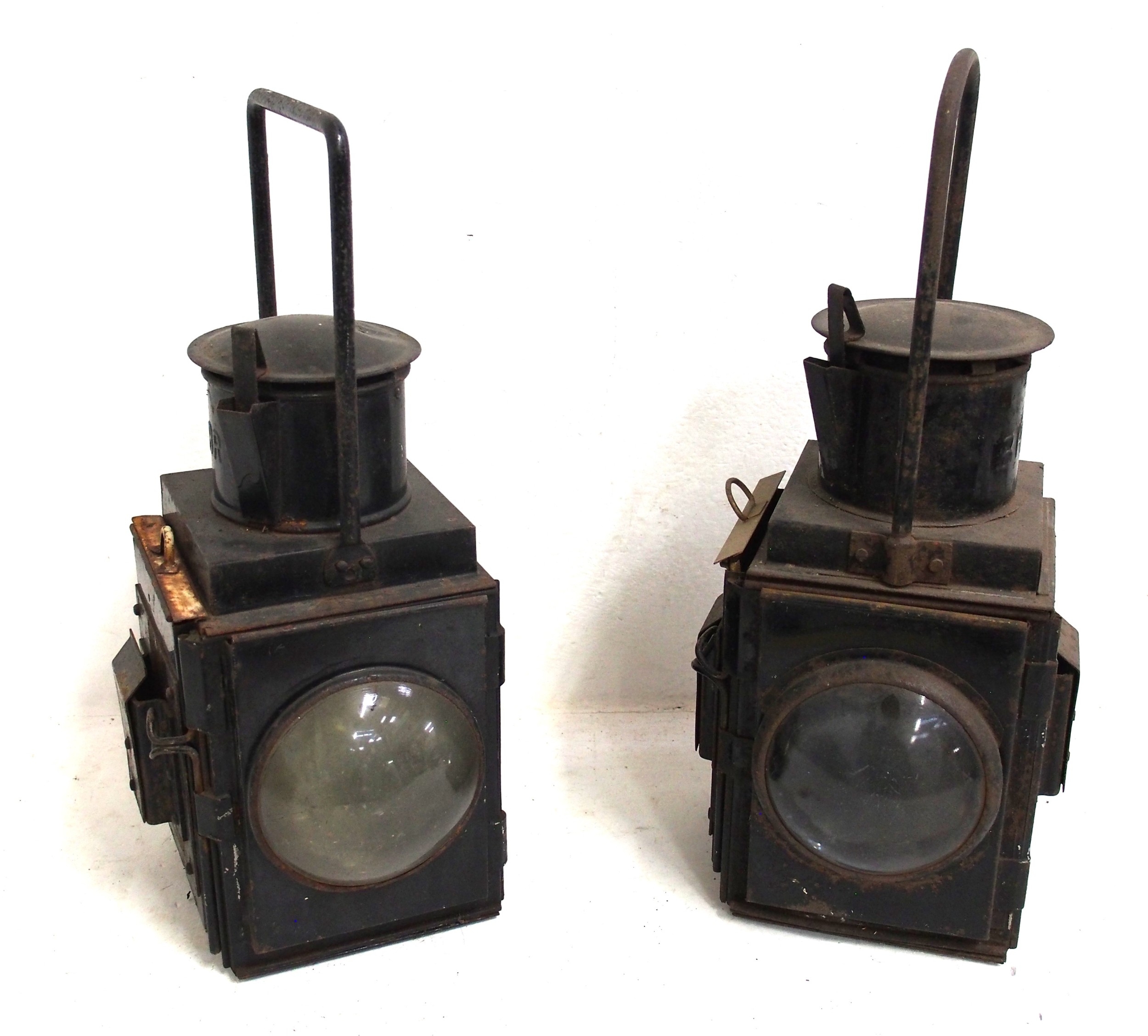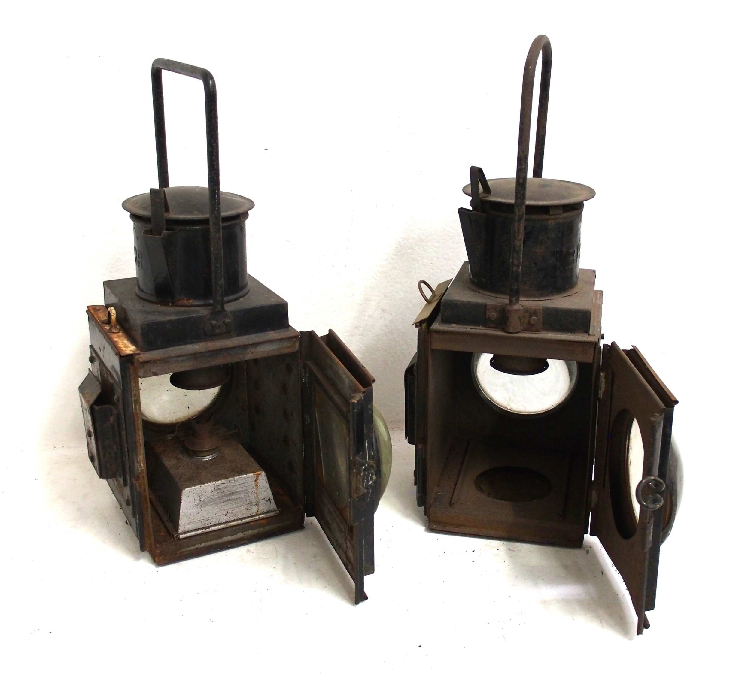 BR & BR(W) (embossed) Guard's Van side lamps, both complete with red shades one missing reservoir, both good solid ex service condition. (2) (A3) (Dispatch by Mailboxes/Collect from Banbury Depot)