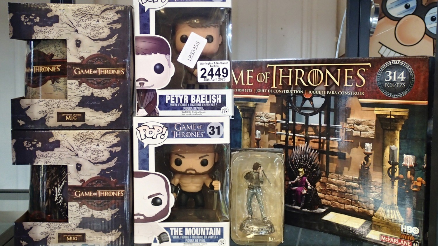 Game of Thrones: two Funko Pops (The Mountain and Petyr Baelish), McFarlane Iron Throne construction set, two mugs and a figurine of Arya, all boxed. UK P&P Group 2 (£24+VAT for the first lot and £5+VAT for subsequent lots)